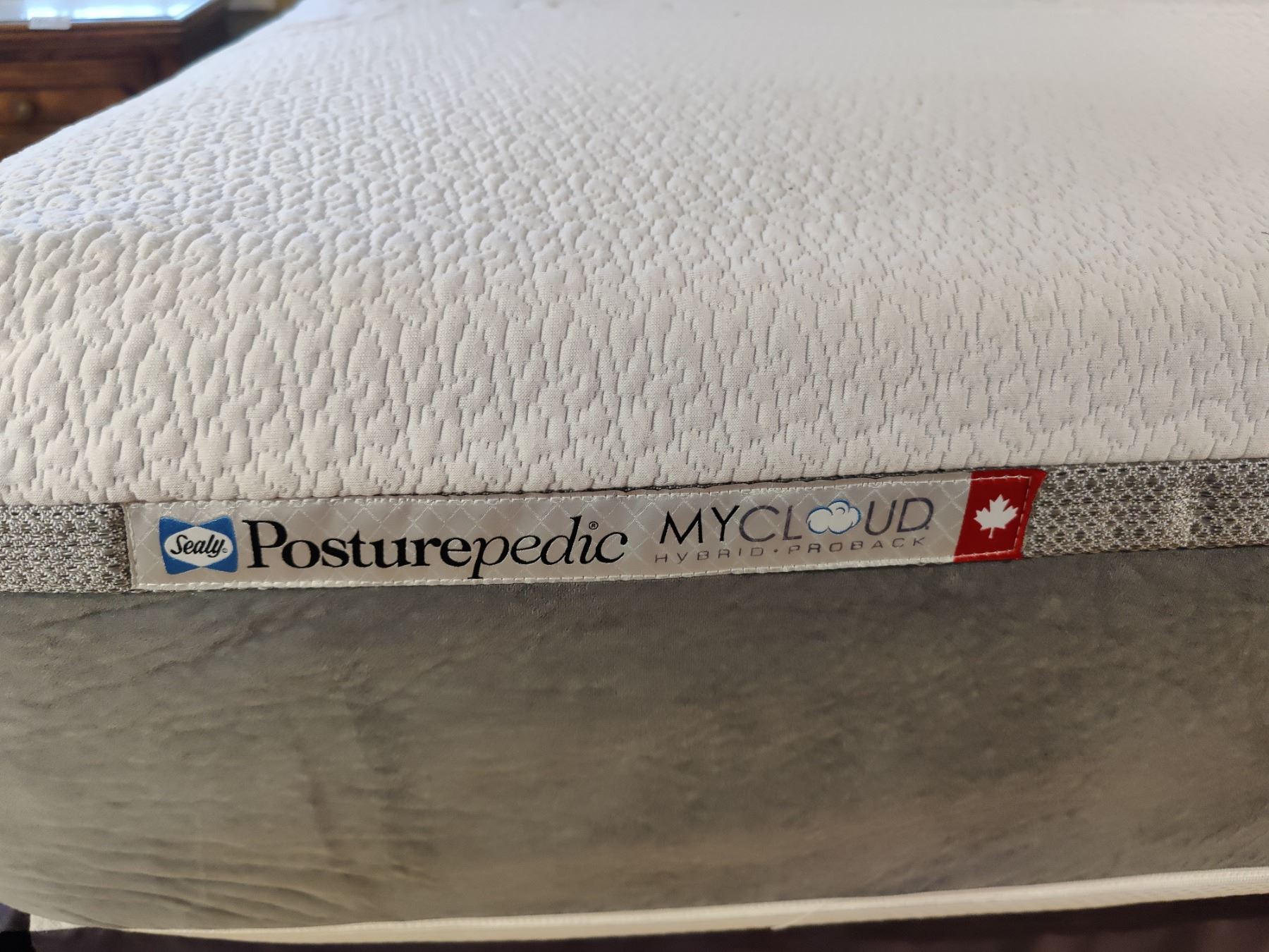 Queen Size bed with Sealy PosturePedic MyCloud Hybrid Proback memory foam mattress, box spring & beautiful wooden headboard. Excellent condition.