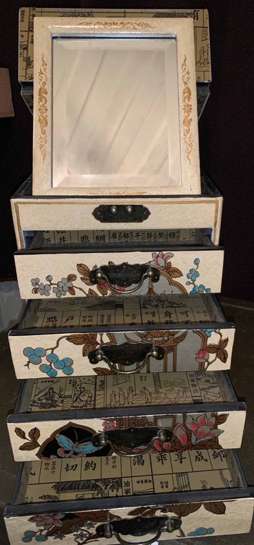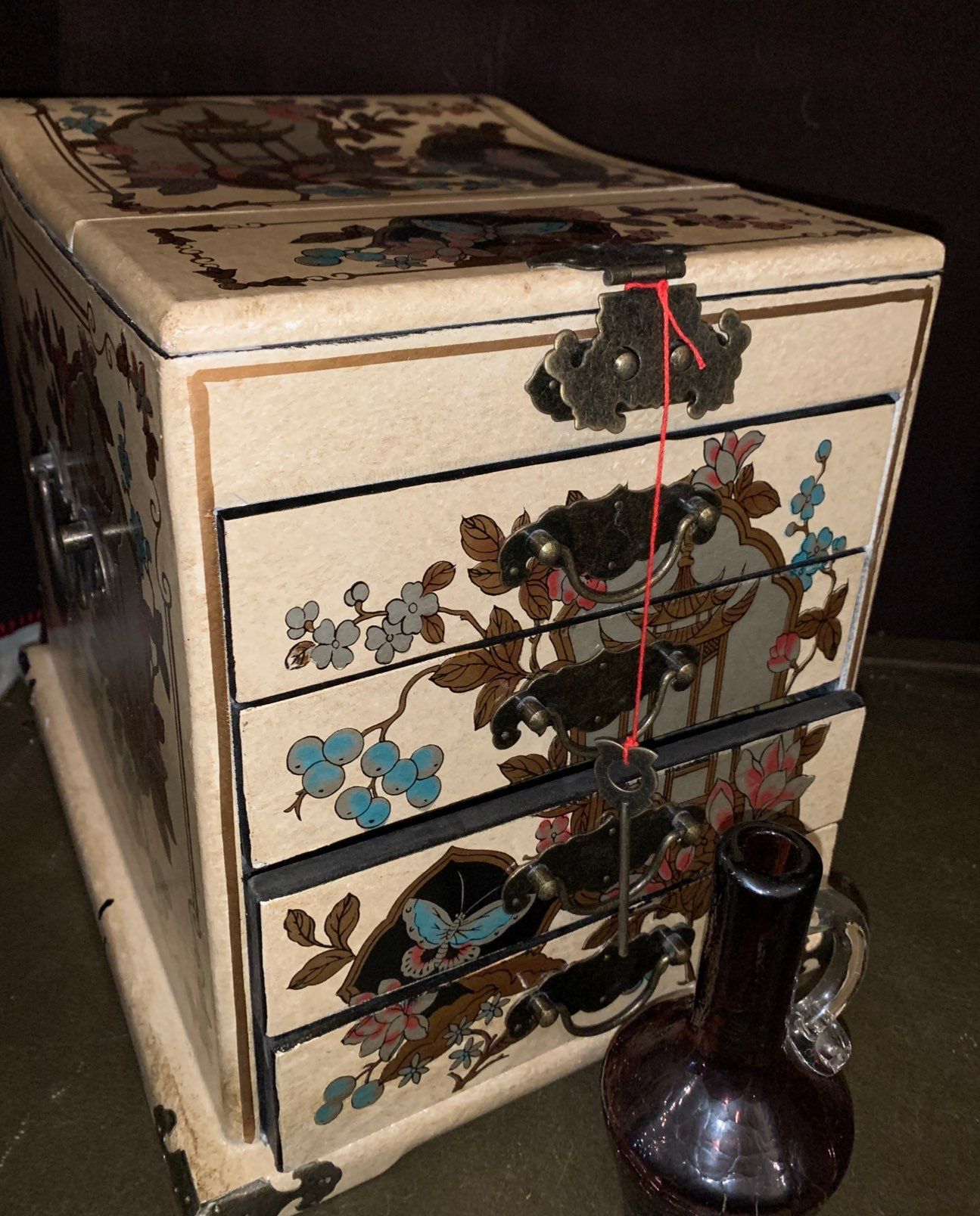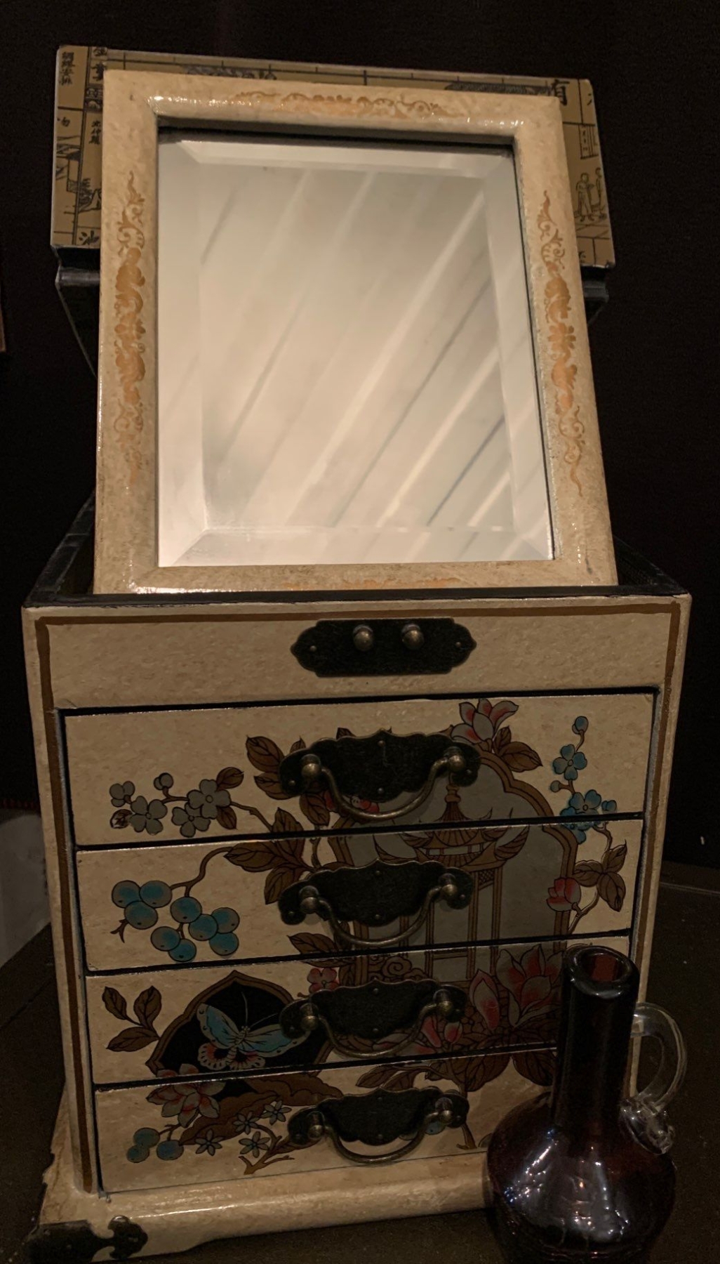 Gorgeous Wood Oriental Jewelry Box w/ Key + Swing Top Mirror (Floral Temple) Plus Vintage Dark Vase