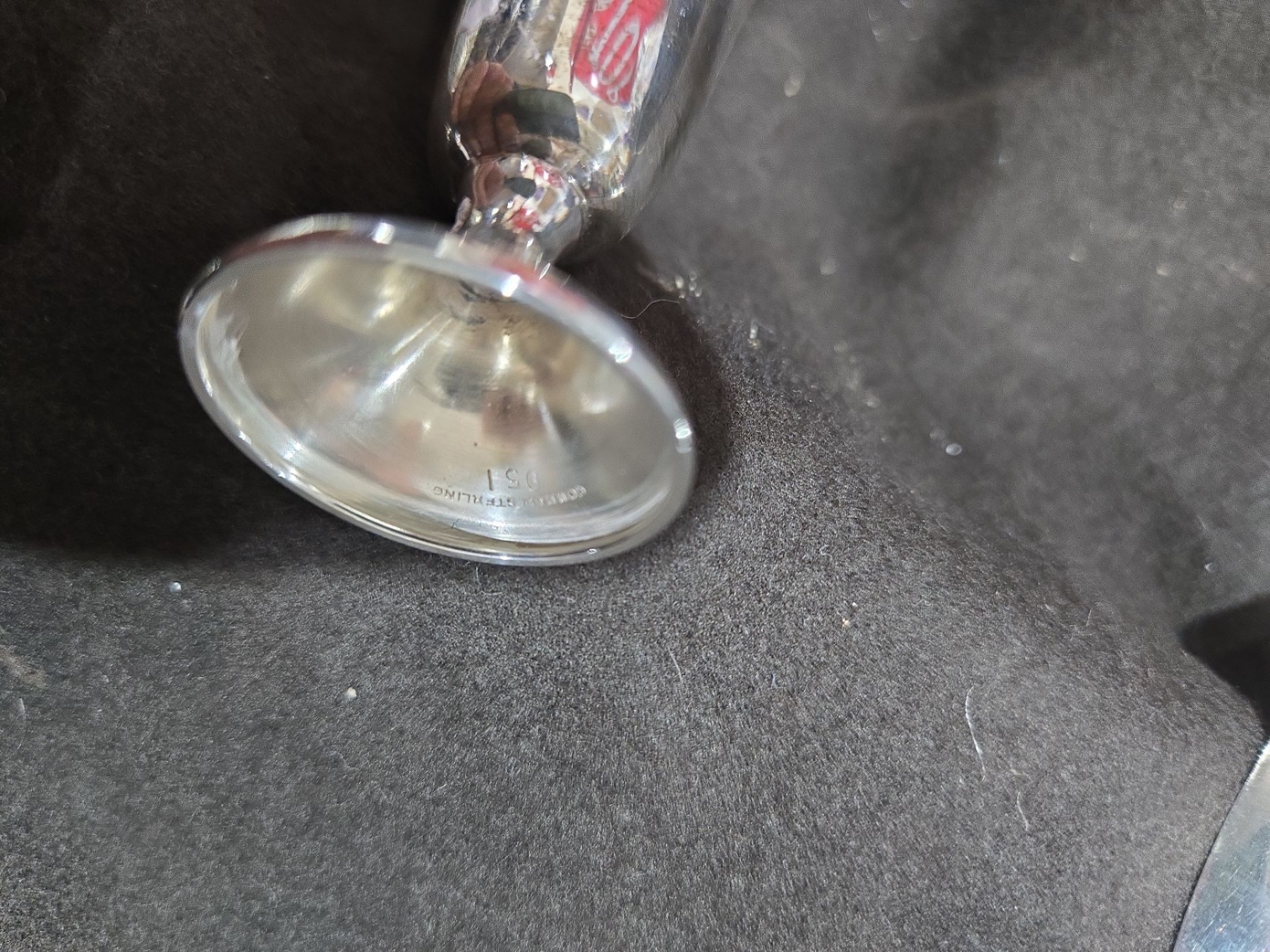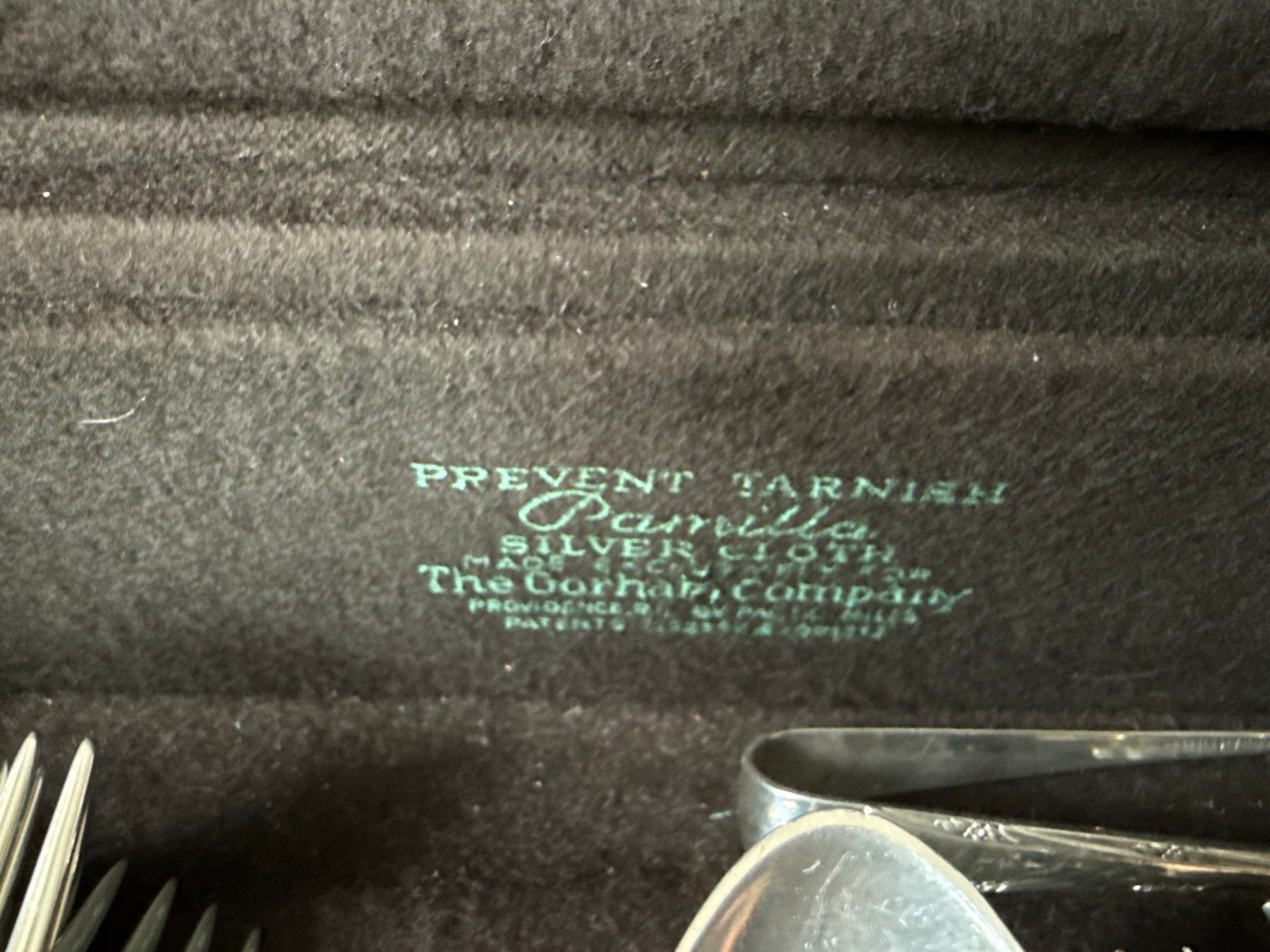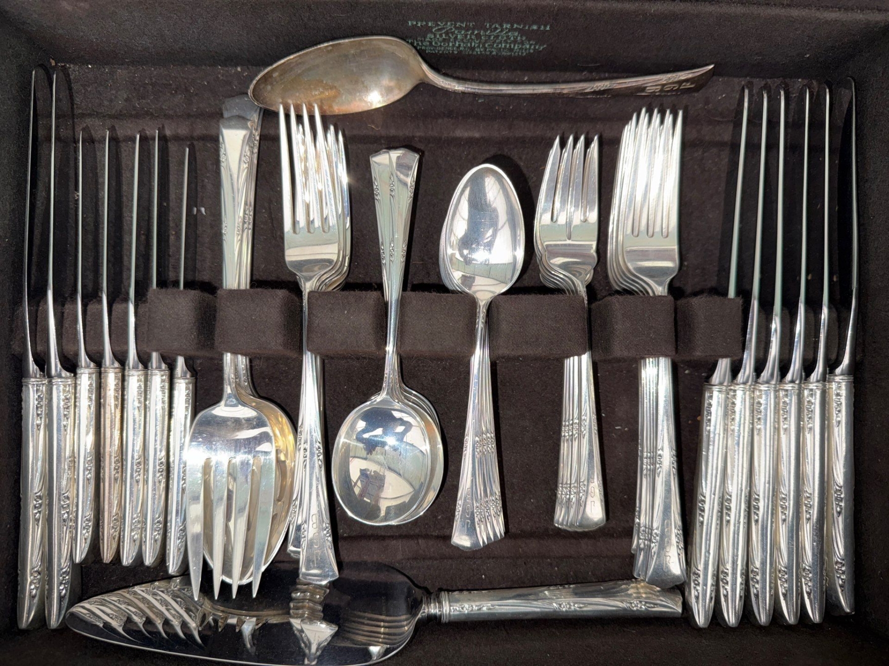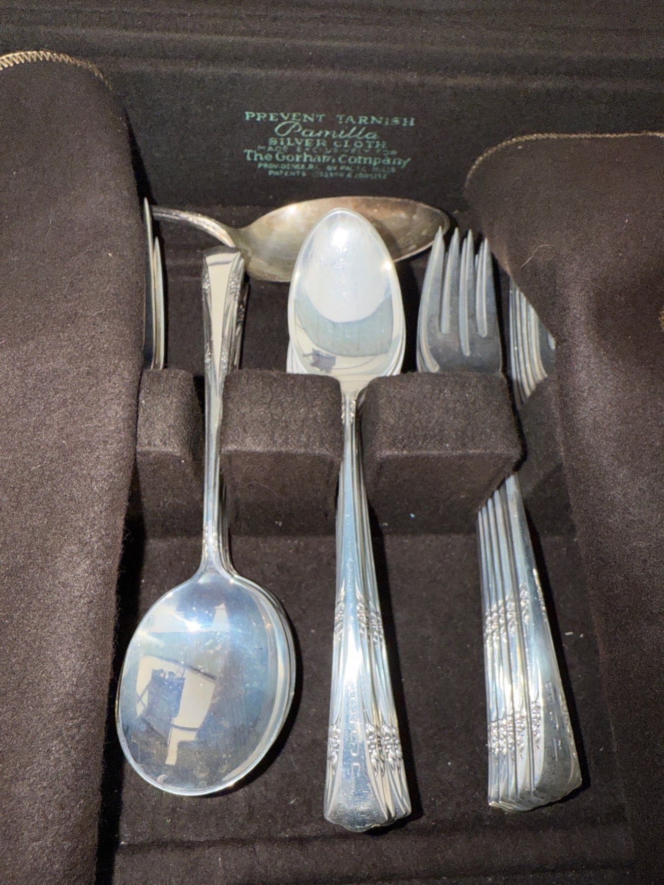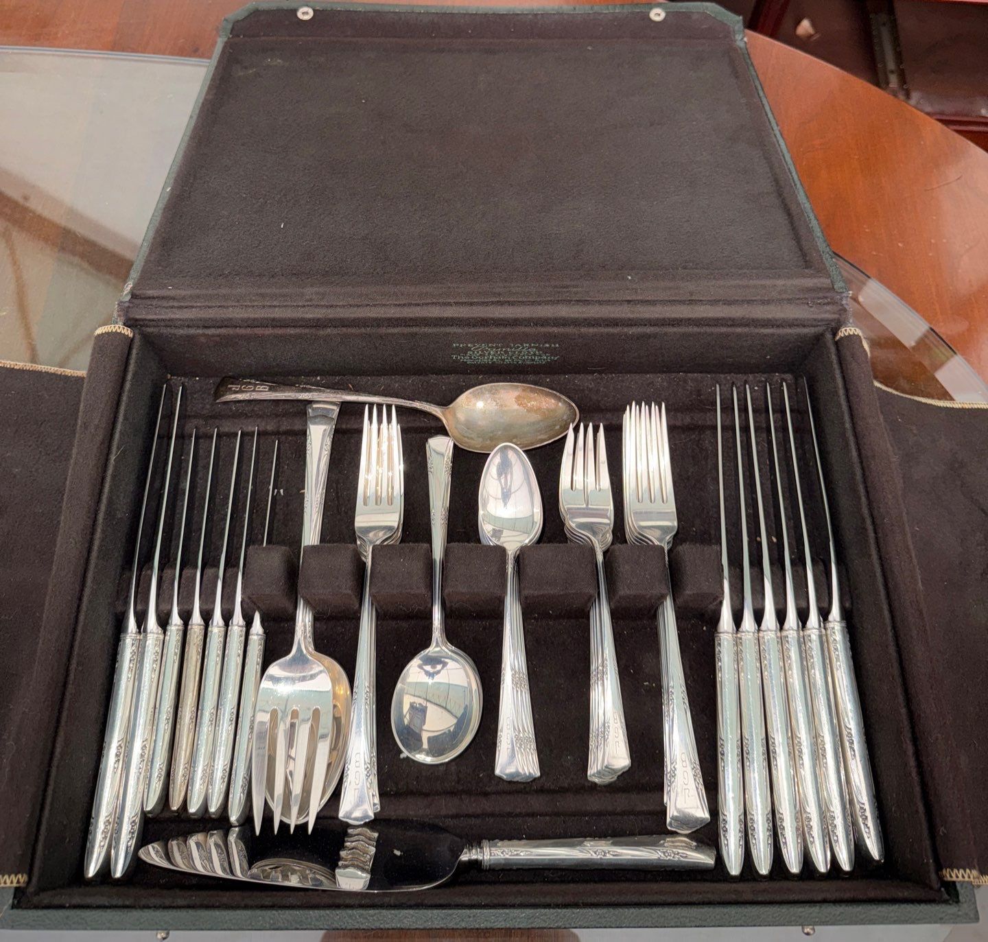 8-knives, 8-forks, 8-salad forks, 8-dessert forks, 8-soup spoons, 16-teaspoons, 4-serving spoons, 1-serving fork, 1-cake server, 4-mini goblets