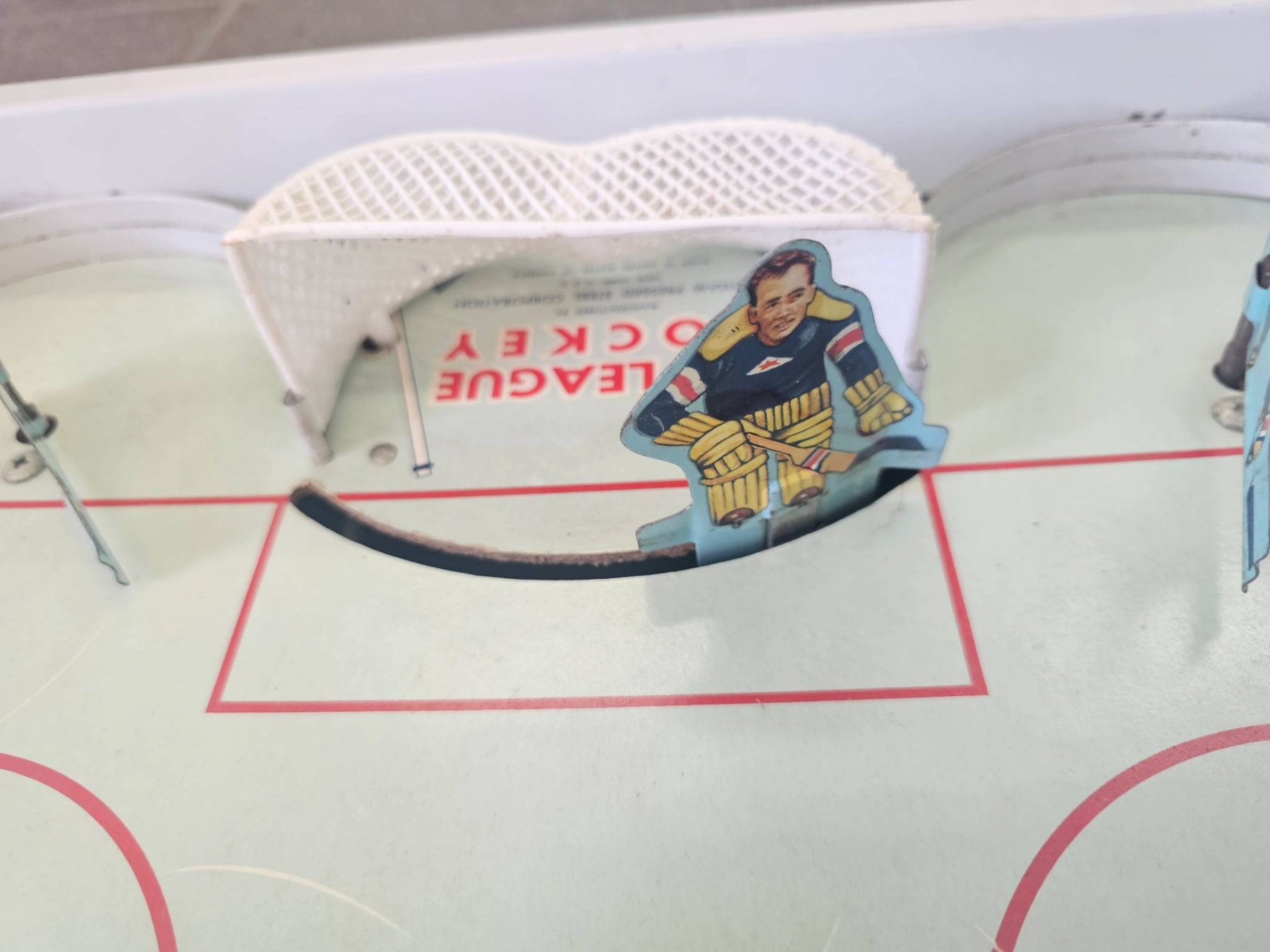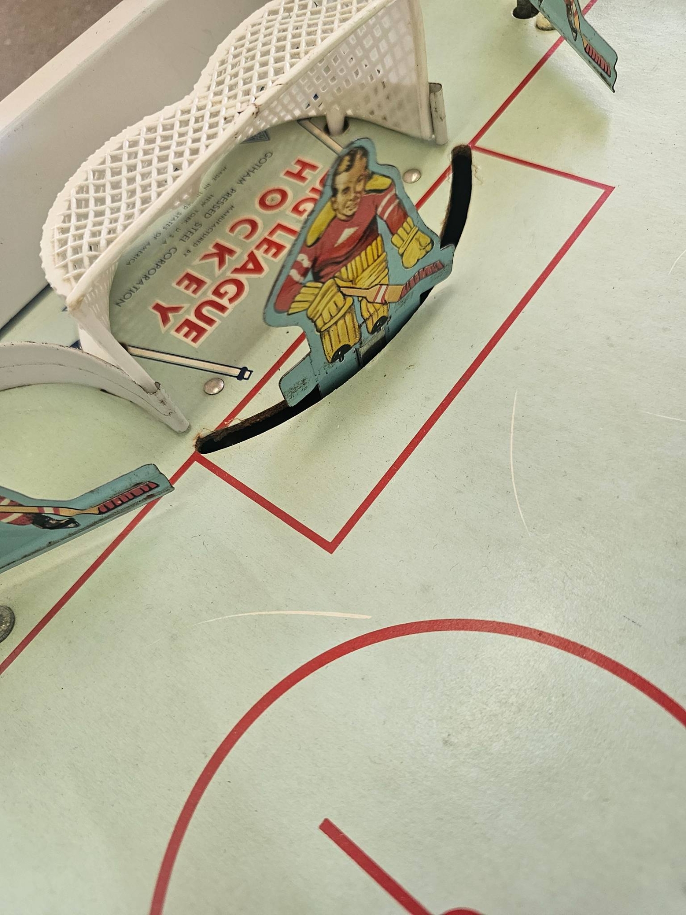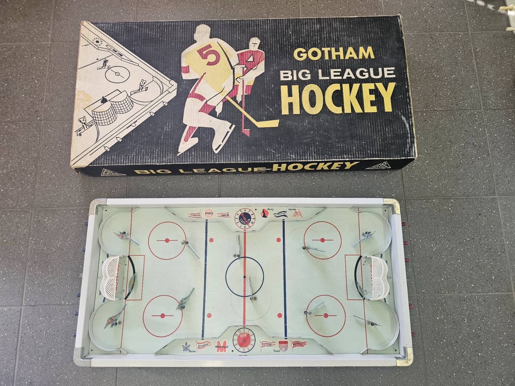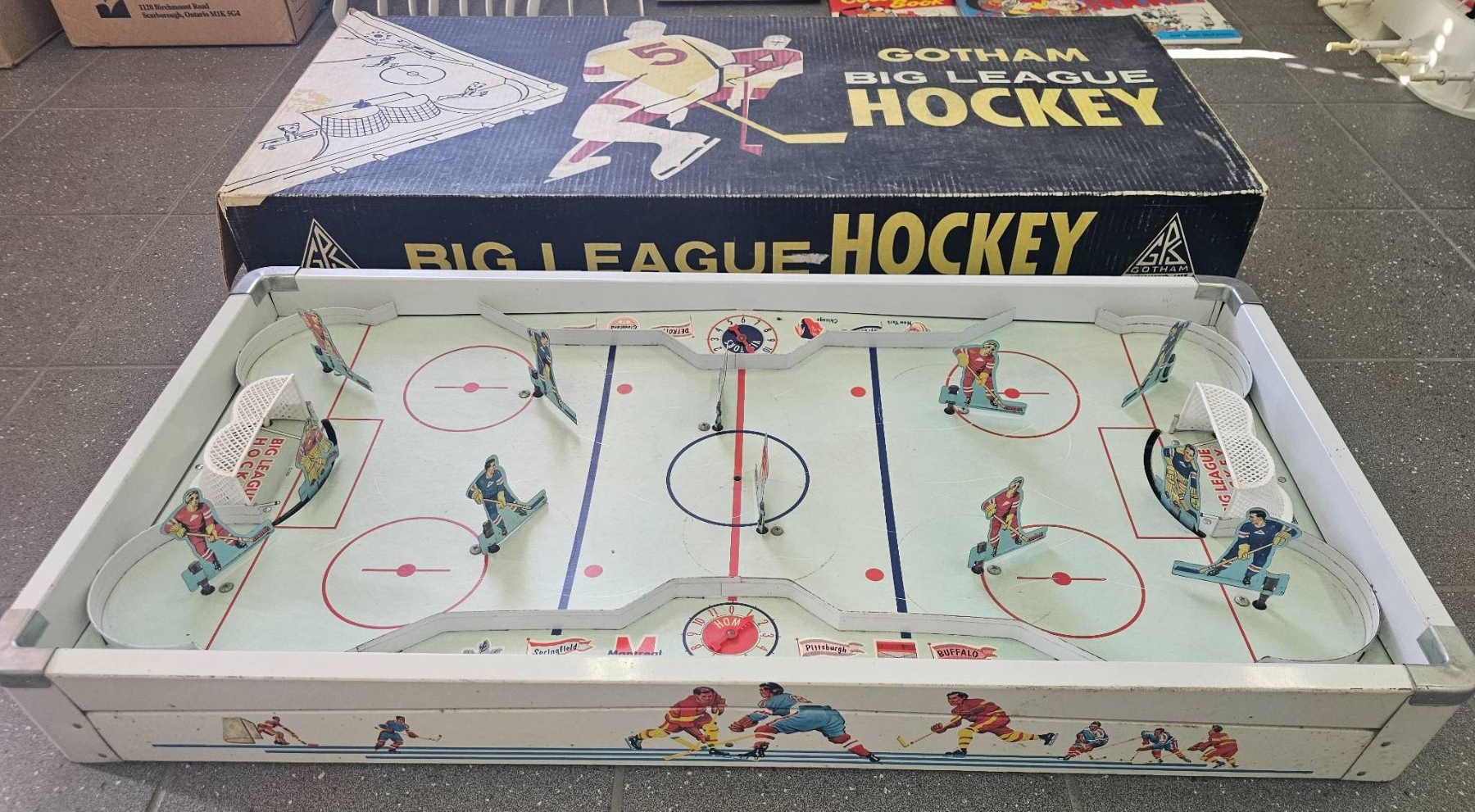 Gotham Big League Hockey vintage tabletop game, complete with illustrated game board and detailed player pieces. The set features colorful graphics and includes the original box, which shows wear typical of age. The hockey rink and pieces are intact, with notable goal and player illustrations. Ideal for collectors or enthusiasts of vintage sports games.