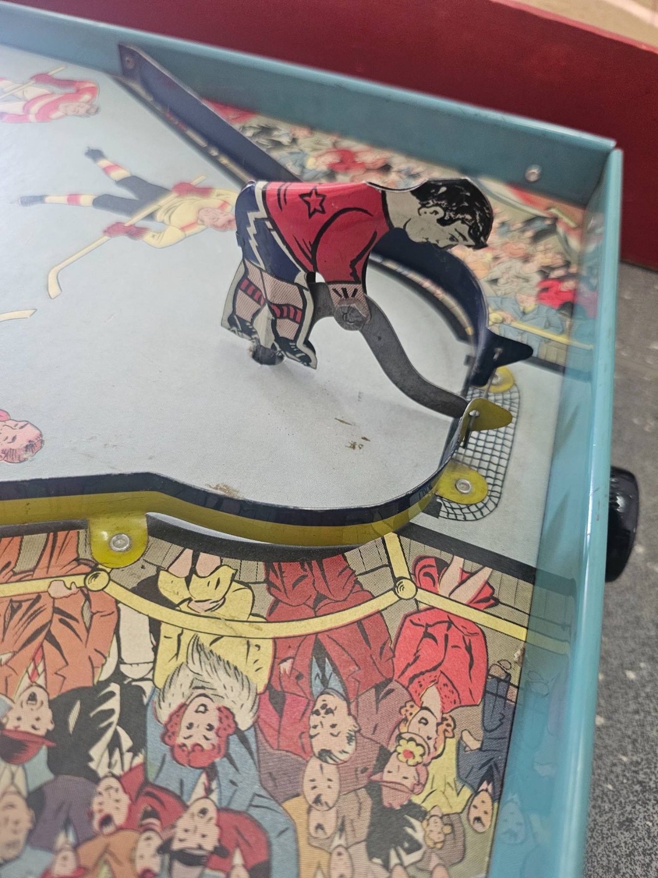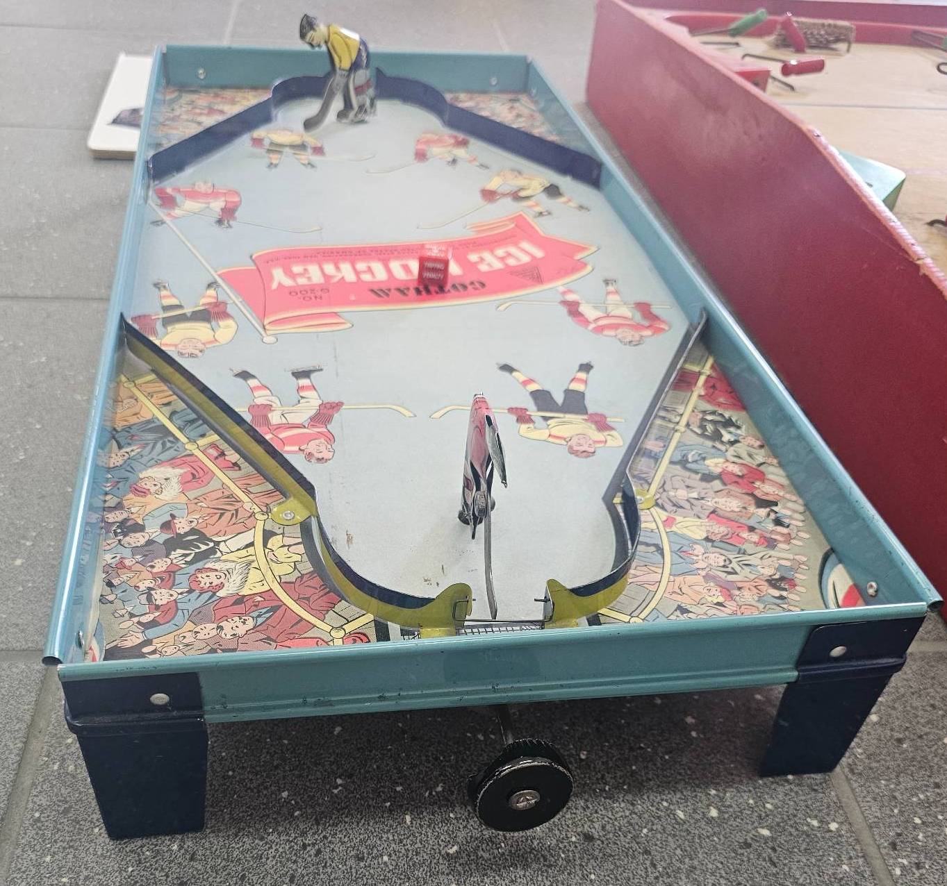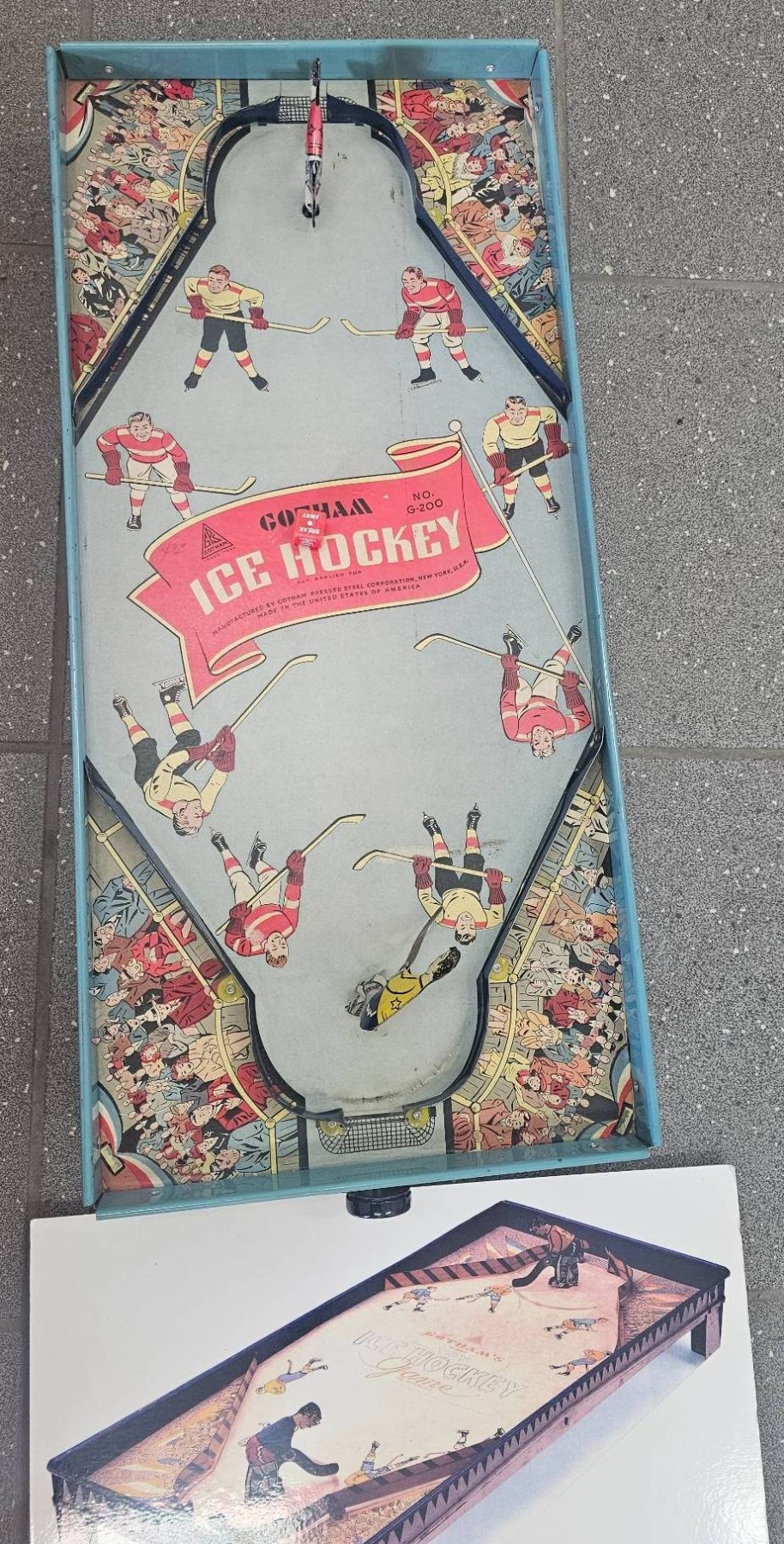 Vintage Gotham Ice Hockey tabletop game featuring metal players, colorful graphics, and functional mechanisms. Designed for two players, this collectible game showcases a retro hockey theme with detailed artwork. Comes with a metal base and raised sides to keep the puck in play. Signs of age and use consistent with its era but appears largely intact.