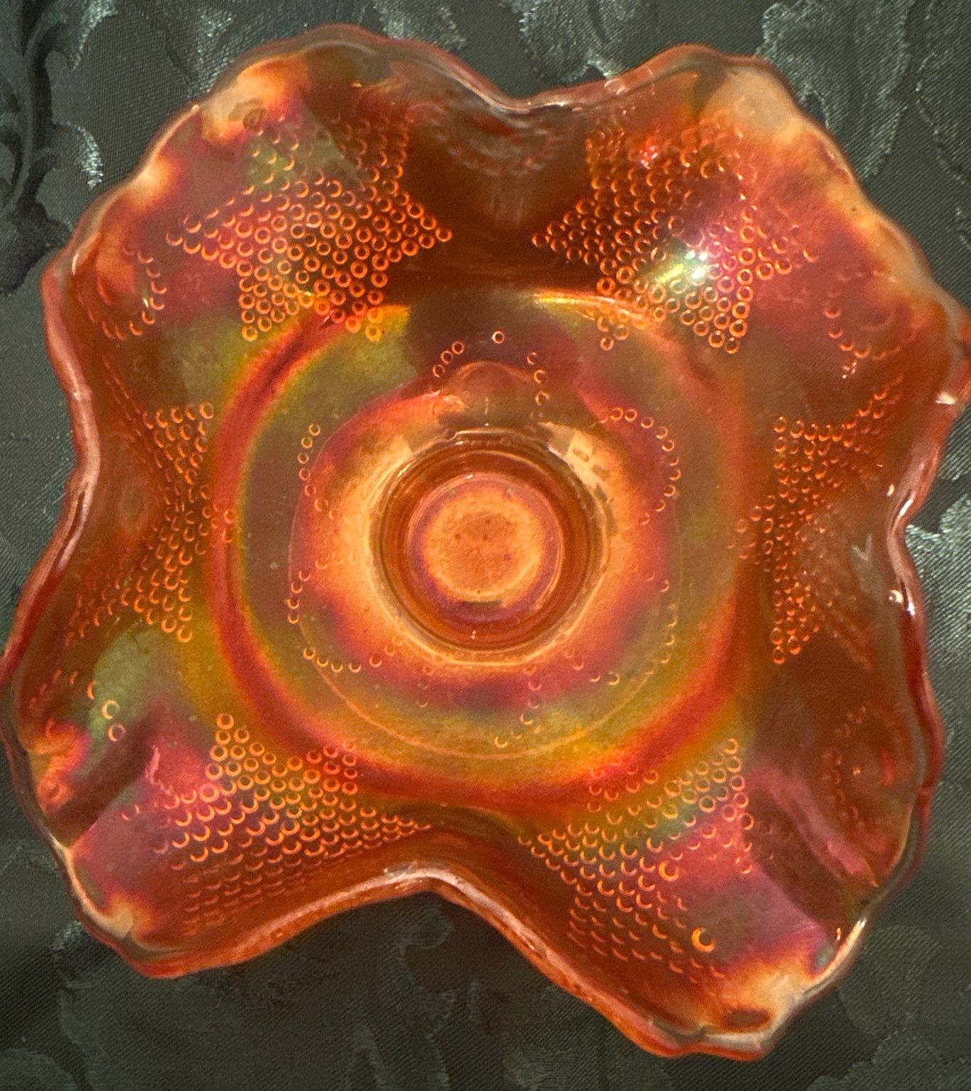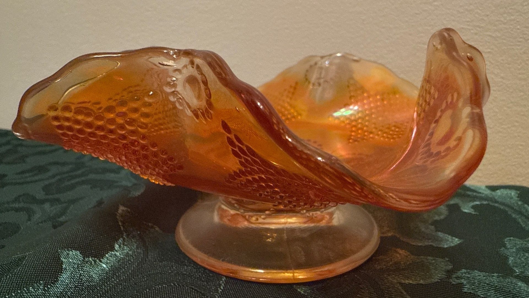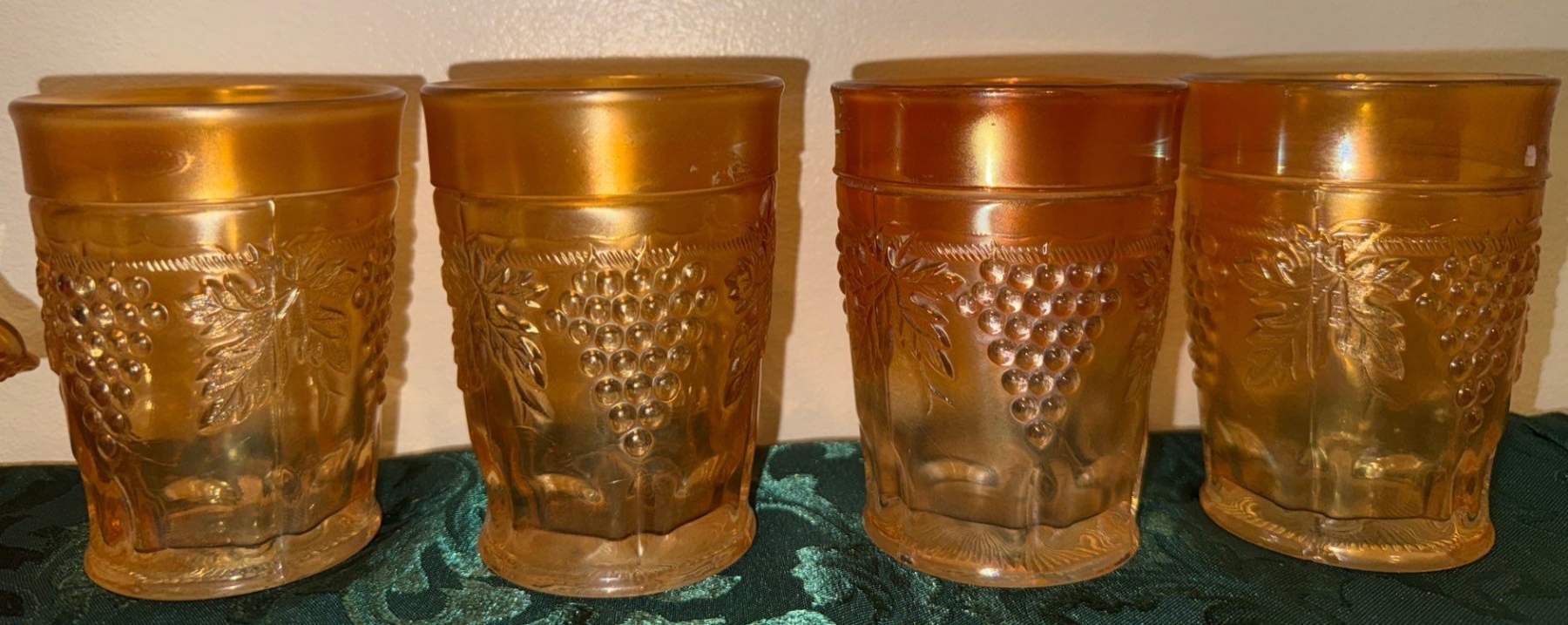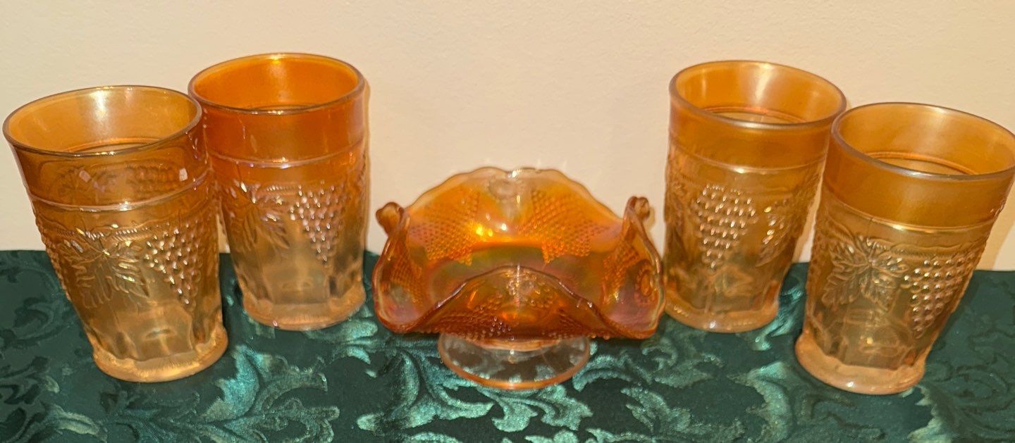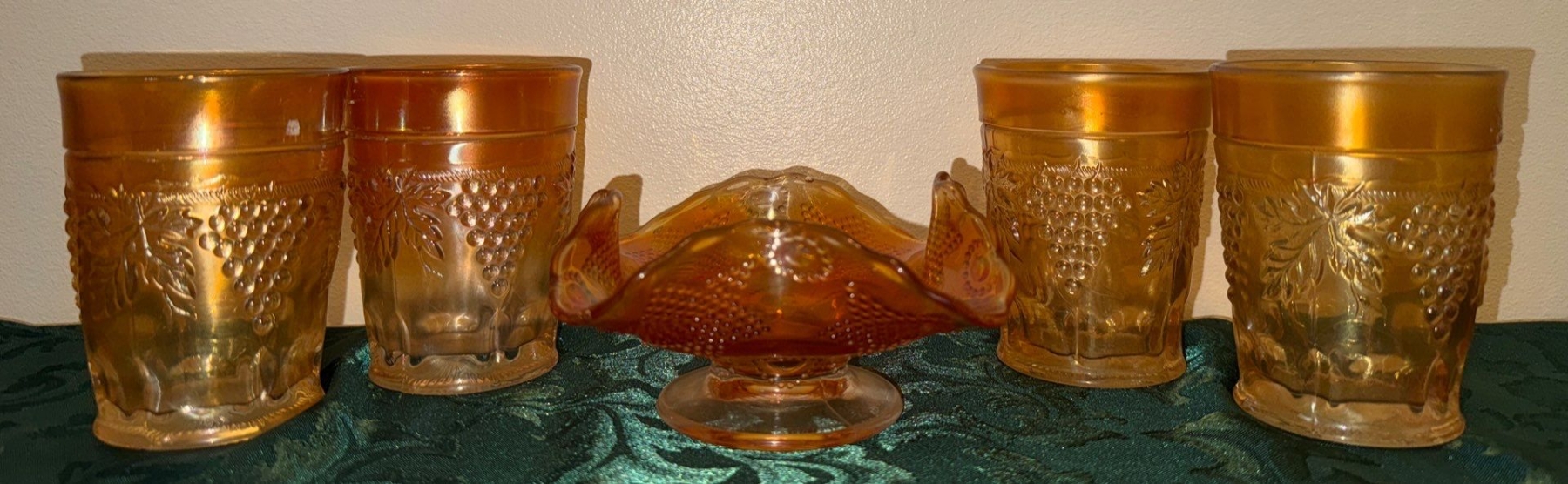 Grape & Cable Marigold Carnival Glass Four Tumblers & Pedestal Dish by Northwood Co