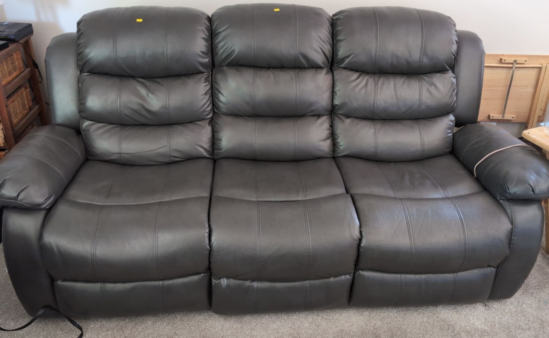 Grey Leather 3 Seater Sofa, Sofa Only, Ends Recline - 76W, 32D, 36T