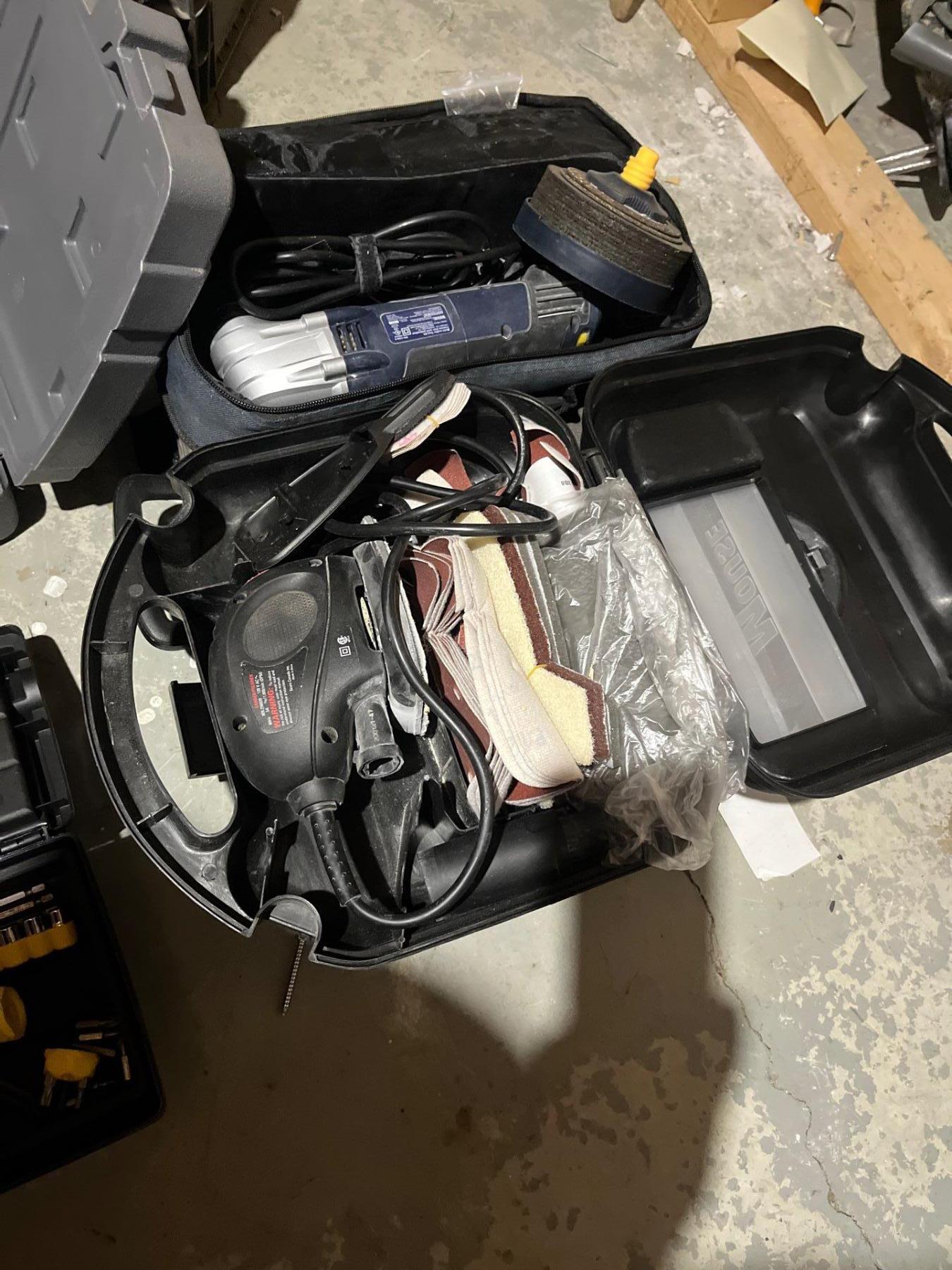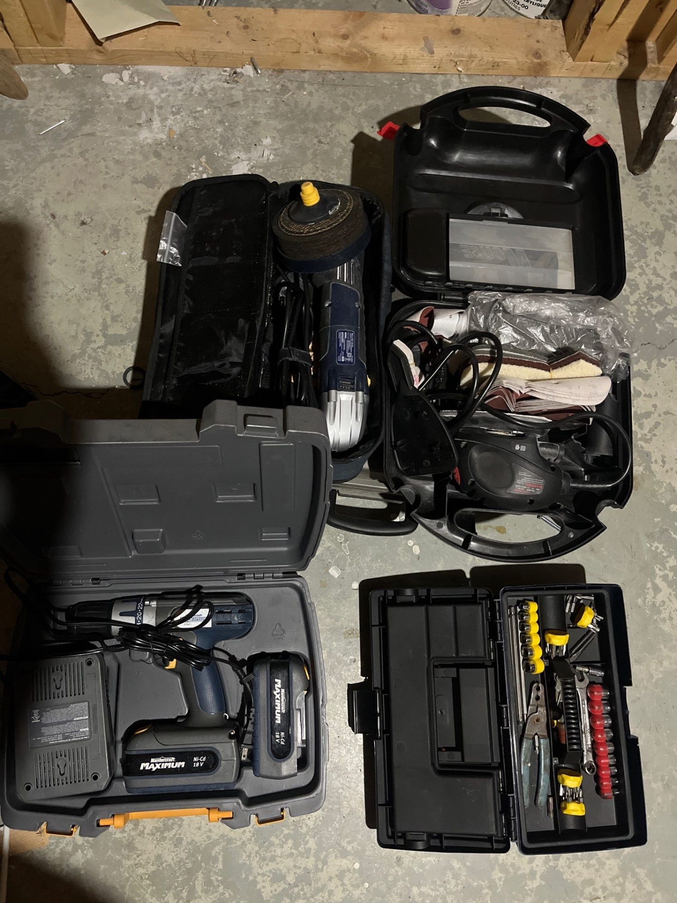 Grinder with grinding wheels, mouse sander, small toolbox with tools and a Mastercraft cordless drill with two batteries and charger