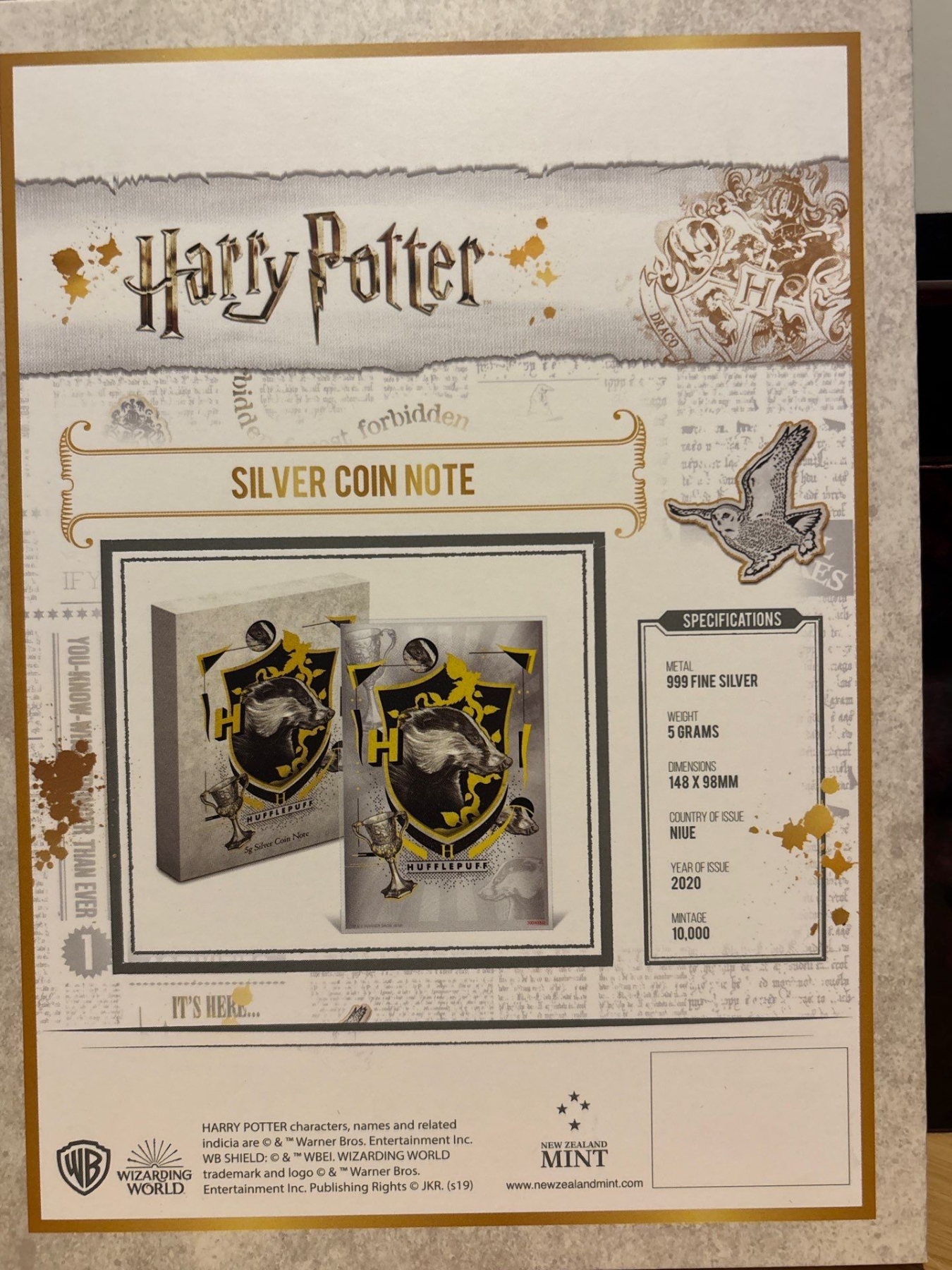 HUFFLEPUFF – HOGWARTS HOUSE BANNERS – HARRY POTTER – 2020 5 GRAM PURE SILVER COIN NOTE