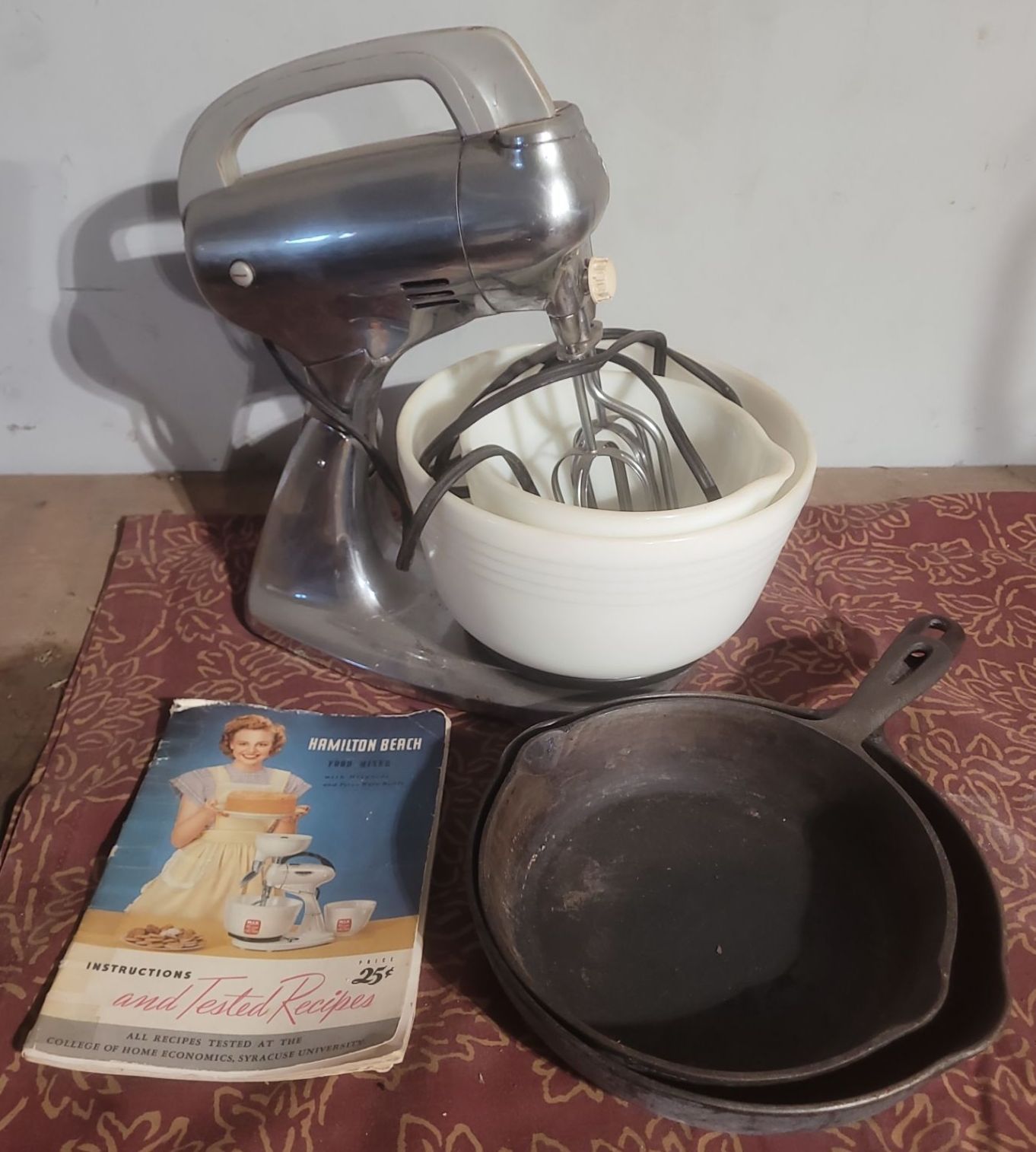 Hamilton Beach Food Mixer w/ Mixguide Model G + Cast Iron Pans
