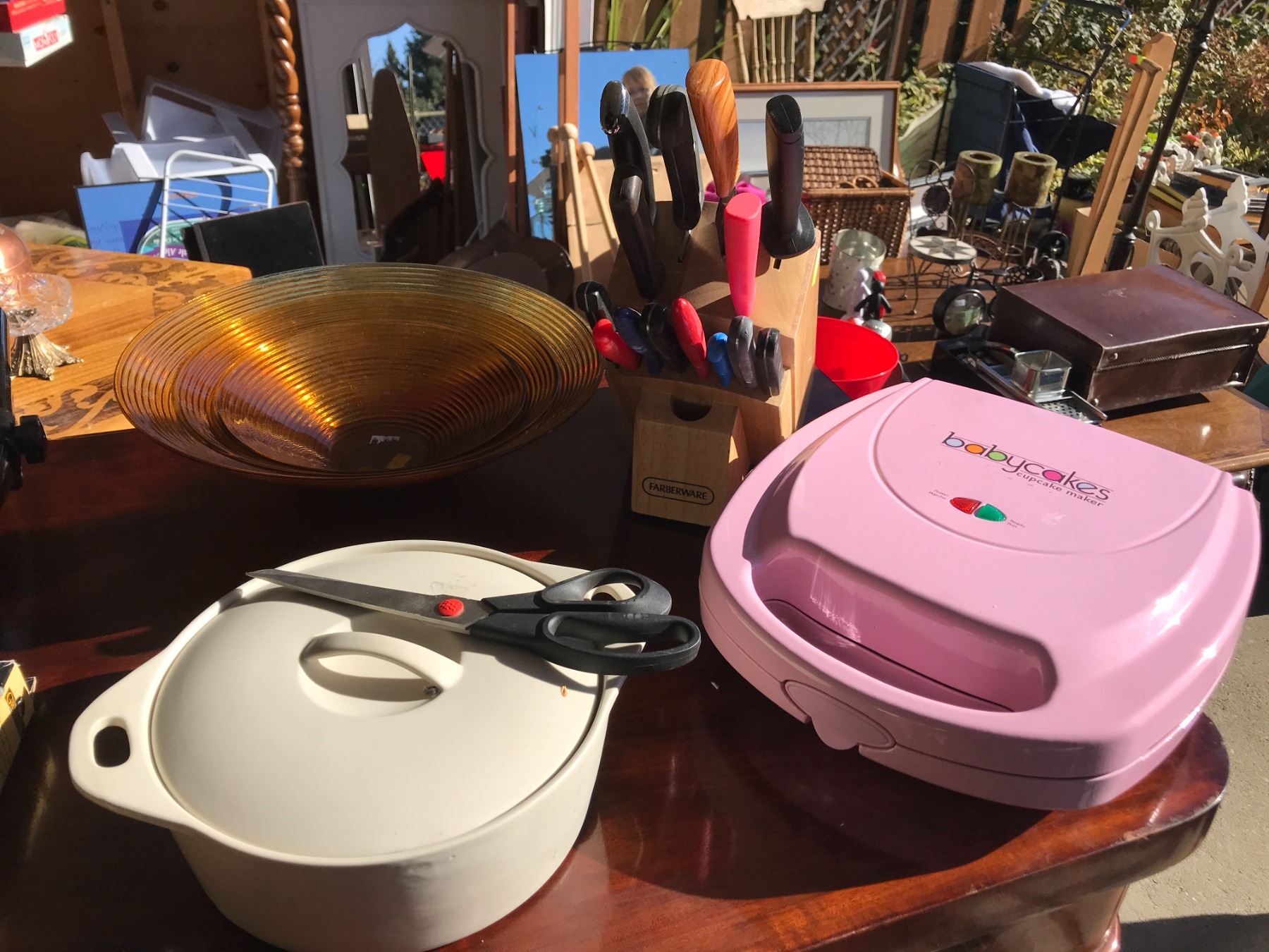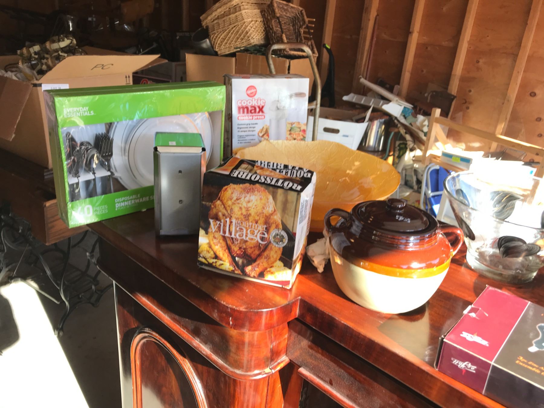 Hamilton Beach panini press, EZ pull corkscrew, cookie pres, asst Kitchenware and bowls, wooden knife block (incl. Henkel scissors and asst knives)