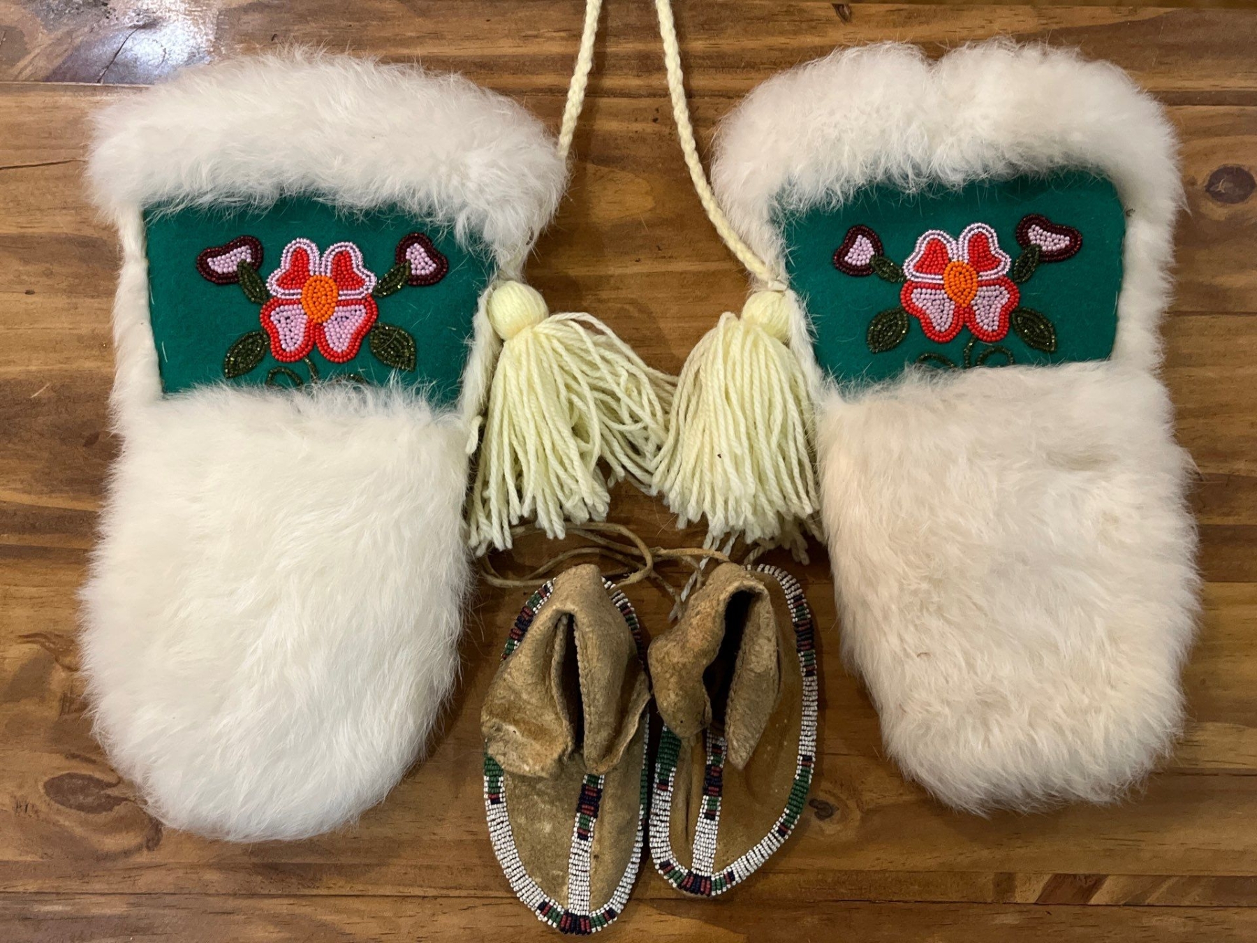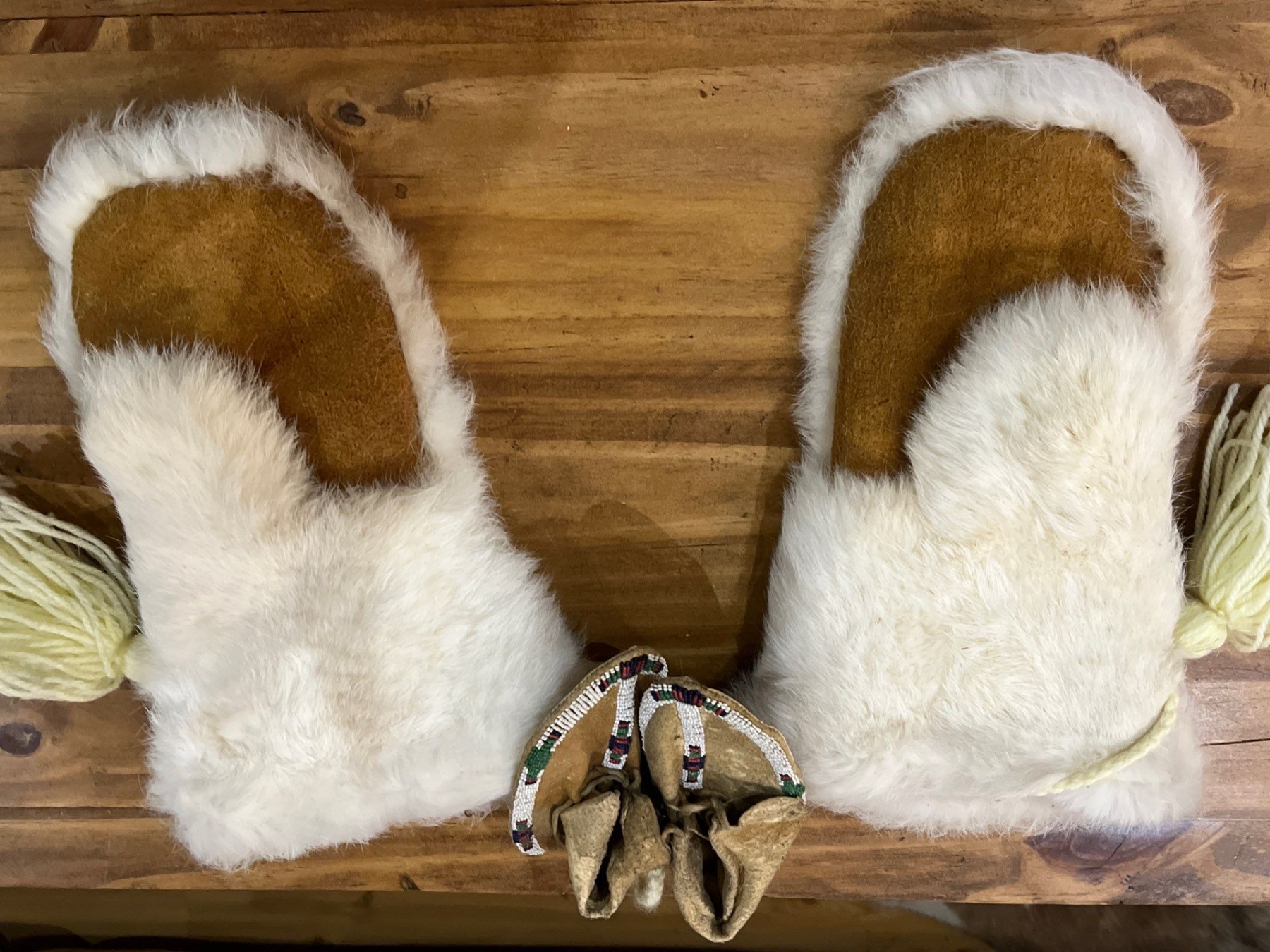 Hand Made white fur mittens with child Size Deer skin moccasins.