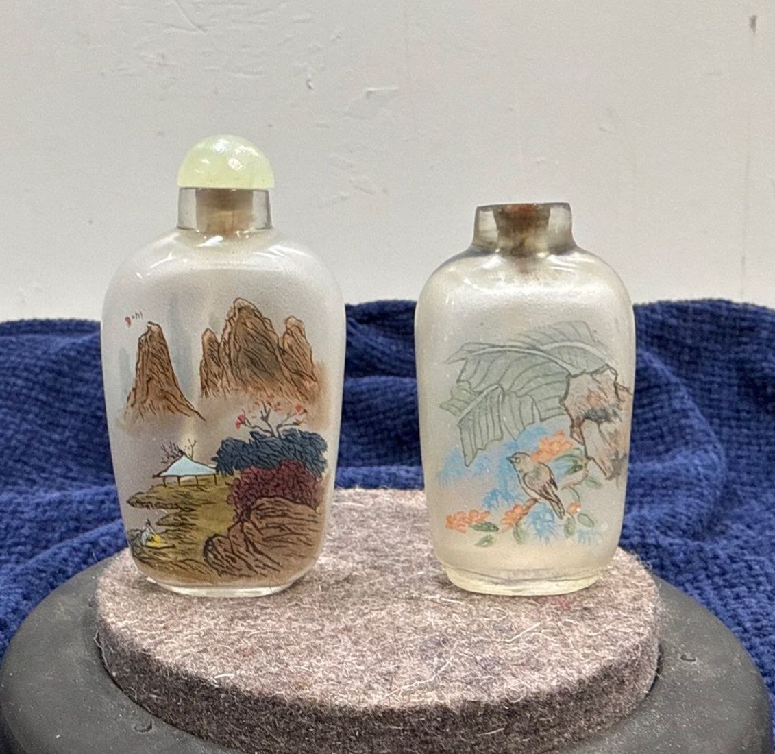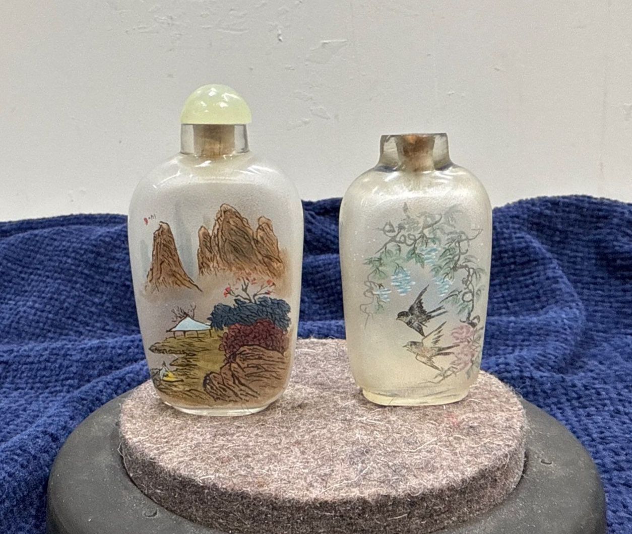 Hand Painted Bird and Mountain Scene Glass Snuff Bottles with Spoons 3H