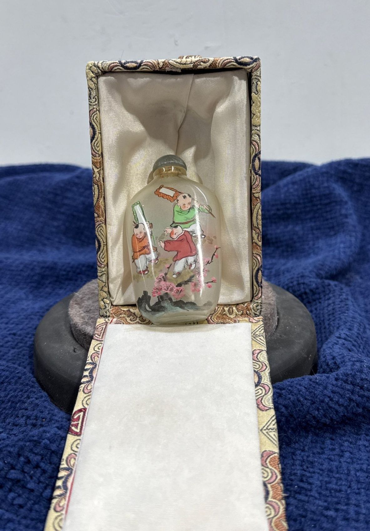 Hand Painted Celebrating Children Glass Snuff Bottle with Spoon 2.5H