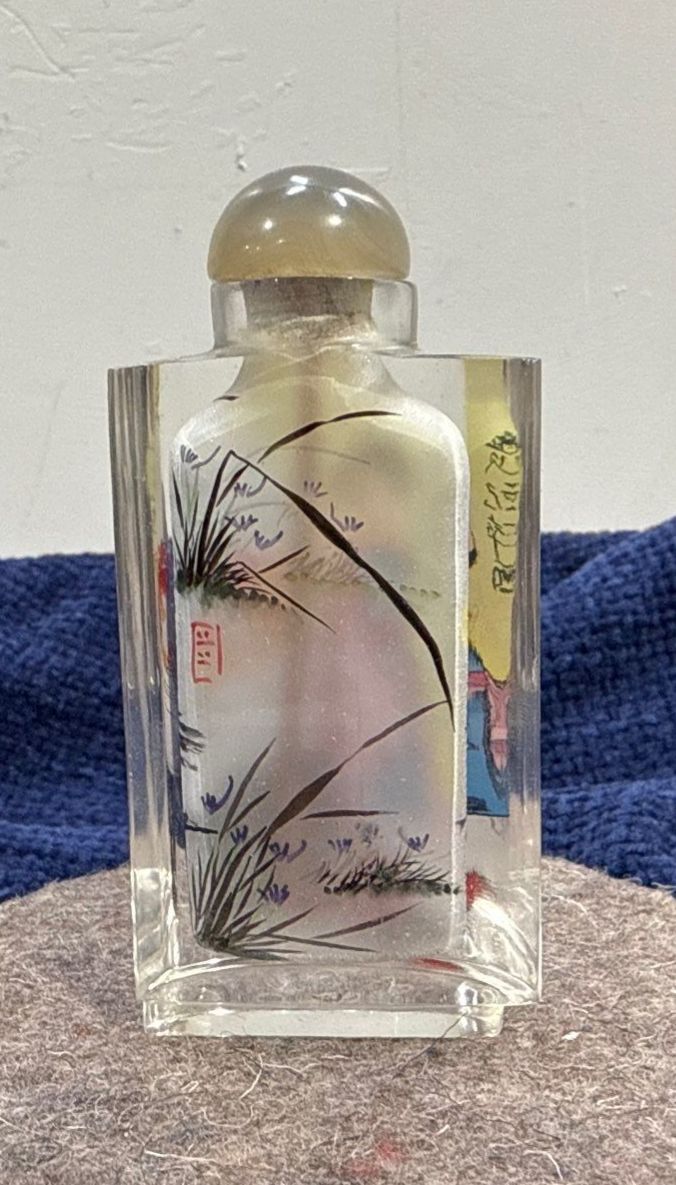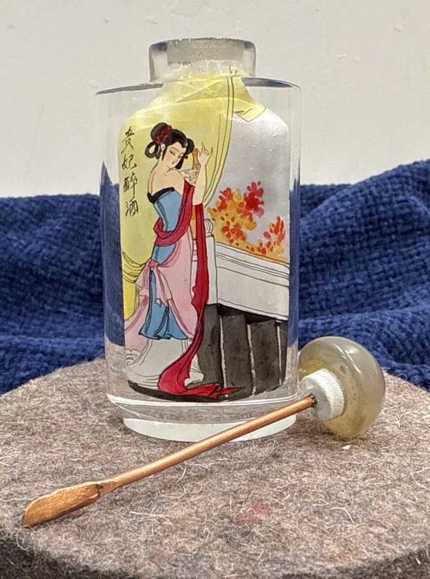 Hand Painted Coy Lady Glass Snuff Bottle with Spoon 3.25H