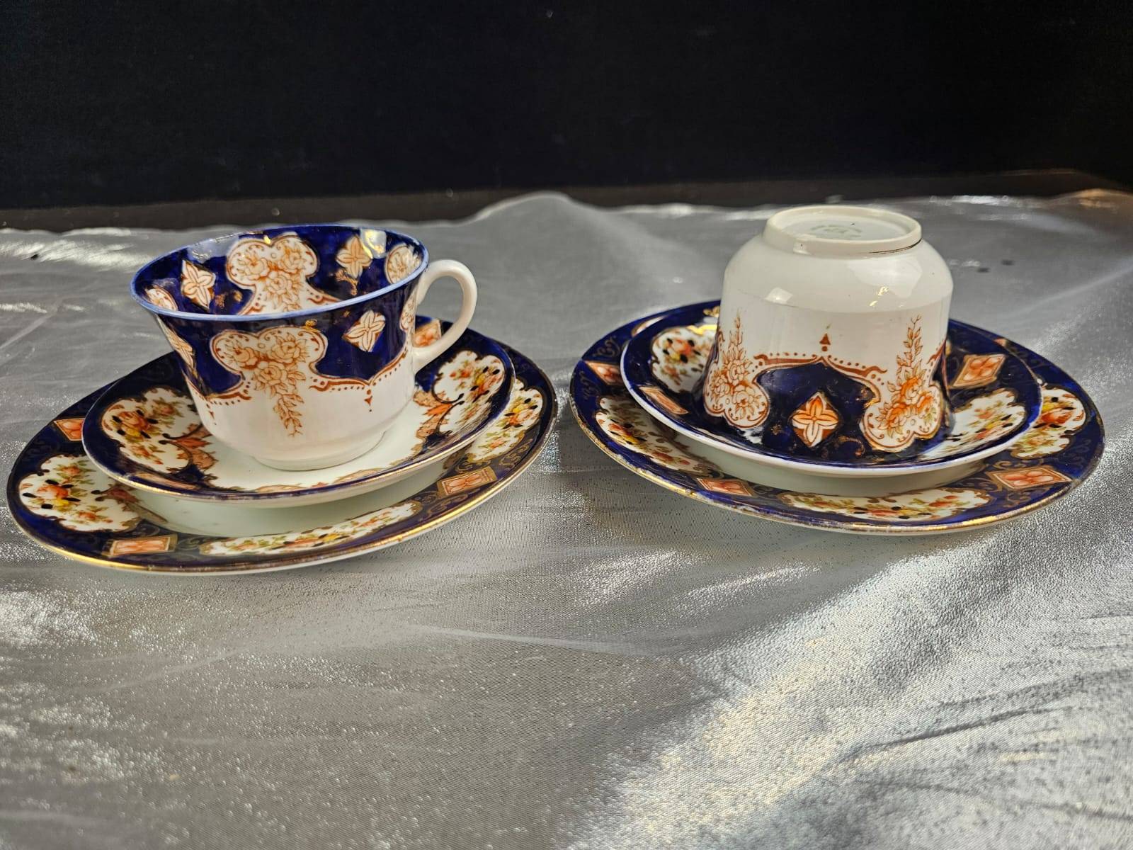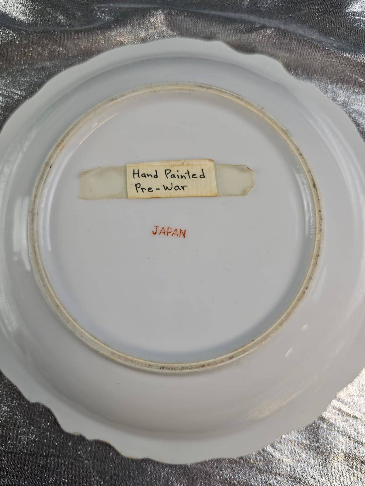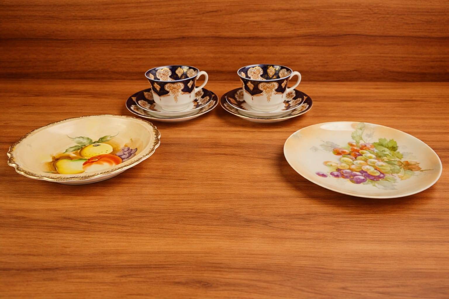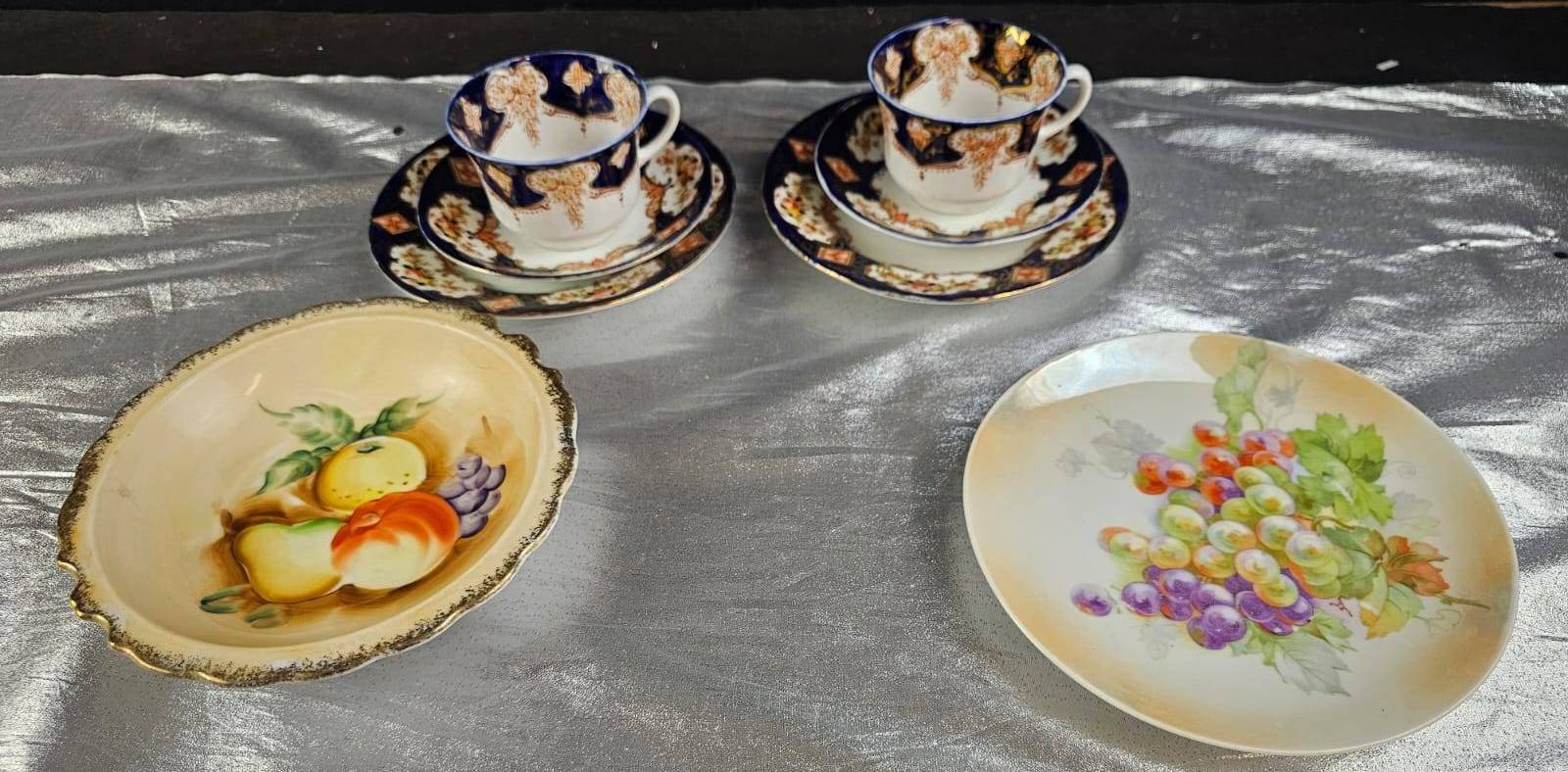 Elegant hand-painted porcelain items, including two tea cups with saucers featuring intricate navy and gold floral designs stamped ‘Made in Japan,’ as well as two plates with fruit designs—one with colorful grapes and another with mixed fruit. Plates are marked as ‘Pre-War’ and ‘Hand Painted.’ A perfect addition to any collector’s cabinet or for display.