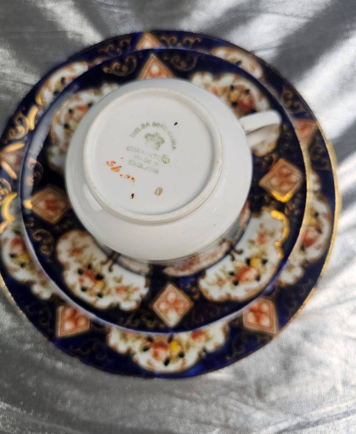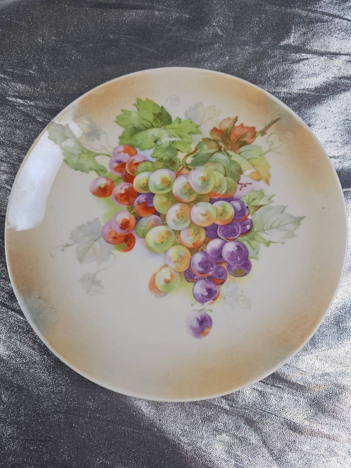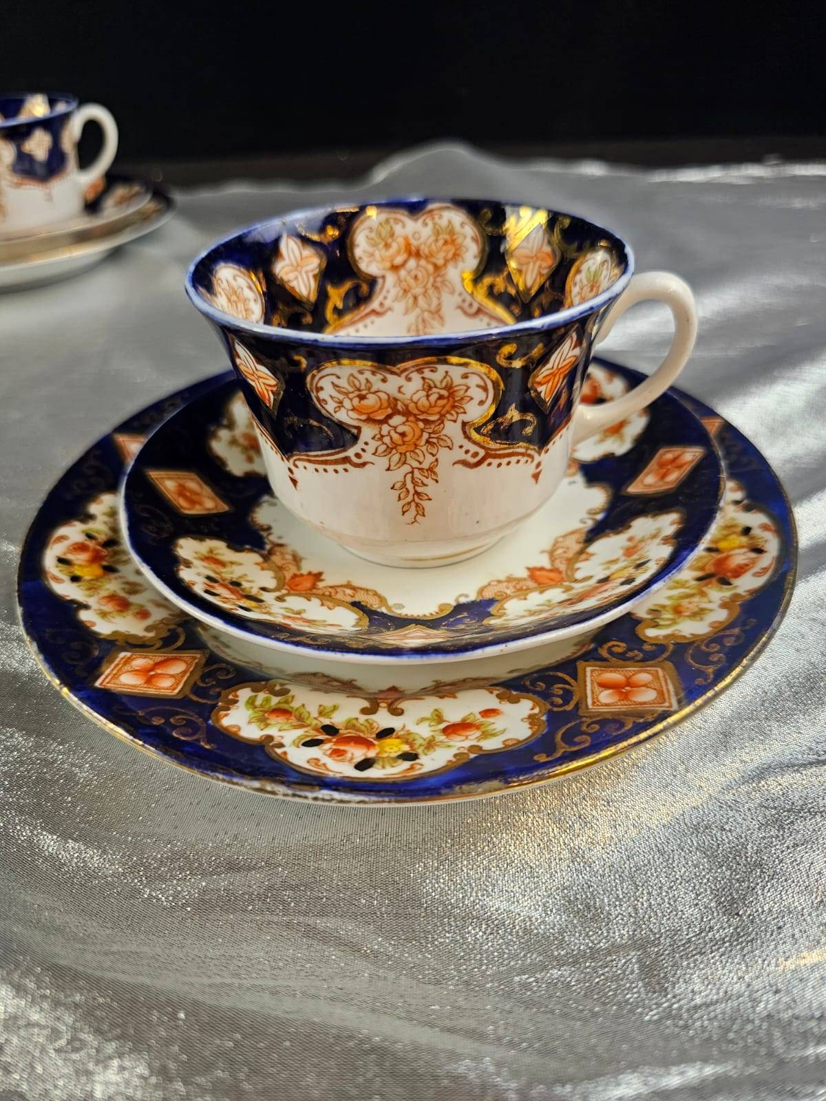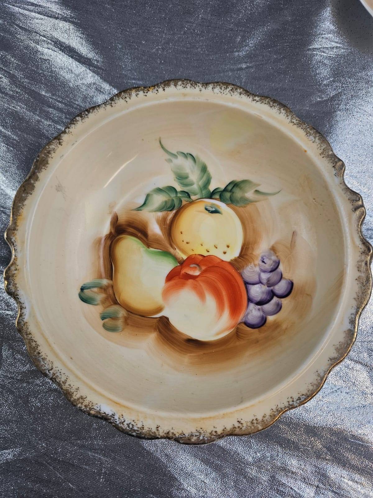 Elegant hand-painted porcelain items, including two tea cups with saucers featuring intricate navy and gold floral designs stamped ‘Made in Japan,’ as well as two plates with fruit designs—one with colorful grapes and another with mixed fruit. Plates are marked as ‘Pre-War’ and ‘Hand Painted.’ A perfect addition to any collector’s cabinet or for display.
