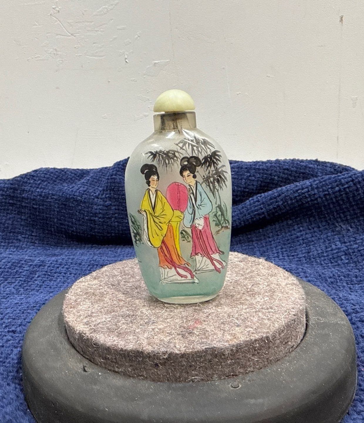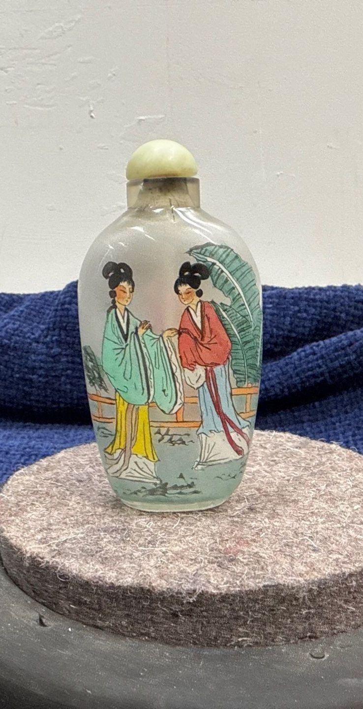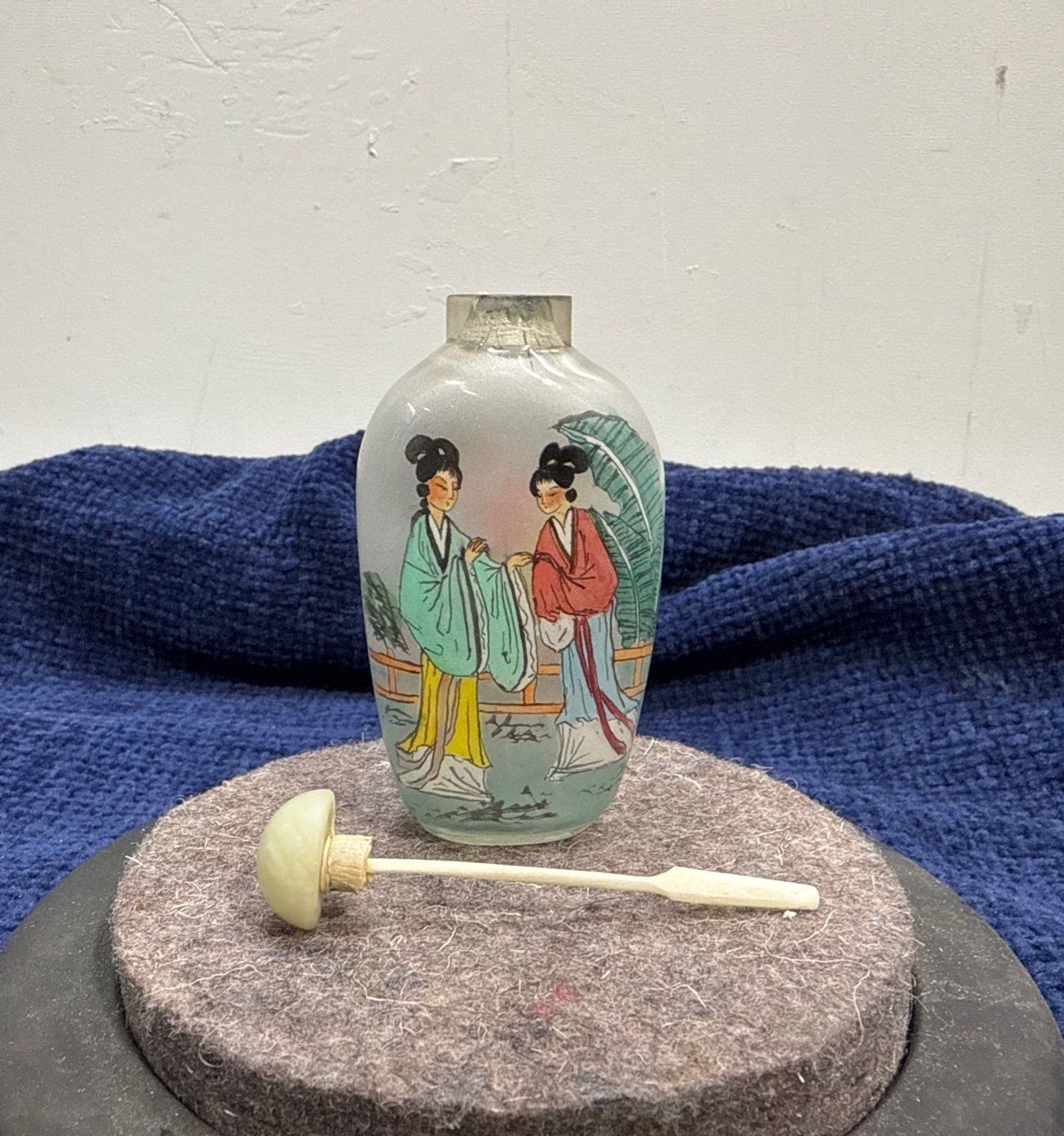 Hand Painted Ladies Wispering Glass Snuff Bottle with Spoon 3H