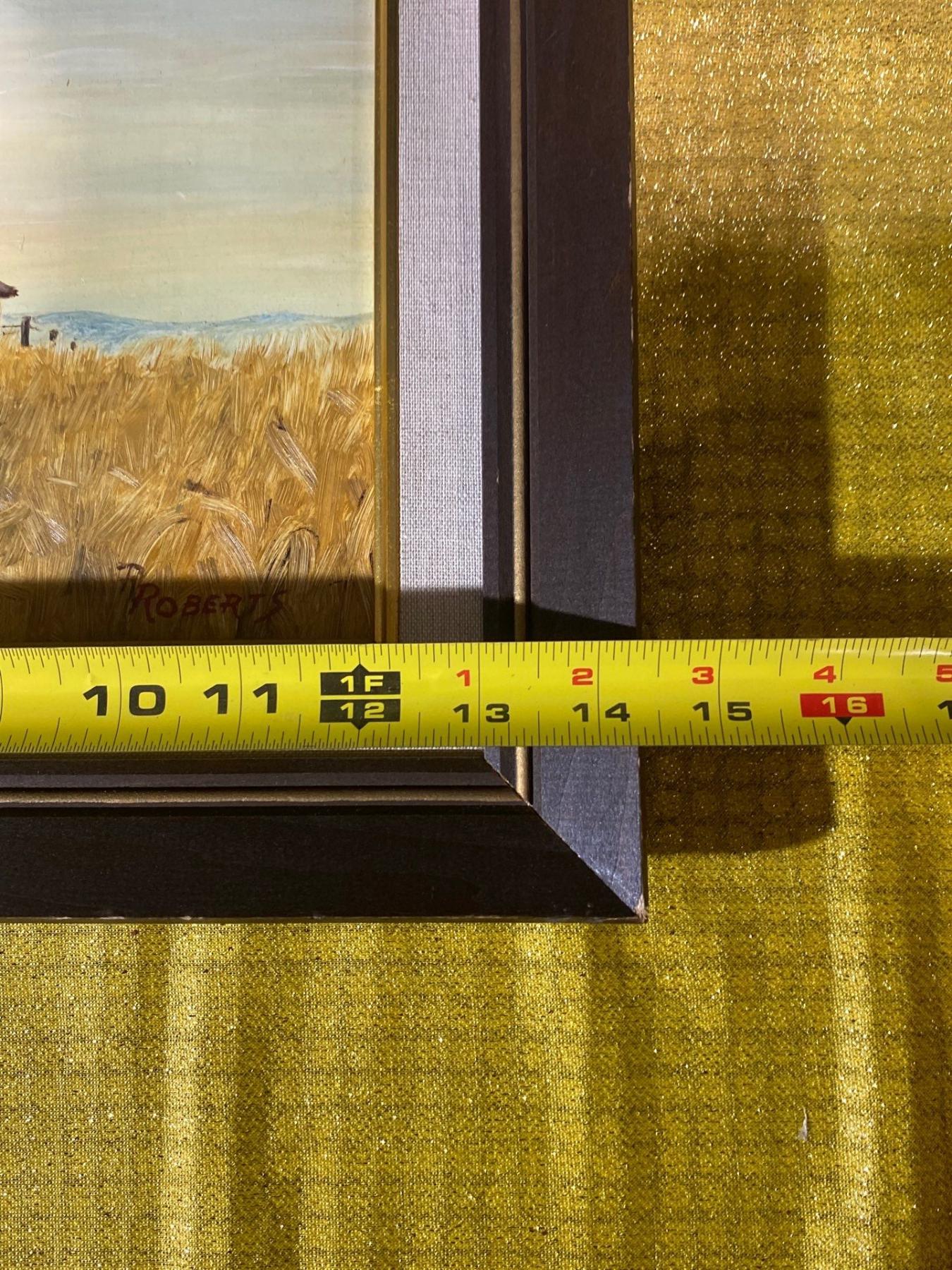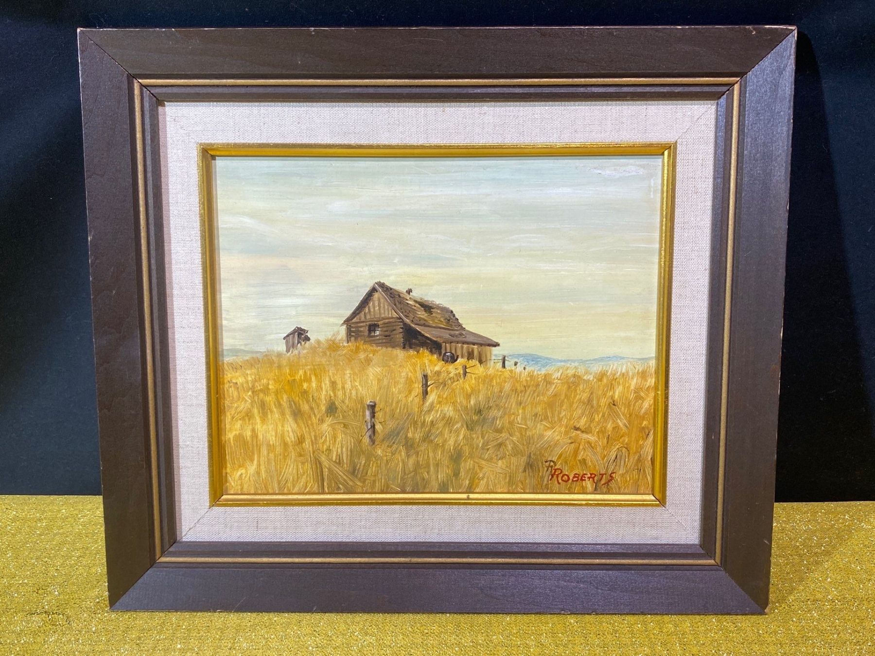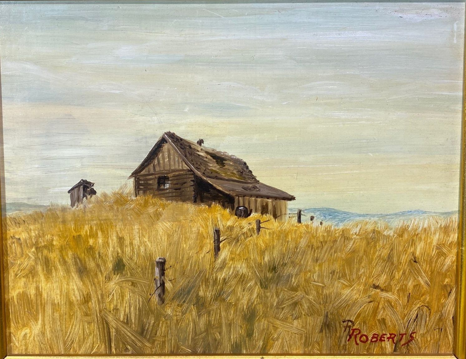 This hand-painted work depicts a rustic wooden building set in a tranquil field, rendered with a charming, pastoral sensibility. Signed Roberts, the painting showcases expressive brushwork and a warm, earthy palette that brings the scene to life. A captivating piece for collectors of rural landscapes and evocative, atmospheric art.