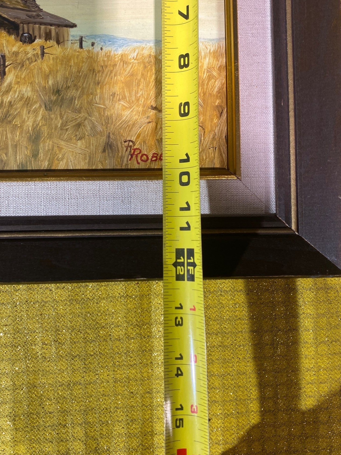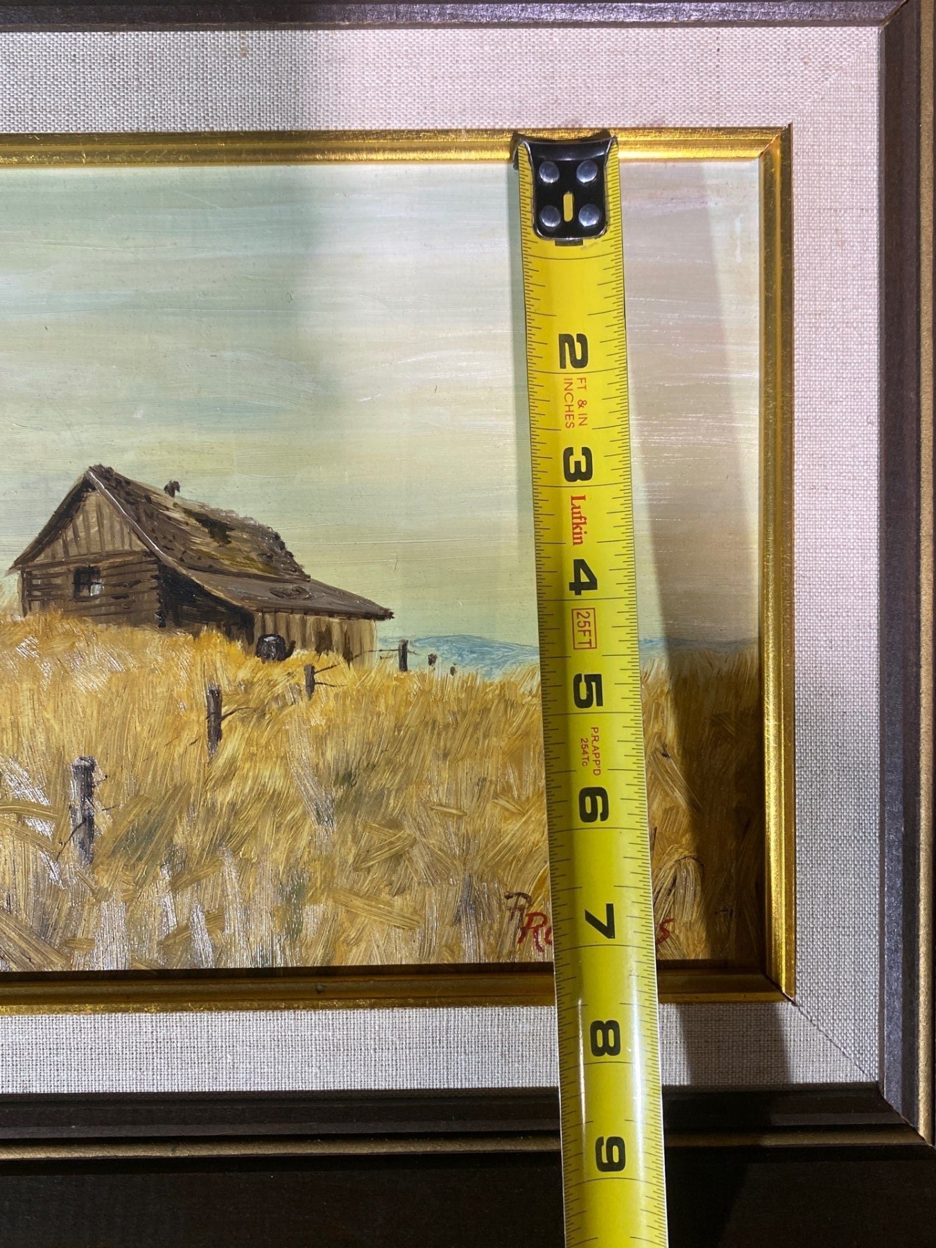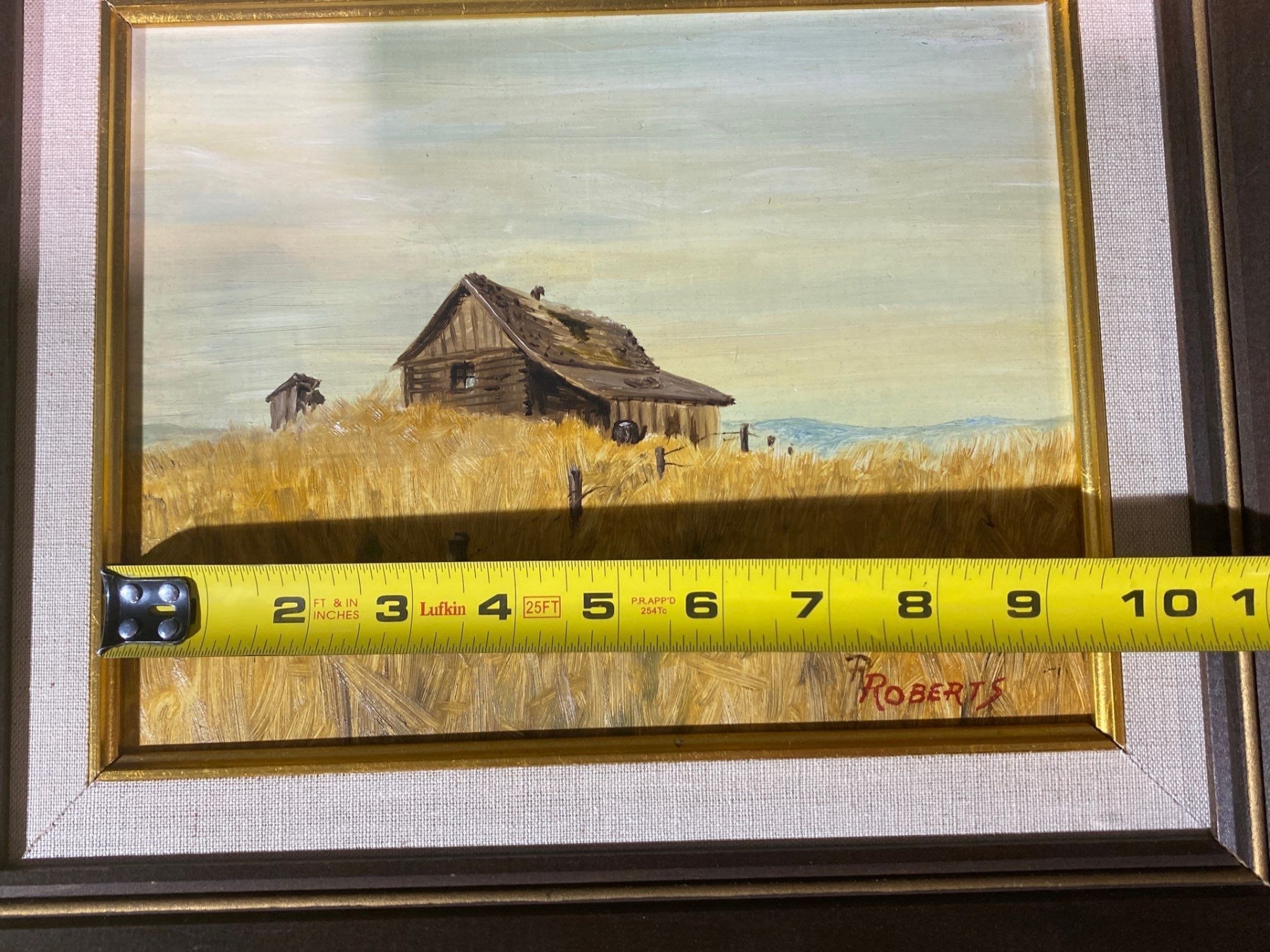 This hand-painted work depicts a rustic wooden building set in a tranquil field, rendered with a charming, pastoral sensibility. Signed Roberts, the painting showcases expressive brushwork and a warm, earthy palette that brings the scene to life. A captivating piece for collectors of rural landscapes and evocative, atmospheric art.