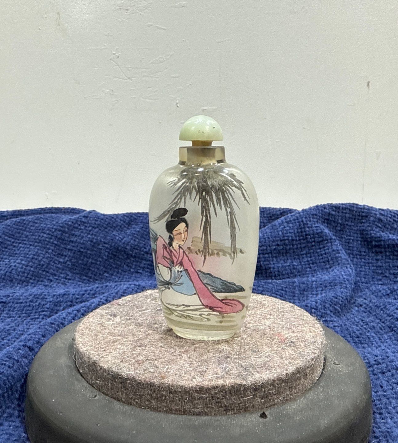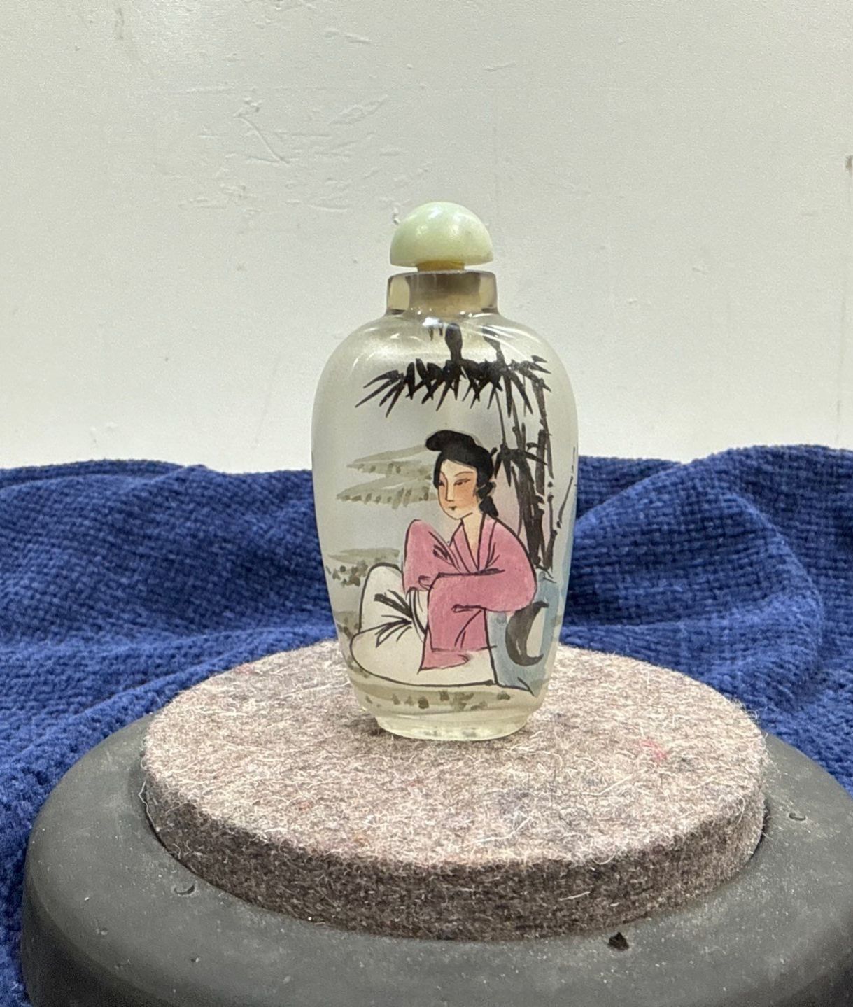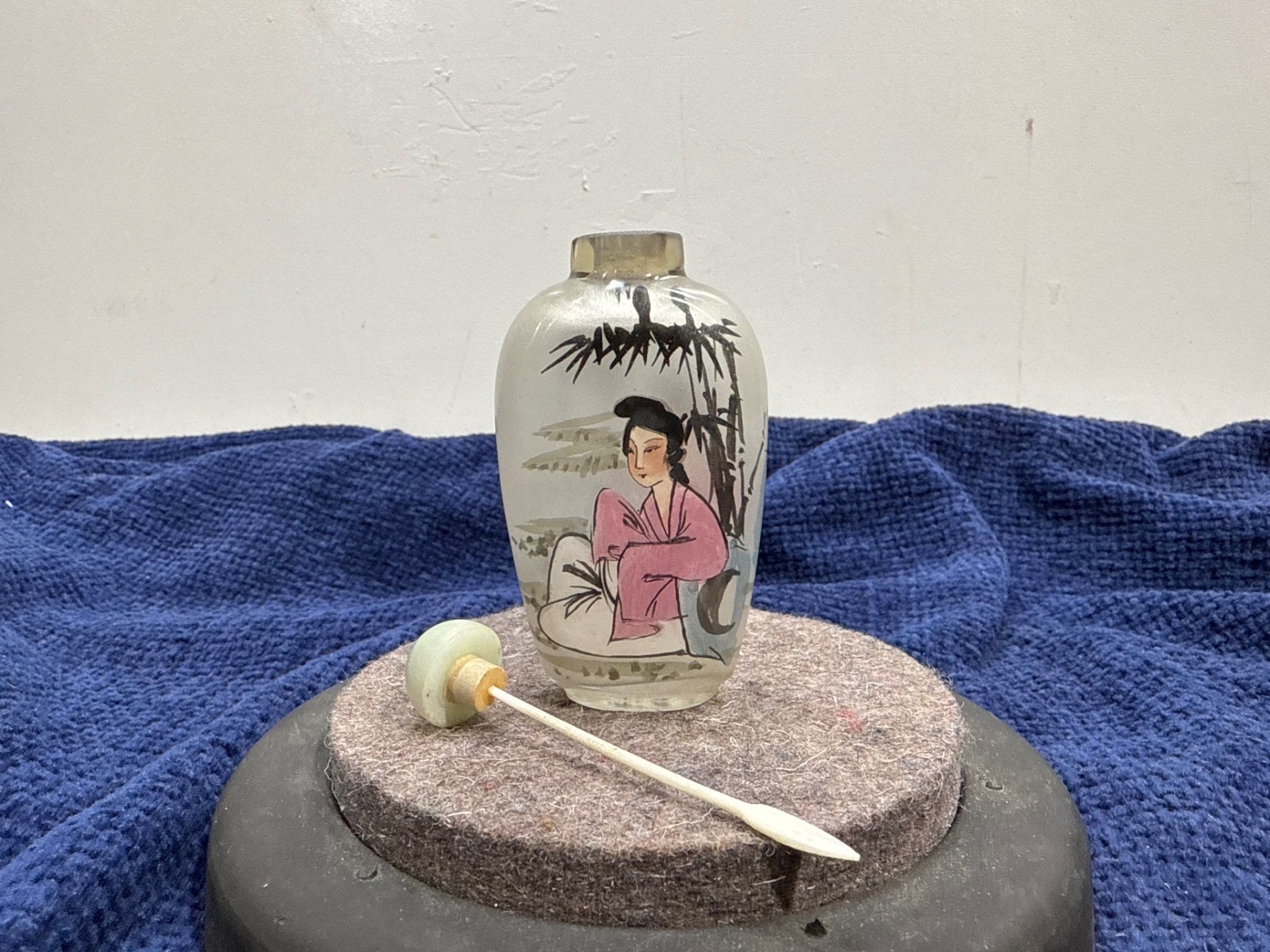 Hand Painted Seated Lady Snuff Bottle with Spoon 2.25H