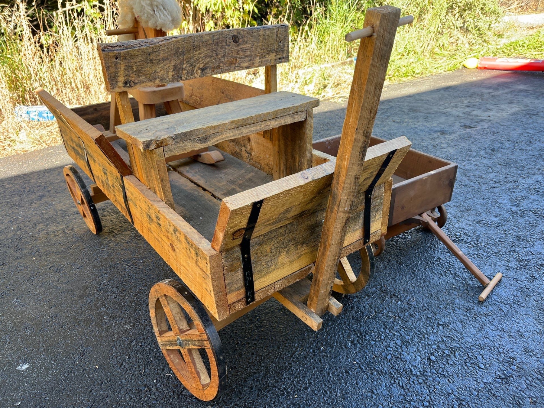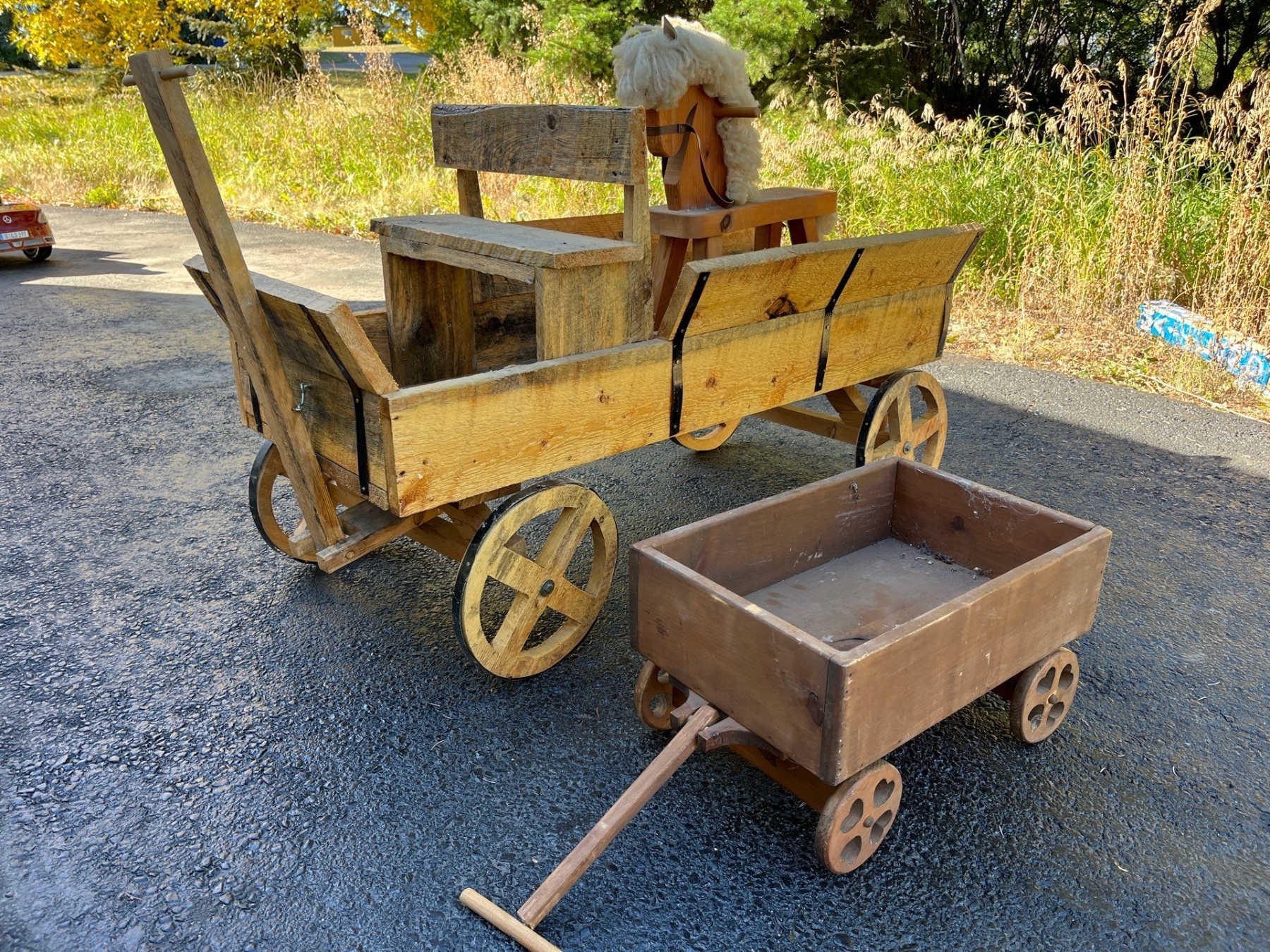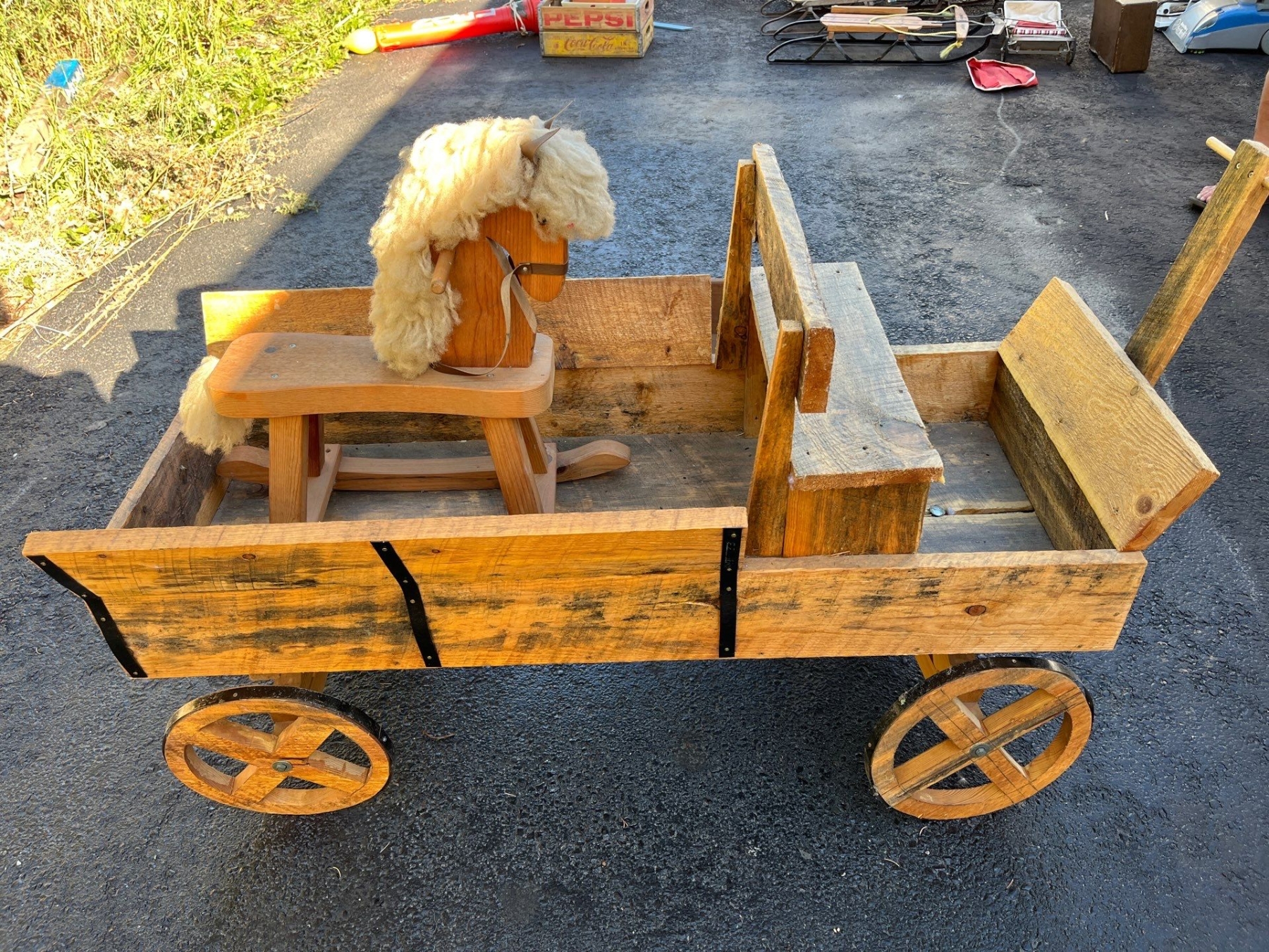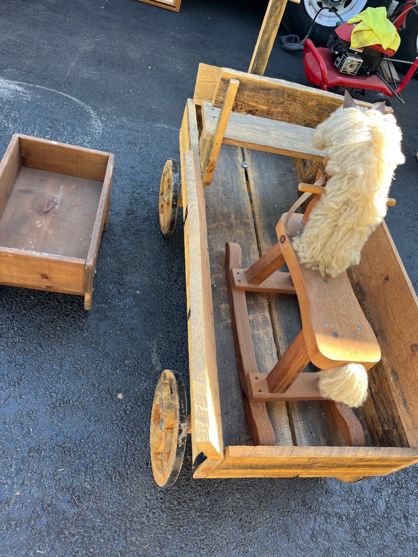 Hand built, mini horse drawn, carriages/wagons with handmade wooden rocking horse horse.