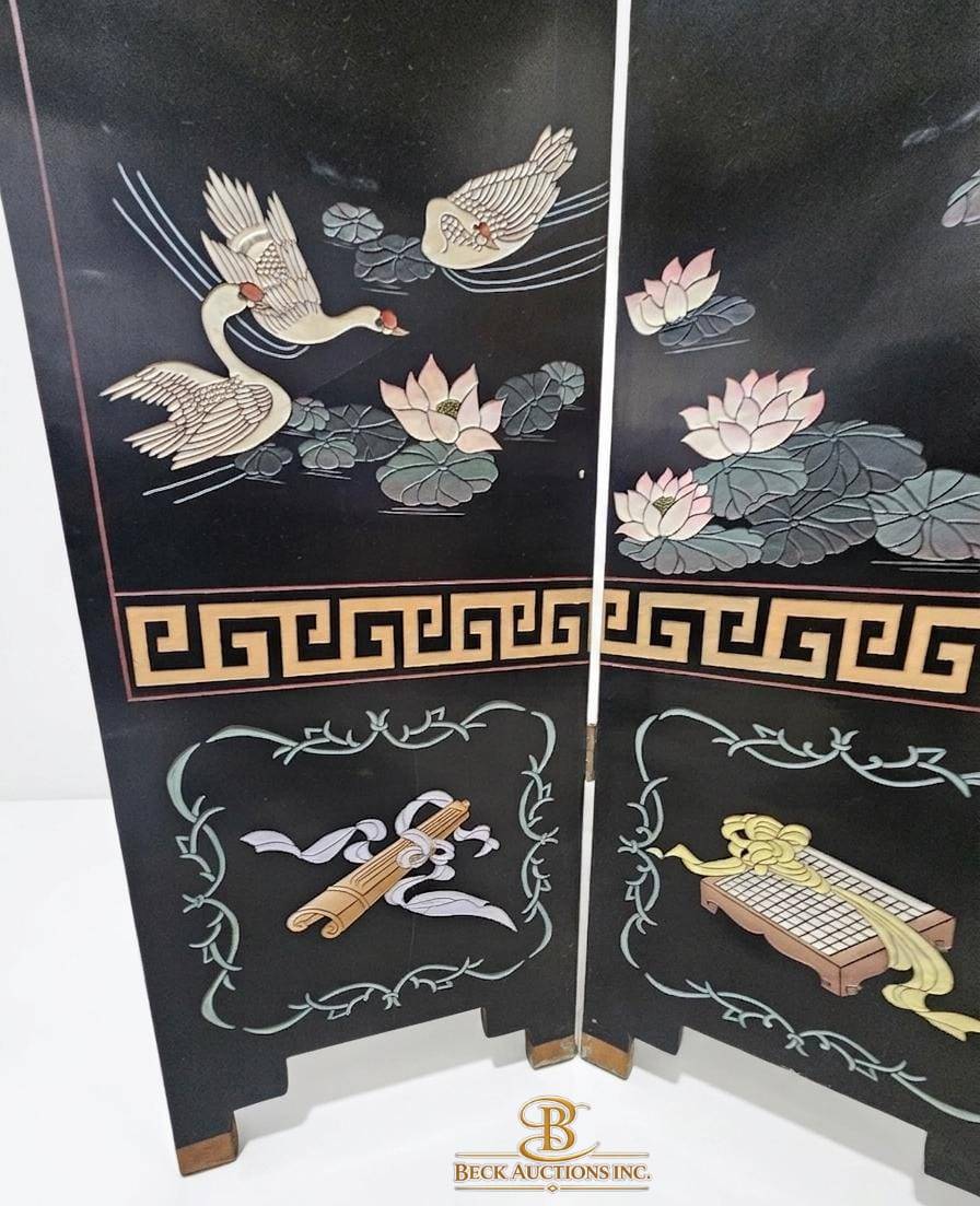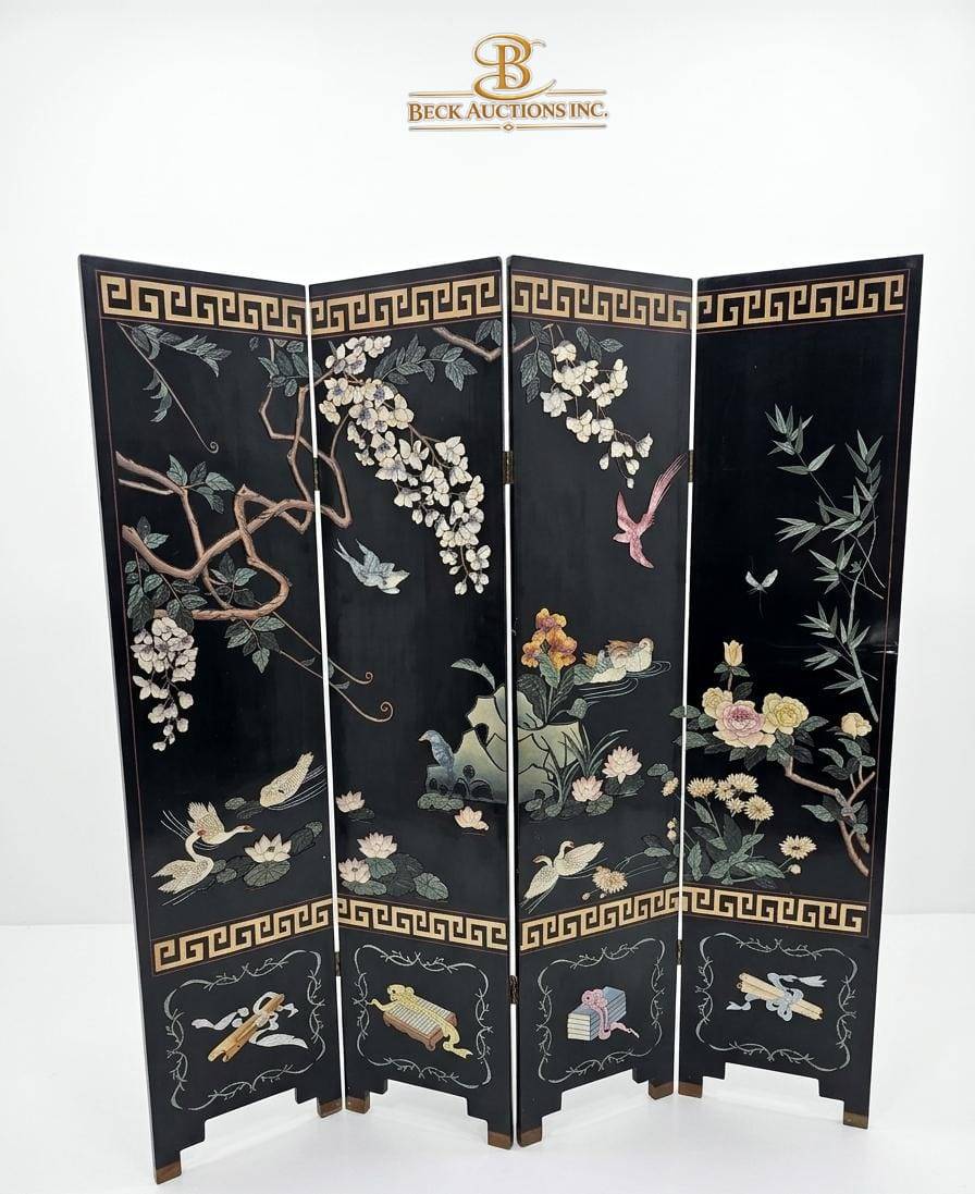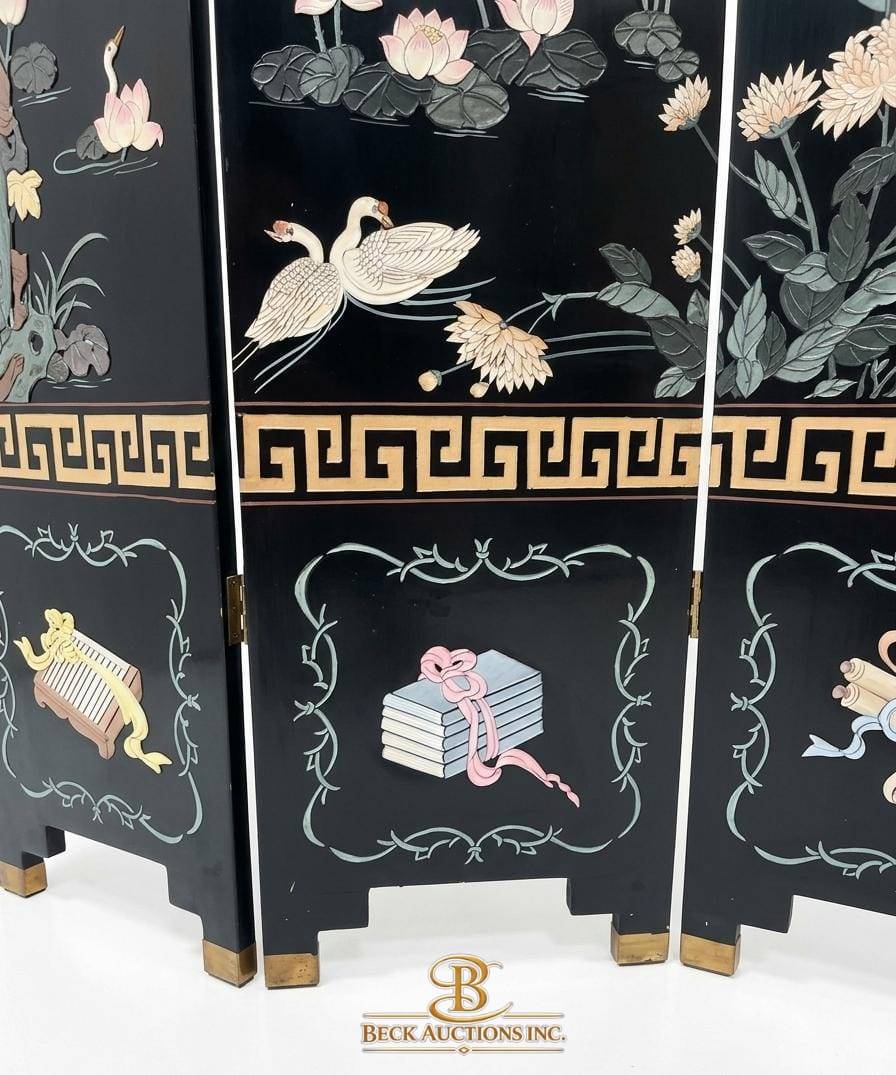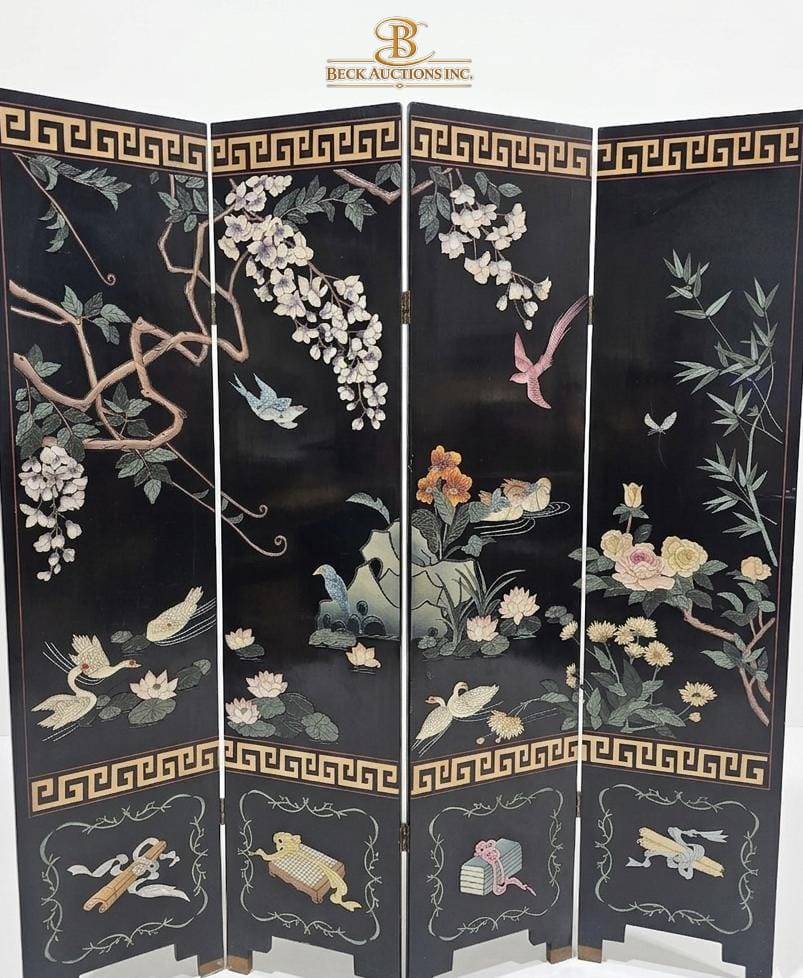 This four-panel room divider measures 65 inches in width and 72 inches in height, offering both functionality and artistry. Crafted from lacquered wood, each panel displays intricate nature motifs, including birds, flowers, and elegant scrollwork. The design showcases a rich combination of textures and colors, creating a dynamic centerpiece. A Greek key pattern further enhances its decorative appeal along the top and bottom edges.