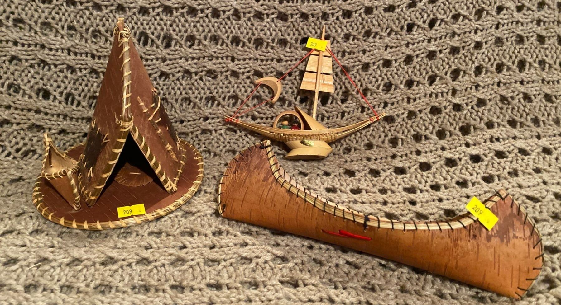 Handmade Birch Canoe Teepee w/ Hand Carved Wood Sail Boat