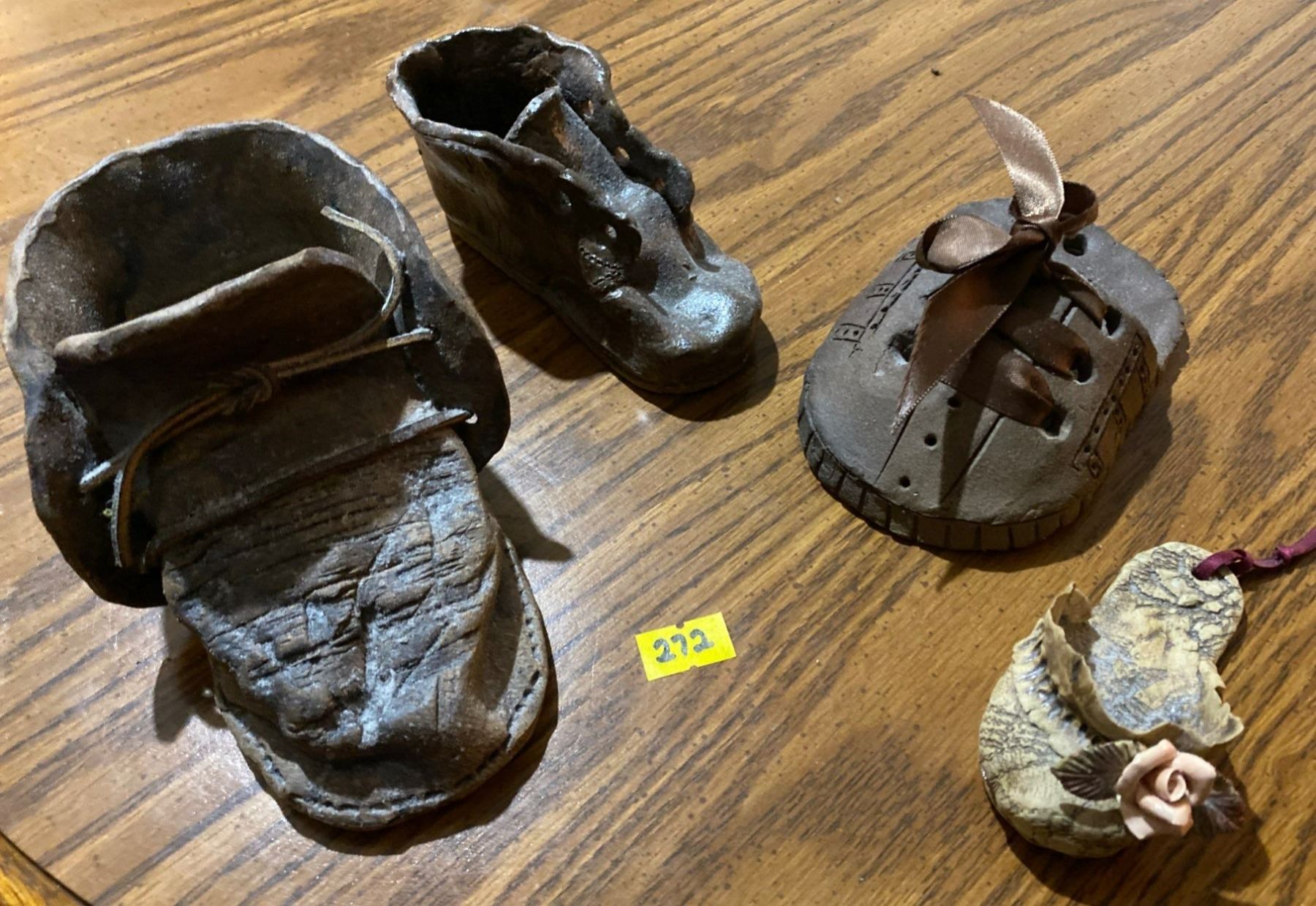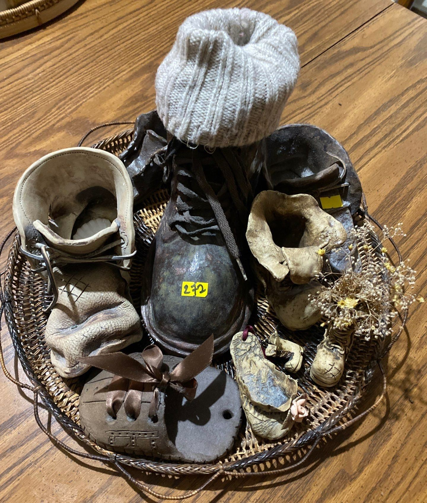 Handmade Ceramic Boot Decor on Rattan Tray Florals