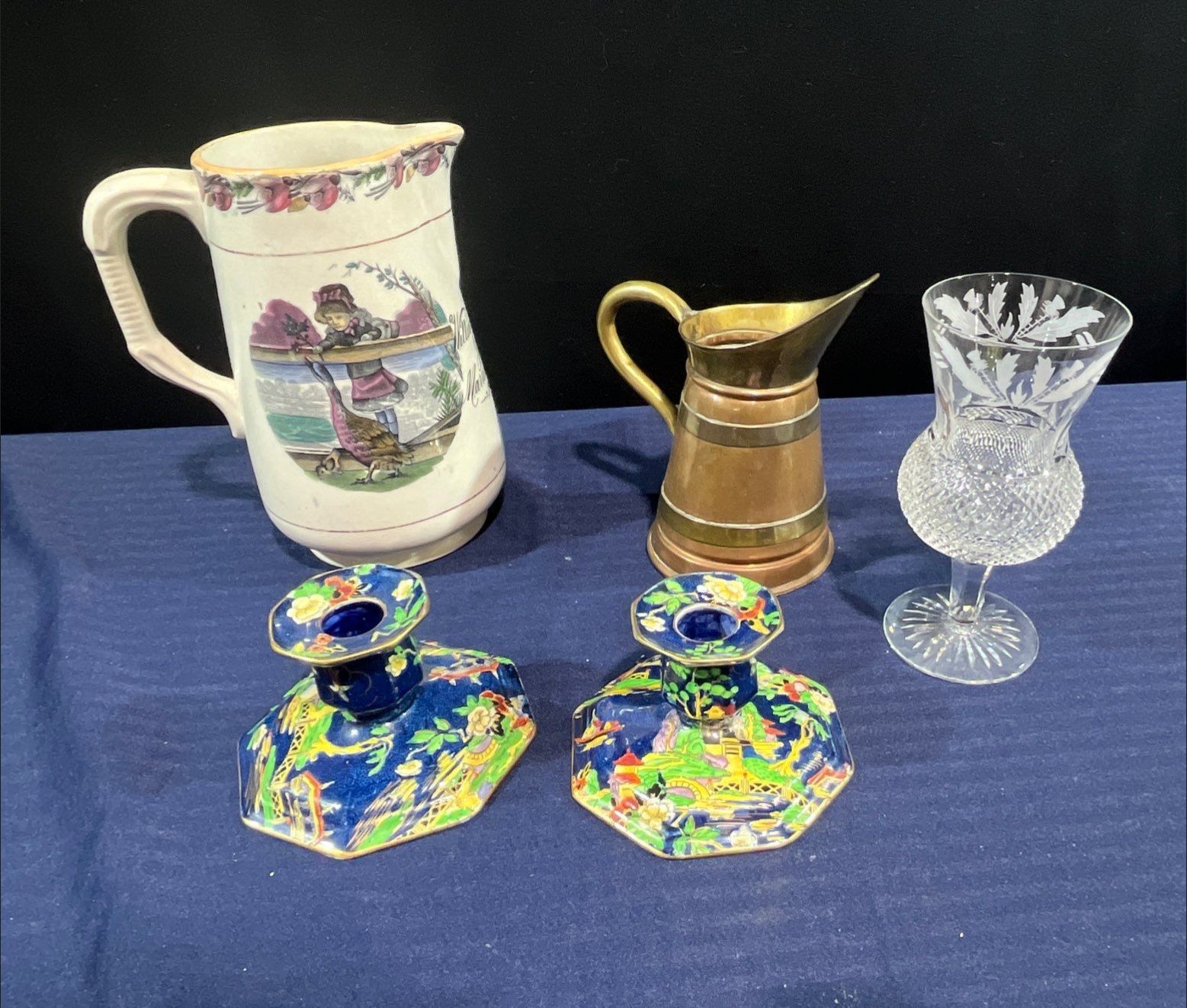 Handpainted Candle Holders, Crystal Cup, Brass and Porcelain Pitchers