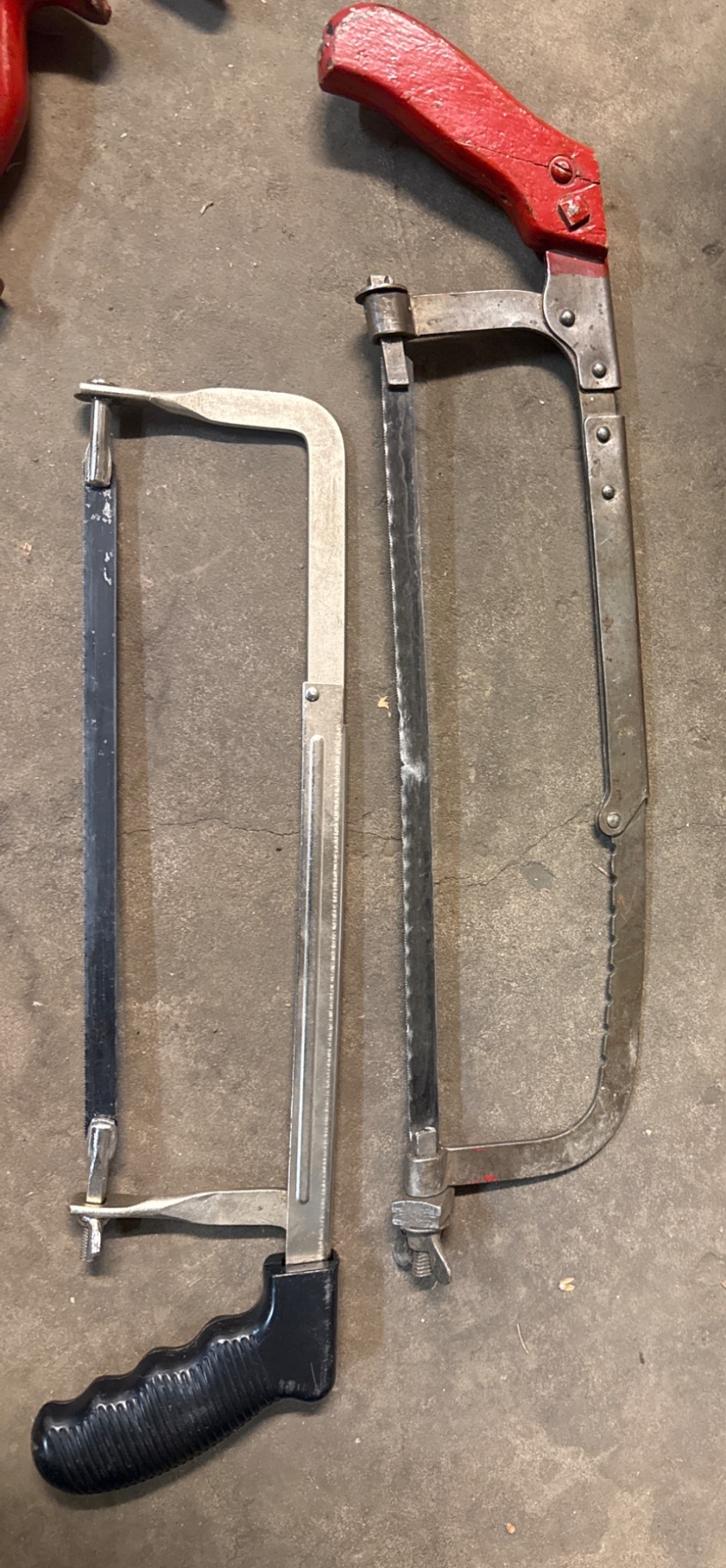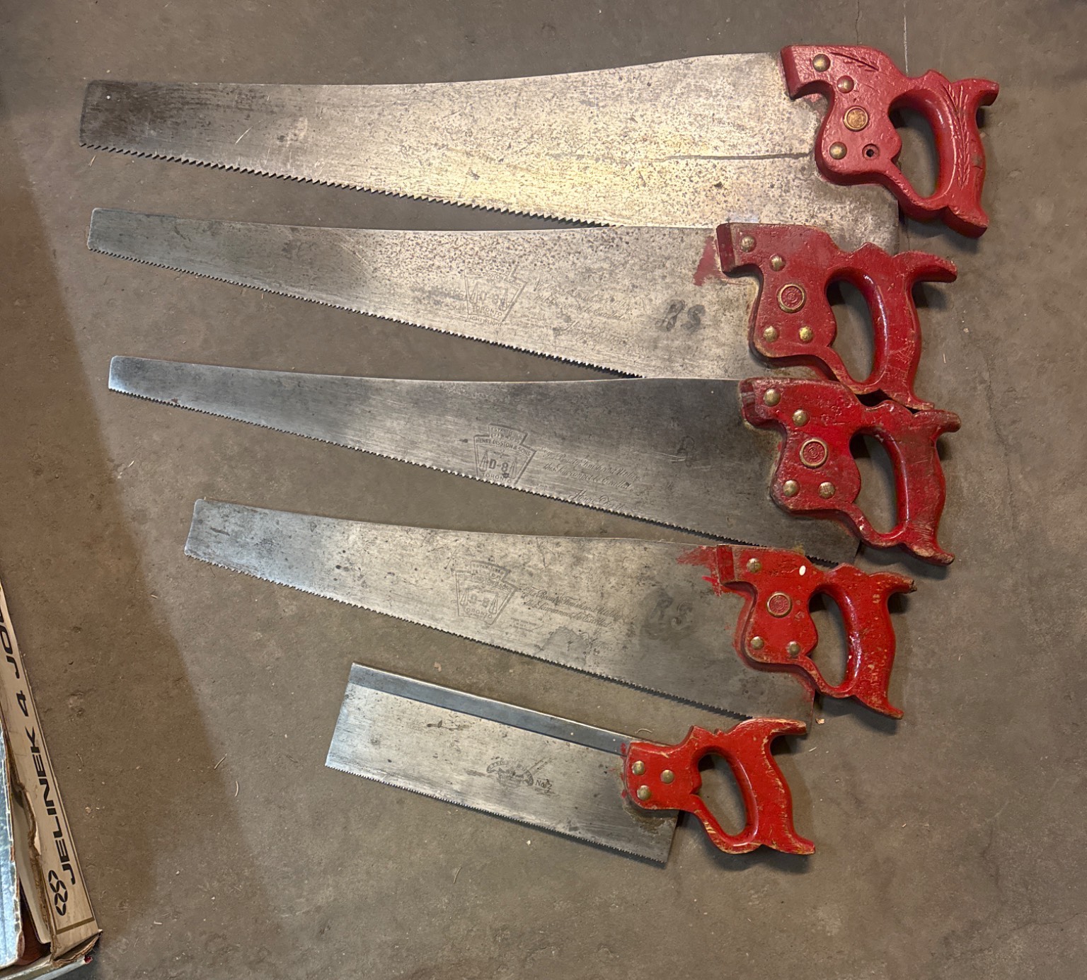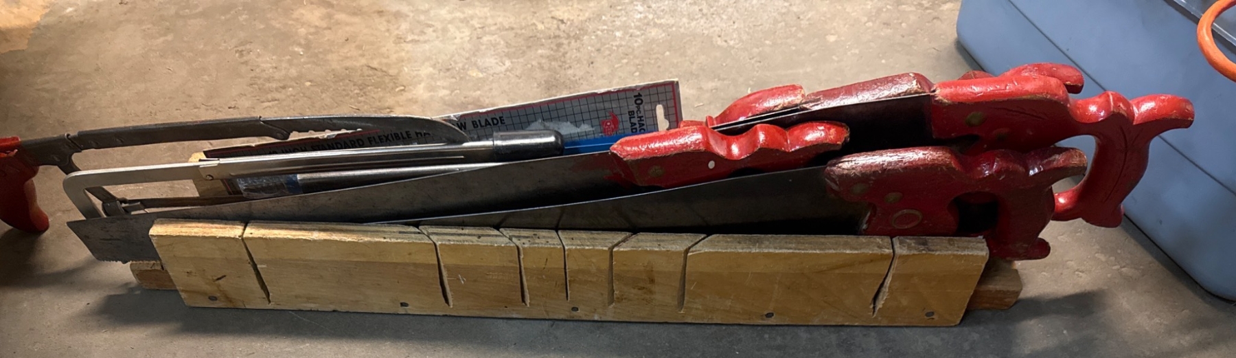Six handsaws, each featuring vibrant red wooden handles and varying blade lengths, approximately 24–30 inches. Includes a wooden sawing block (approx. 24x6x4 inches) for steady cutting. Also includes two metal-handle hacksaws (approx. 10–12-inch blades). Items exhibit wear consistent with prior use, ideal for woodworking enthusiasts or collectors.