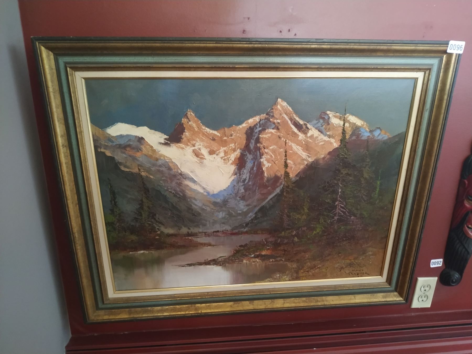 Artist: Hans Grabner Size: 29"H x 38"W Medium: Acrylic on Canvas Edition: Original Condition: Excellent Signature: Signed, Lower Right Description: Framed canvas painting of Alpine Vista with a lake. Hans Grabner (20th Century) is known for Landscape painting.
