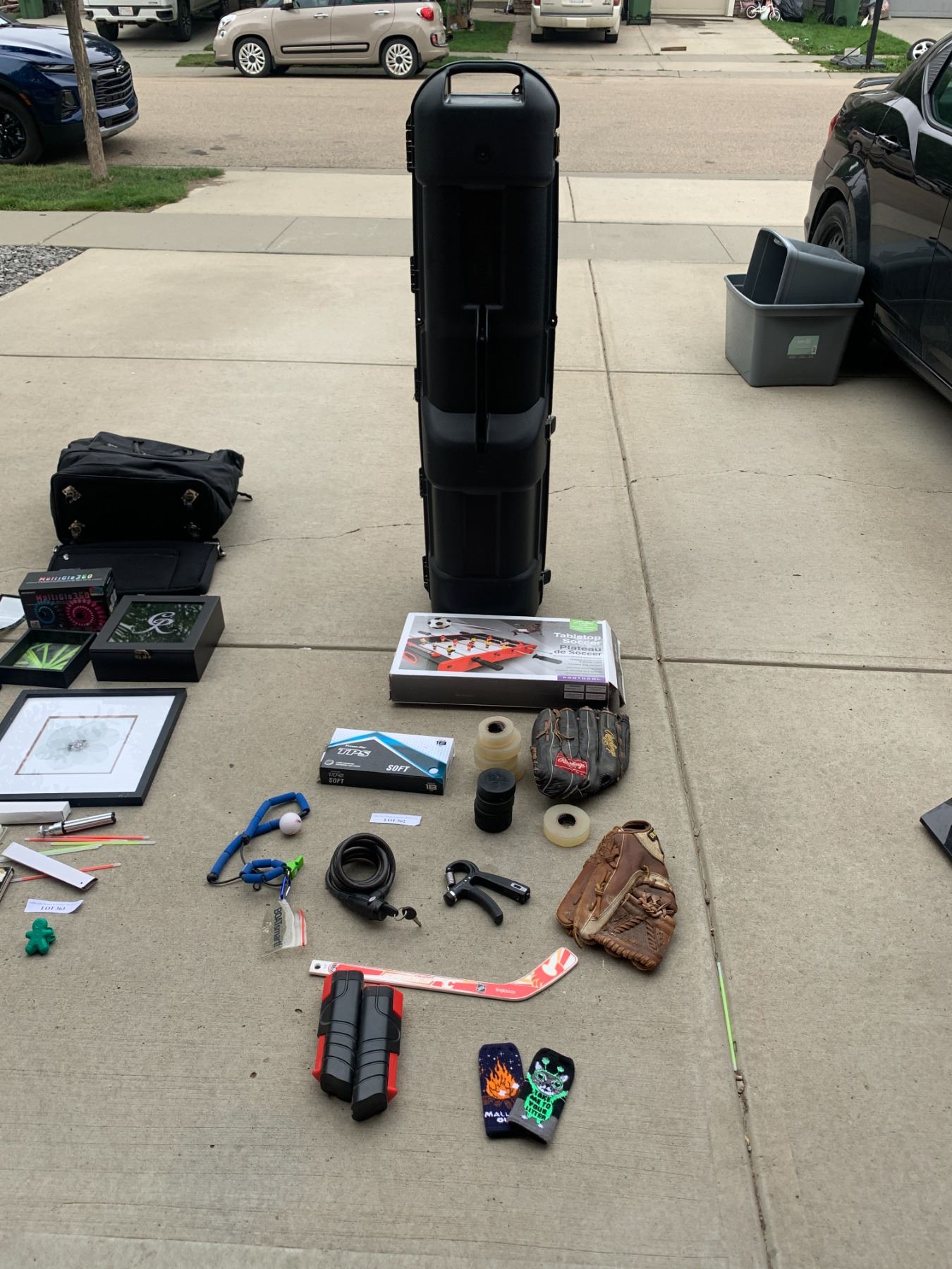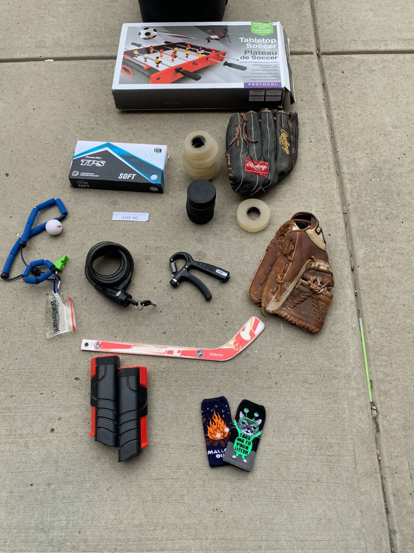 Hard Cover Golf Travel Bag, Power Bilt Golf Balls, Tabletop Soccer, Bell Bike Lock, Mizuno & Rawlings Leather Baseball Gloves, Picks, Hockey Tape, Beer Kuzzies etc