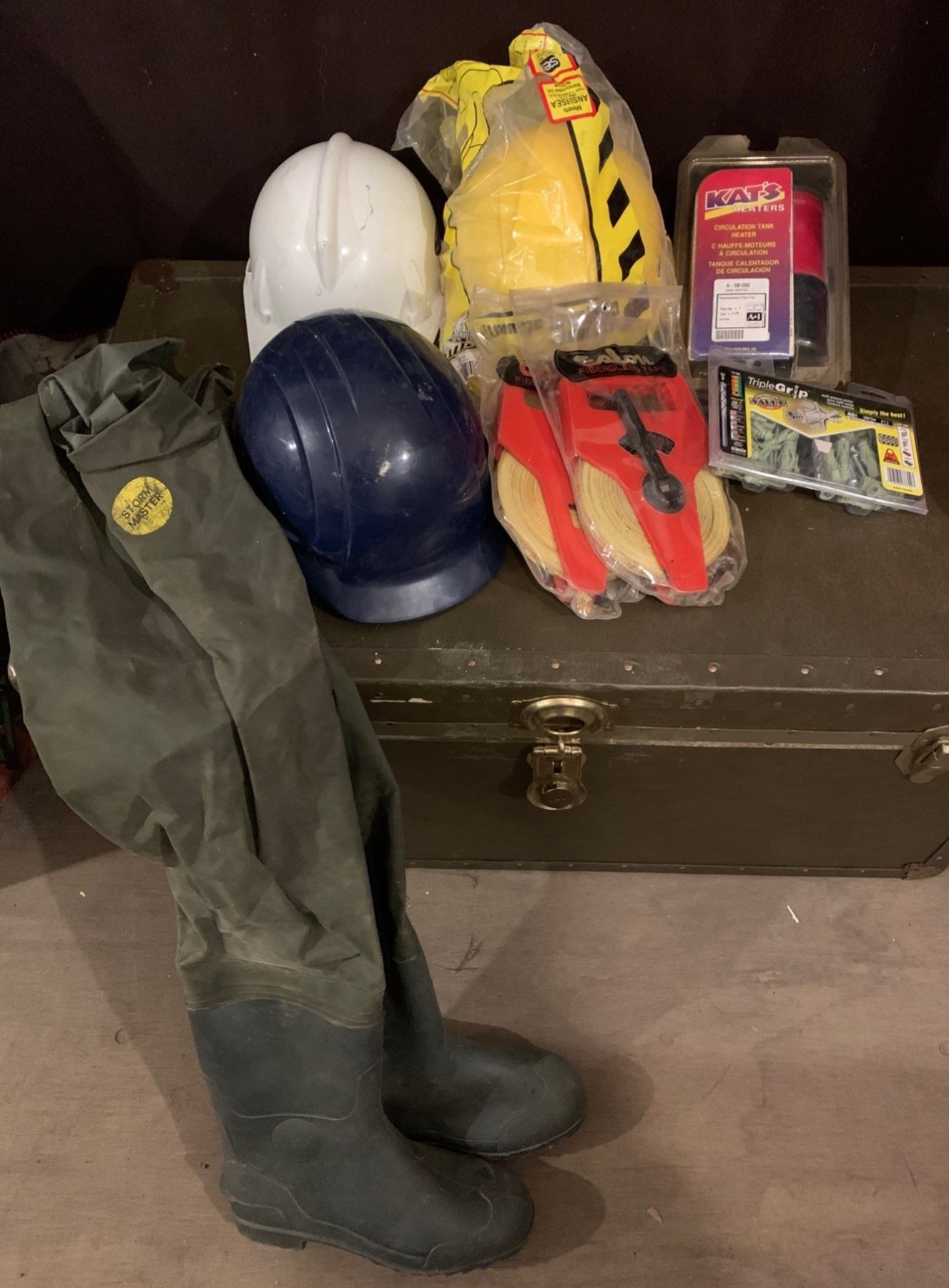 Hard Hats, Storm Master Rubber Boots (Size 11), Fiberglass Tape, Circulation Tank Heater & More