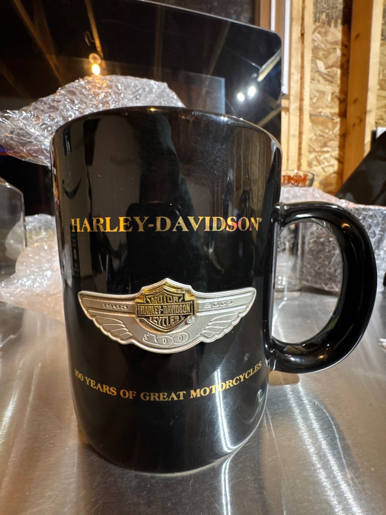 Harley Davidson, black and gold, hundred years of great motorcycles, coffee mug.