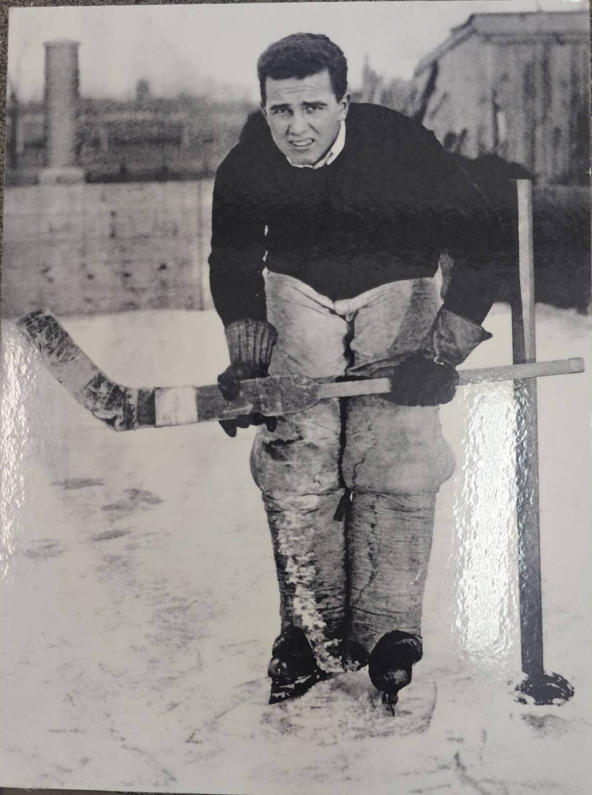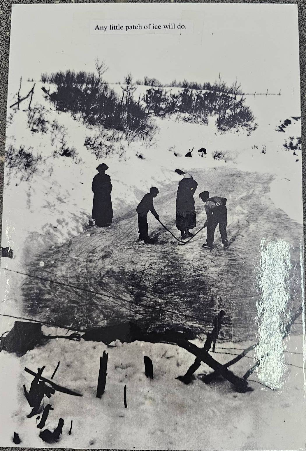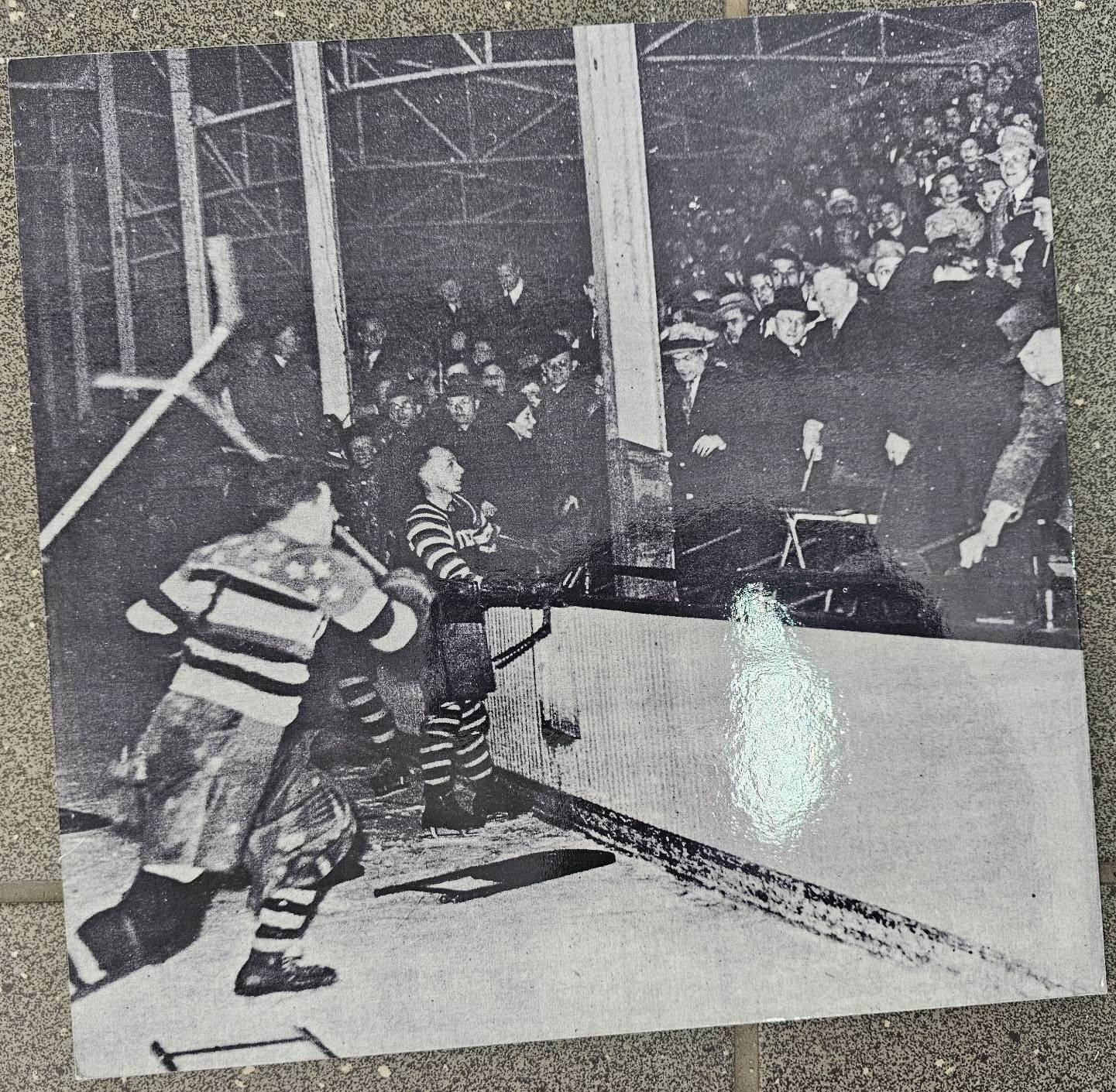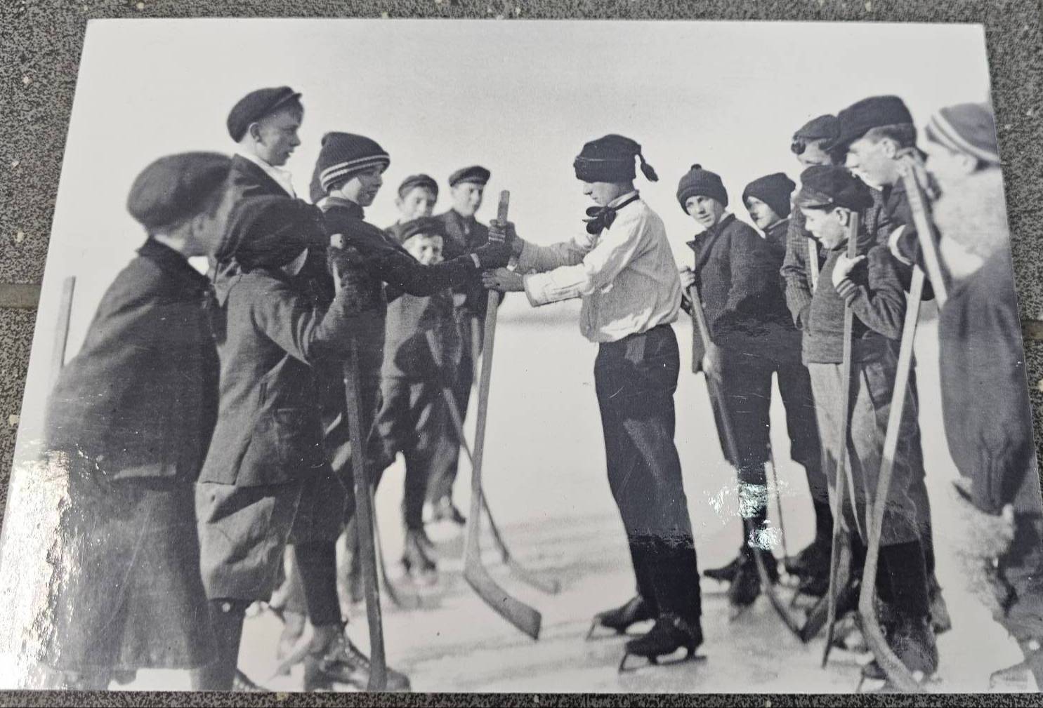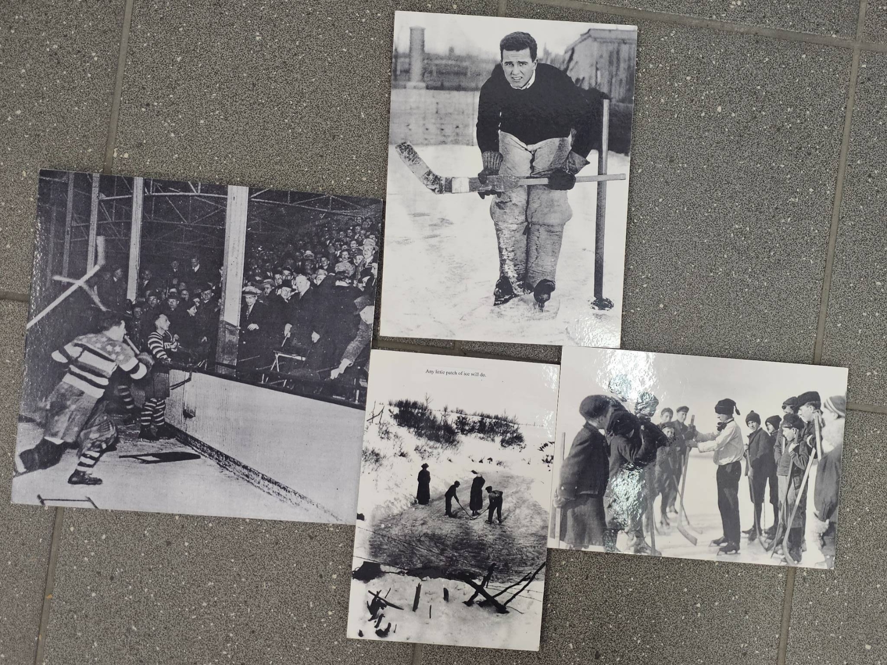 Four black-and-white hockey photographs, depicting scenes including a goalie in traditional hockey gear, an outdoor winter ice hockey game, a crowd during a game, and a ceremonial handshake between players. Images are mounted on cardstock, with handwritten markings on the reverse. Suitable for historical or sports memorabilia collections.