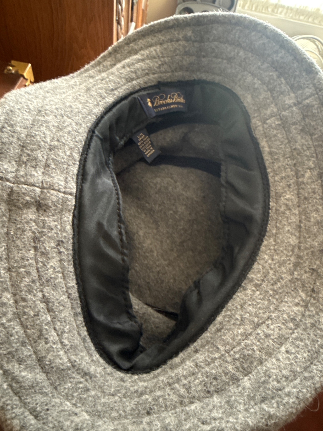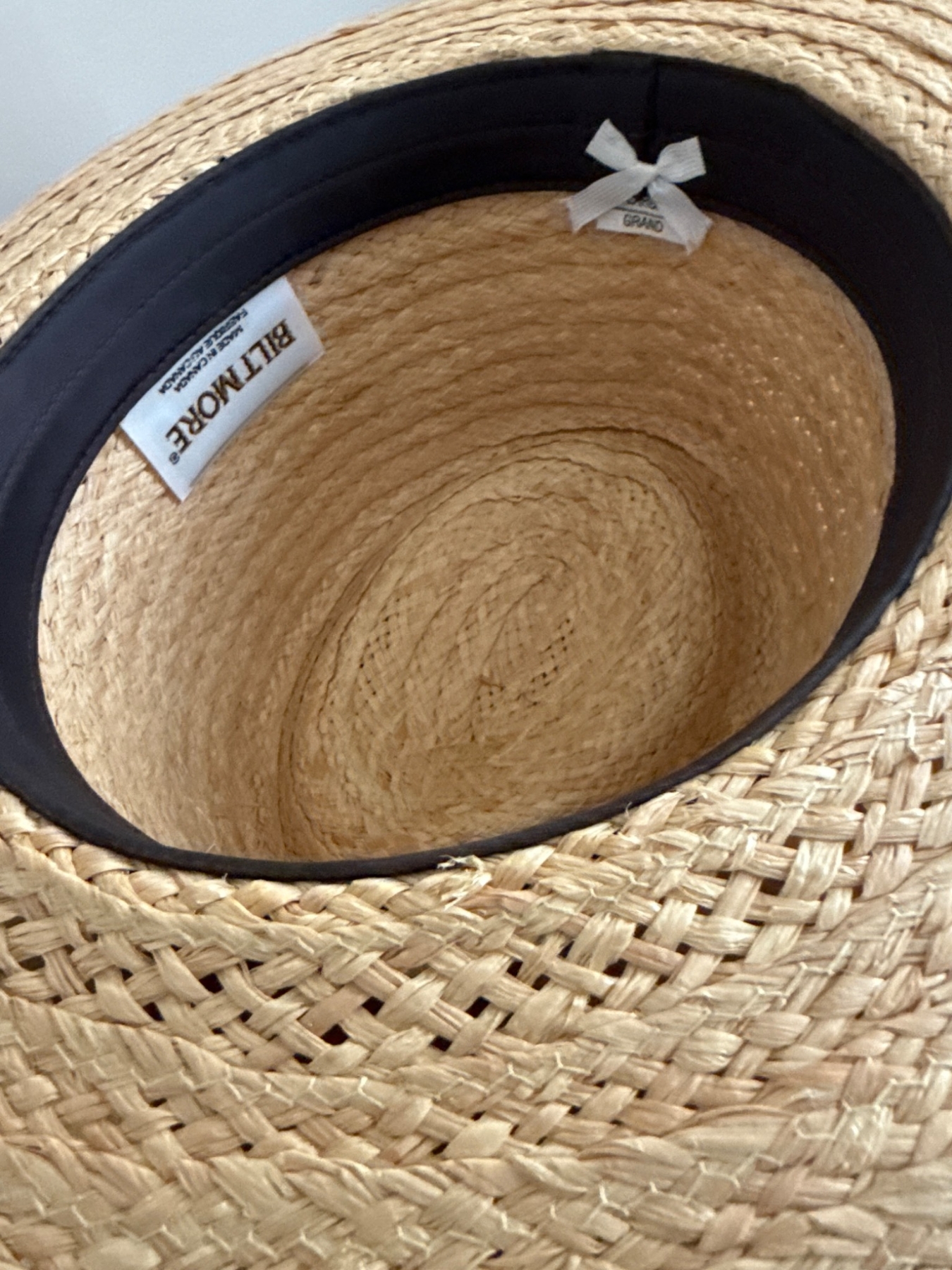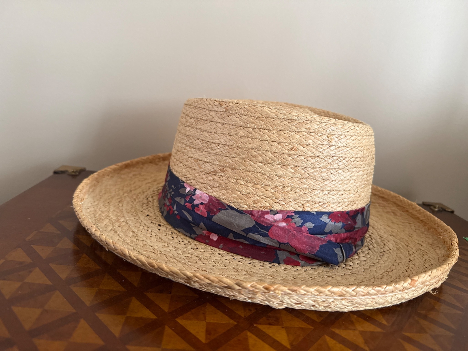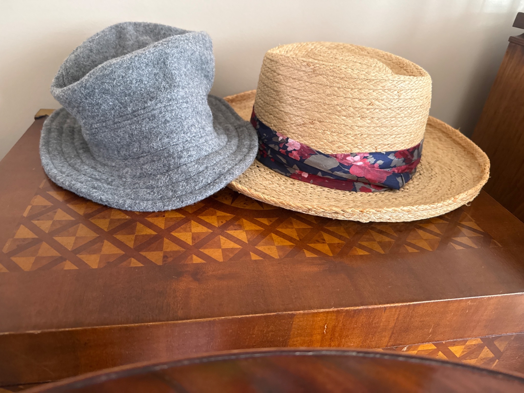One straw Betmar hat featuring a wide 14-inch brim accented with a blue floral-patterned ribbon, and one Pendleton wool bucket hat in heather gray. The straw hat is lightweight and breathable, while the wool hat is soft and ideal for cooler weather. Both hats feature interior liners for added comfort. Gently used condition.