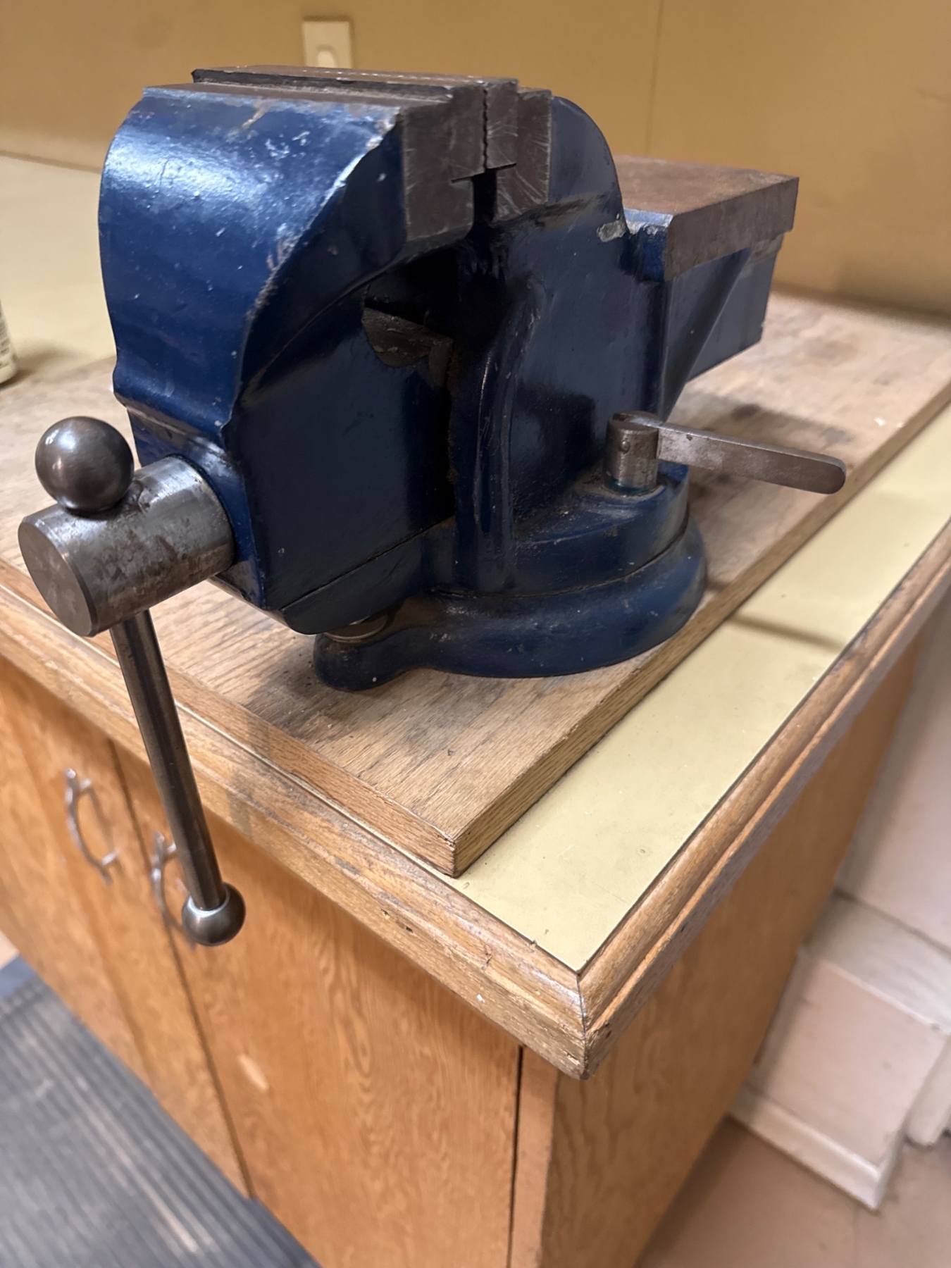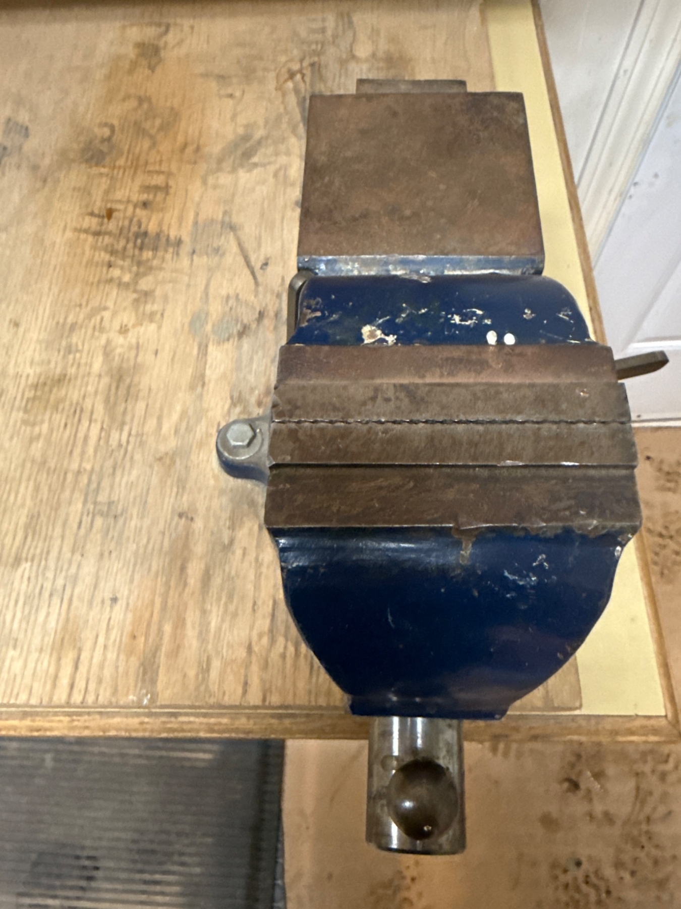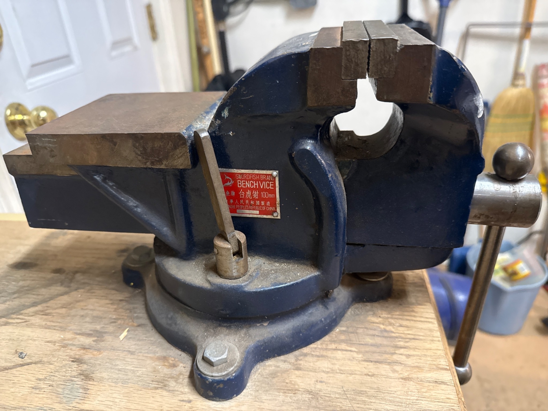 A durable, heavy-duty bench vice featuring a blue-painted finish. Constructed with robust metal, this tool offers a secure base and firm grip for various applications. Includes a smooth-operating handle for tightening and loosening. Measurements and exact weight not specified. Please note that removal is required; buyer is responsible for detaching from its current setup.