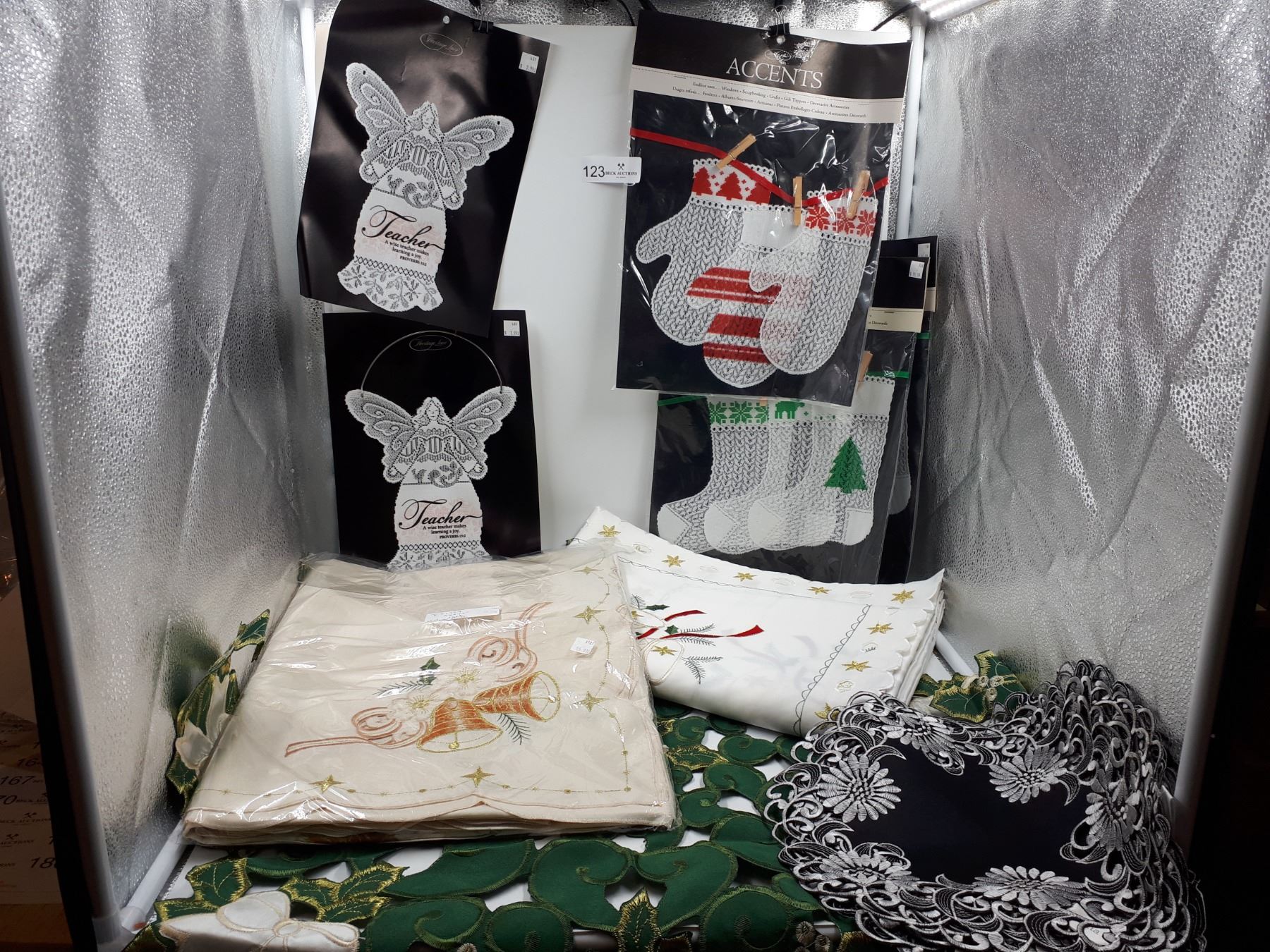 Heritage Lace Christmas table linens, all new made in the USA. Includes large white polyester tablecloth, large 54 x 72 inches linen cream coloured tablecloth (includes 8 matching placemats) 8 black and silver round placemats, 2 teacher angel lace wall hangings, and 4 stocking lace wall hangings, new in package. 1 green ornamental table cloth 32 x 32 inches.