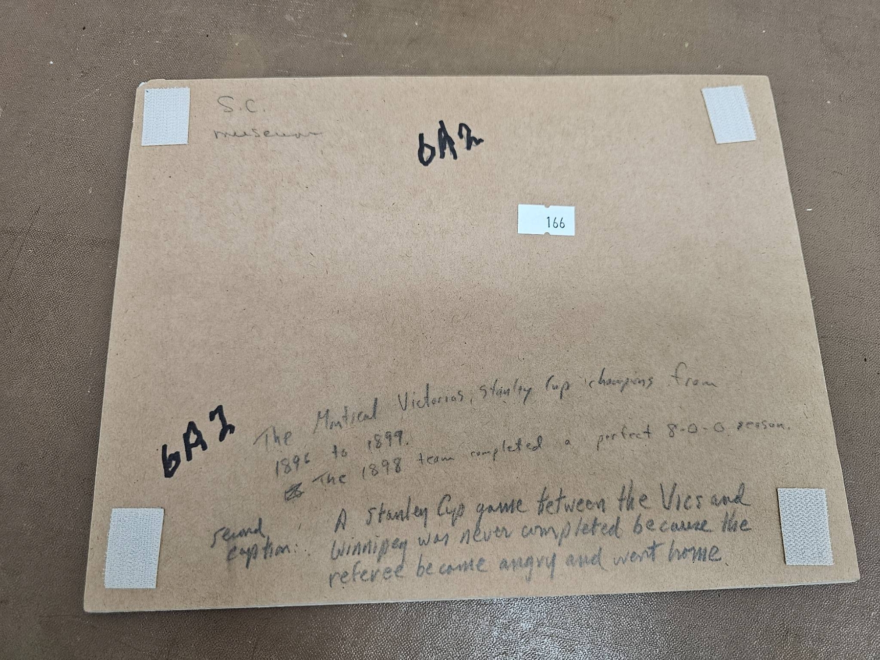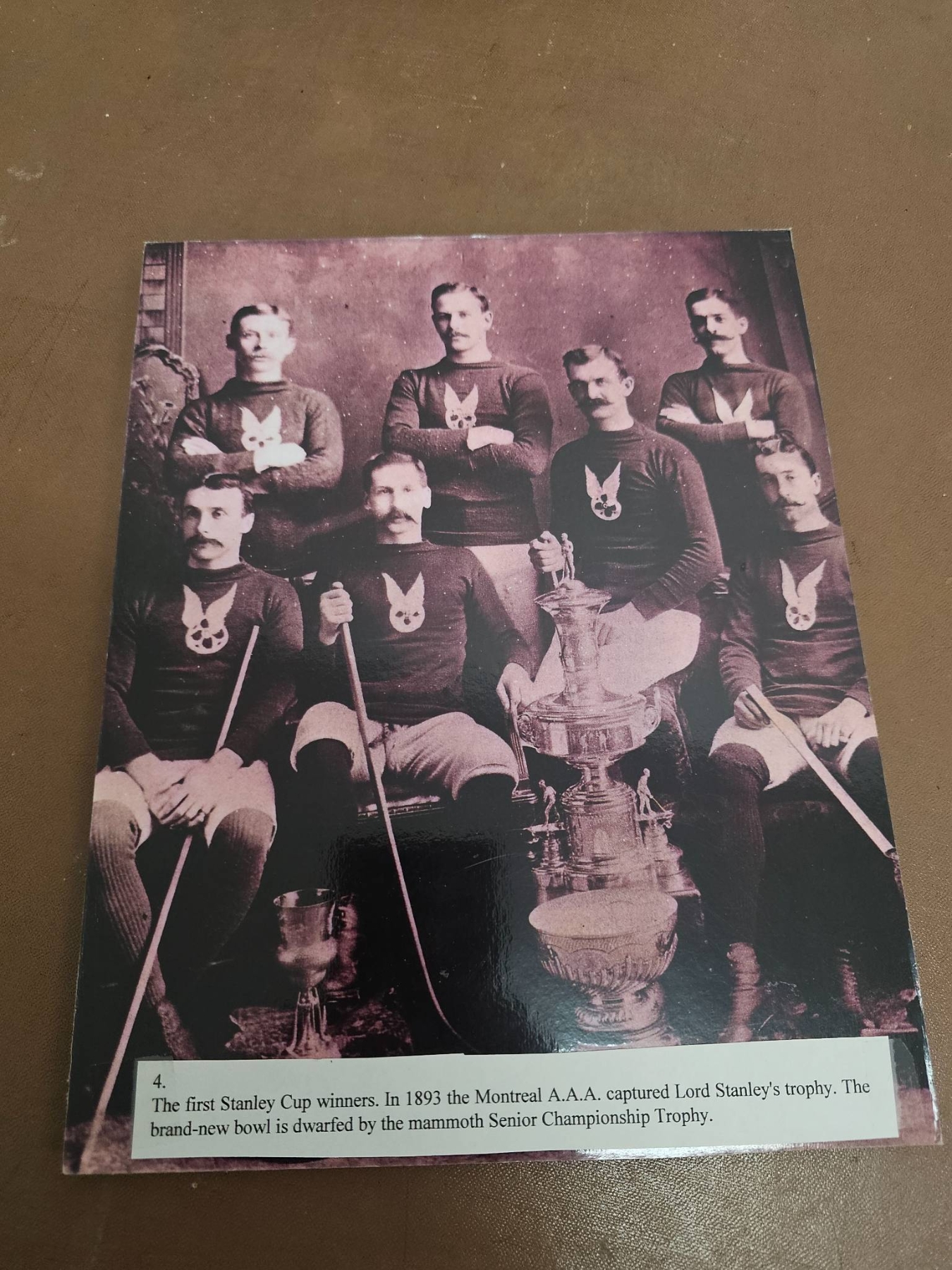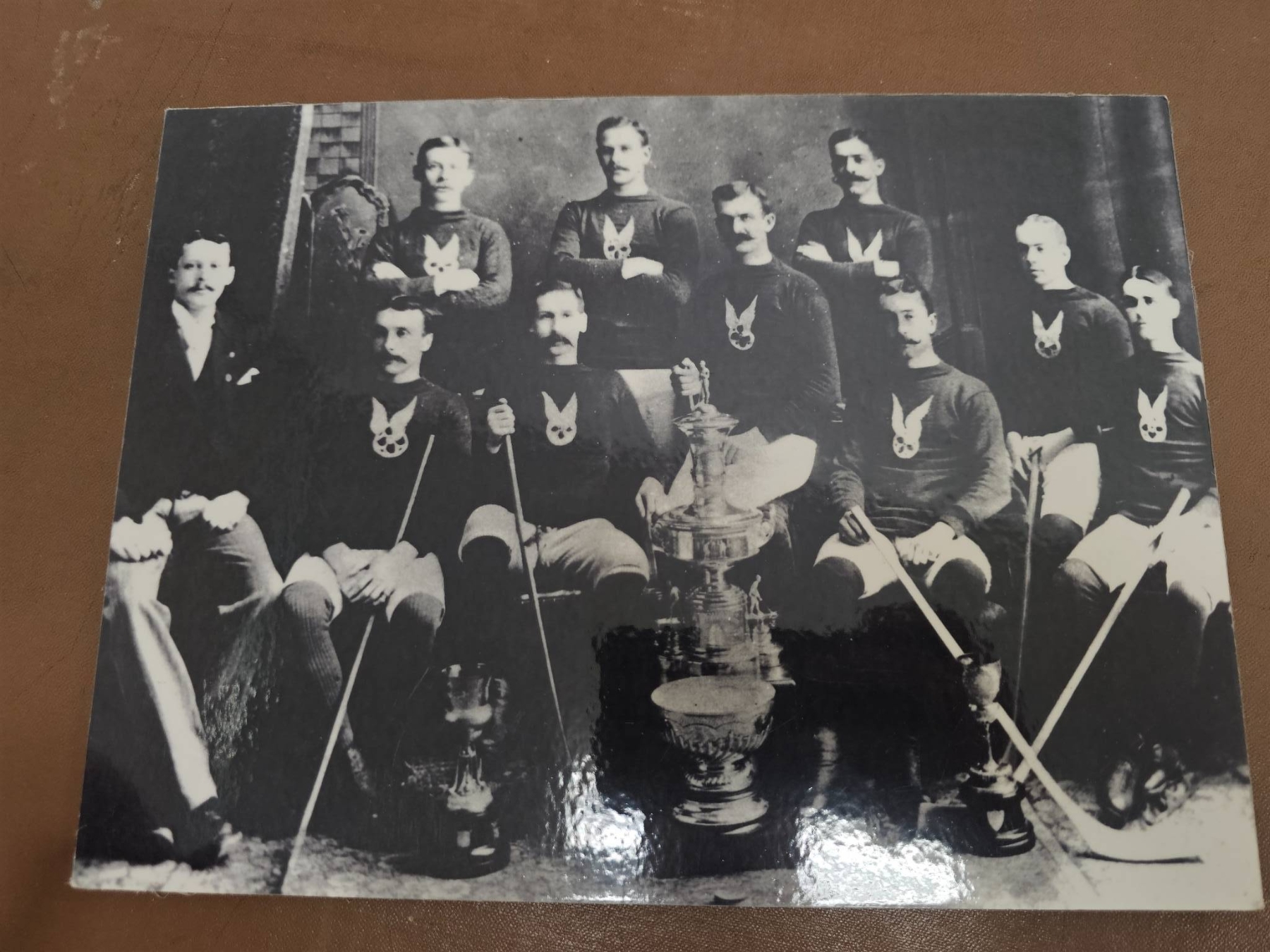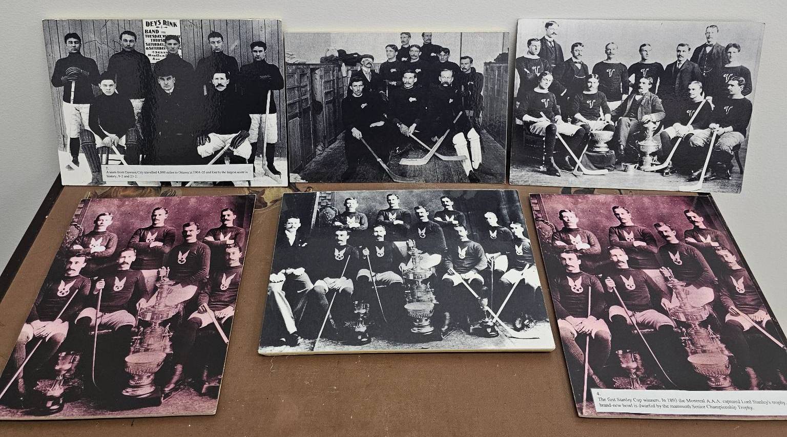 Six historical hockey team photographs capturing moments from early hockey history, including MLA AA 1st Cup Winners, 1893, and other notable teams. Some photographs feature detailed captions and handwritten notes on the back, providing historical context. These matte-finished images highlight players, trophies, and team setups, offering a glimpse into hockey's rich past.