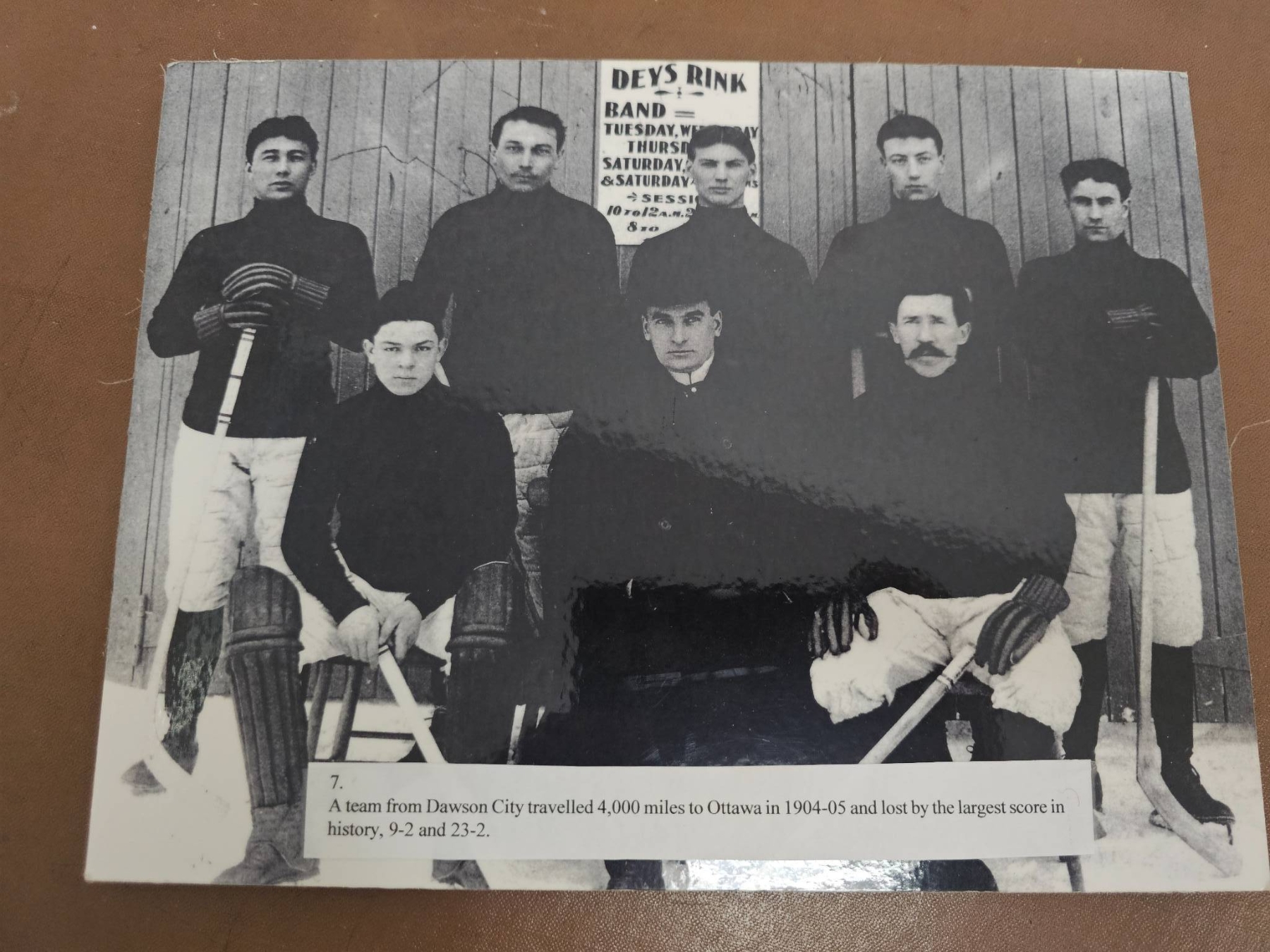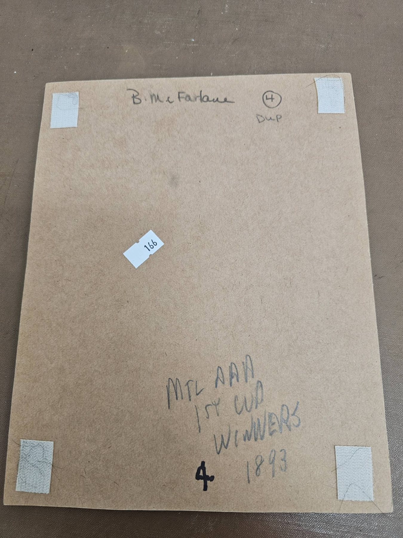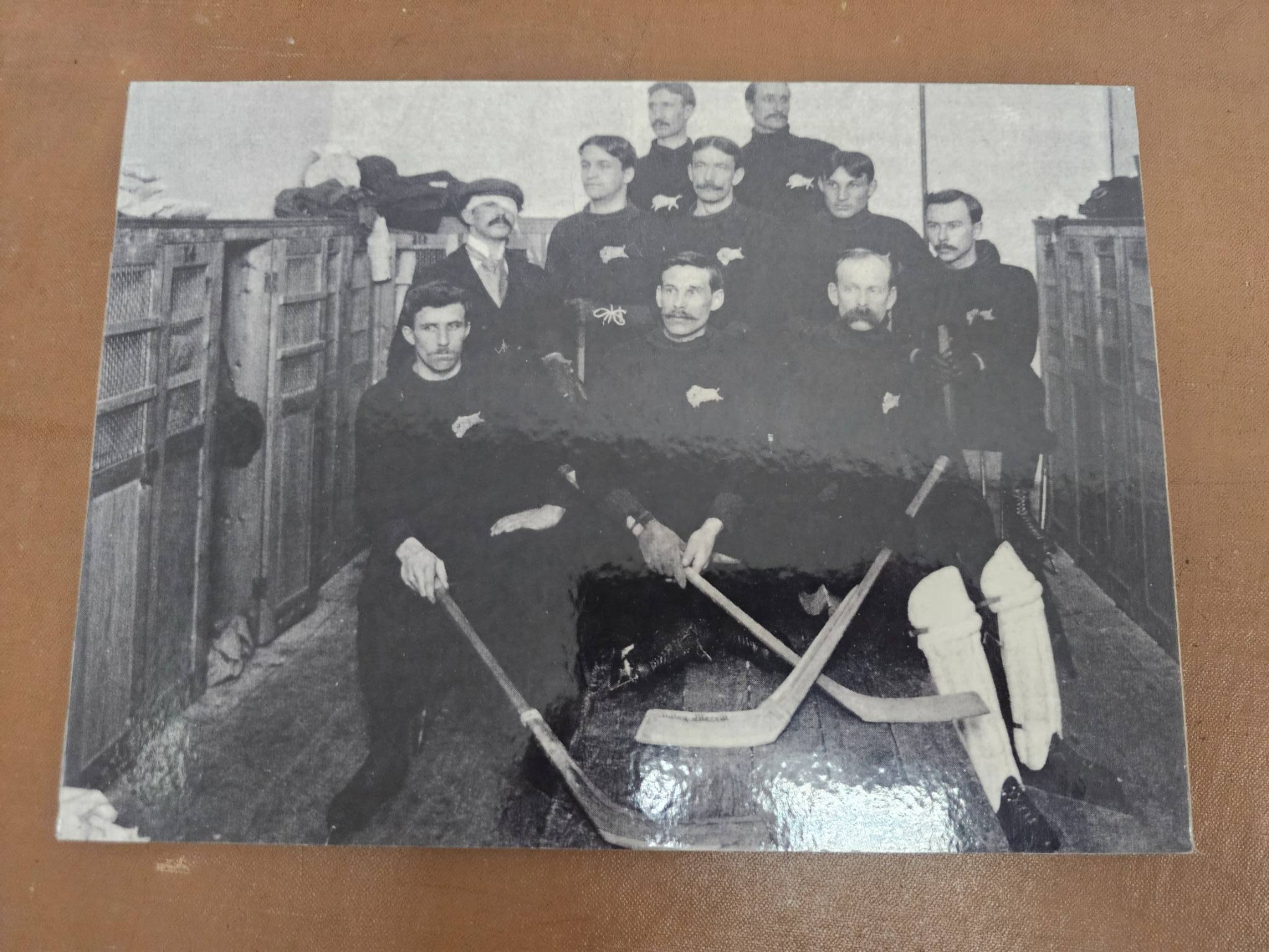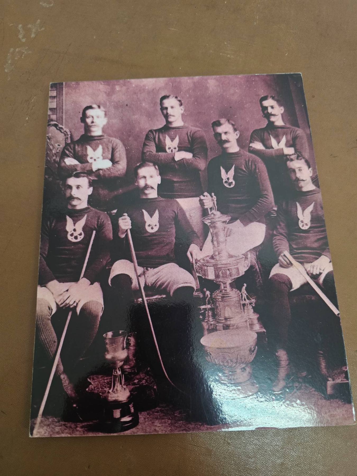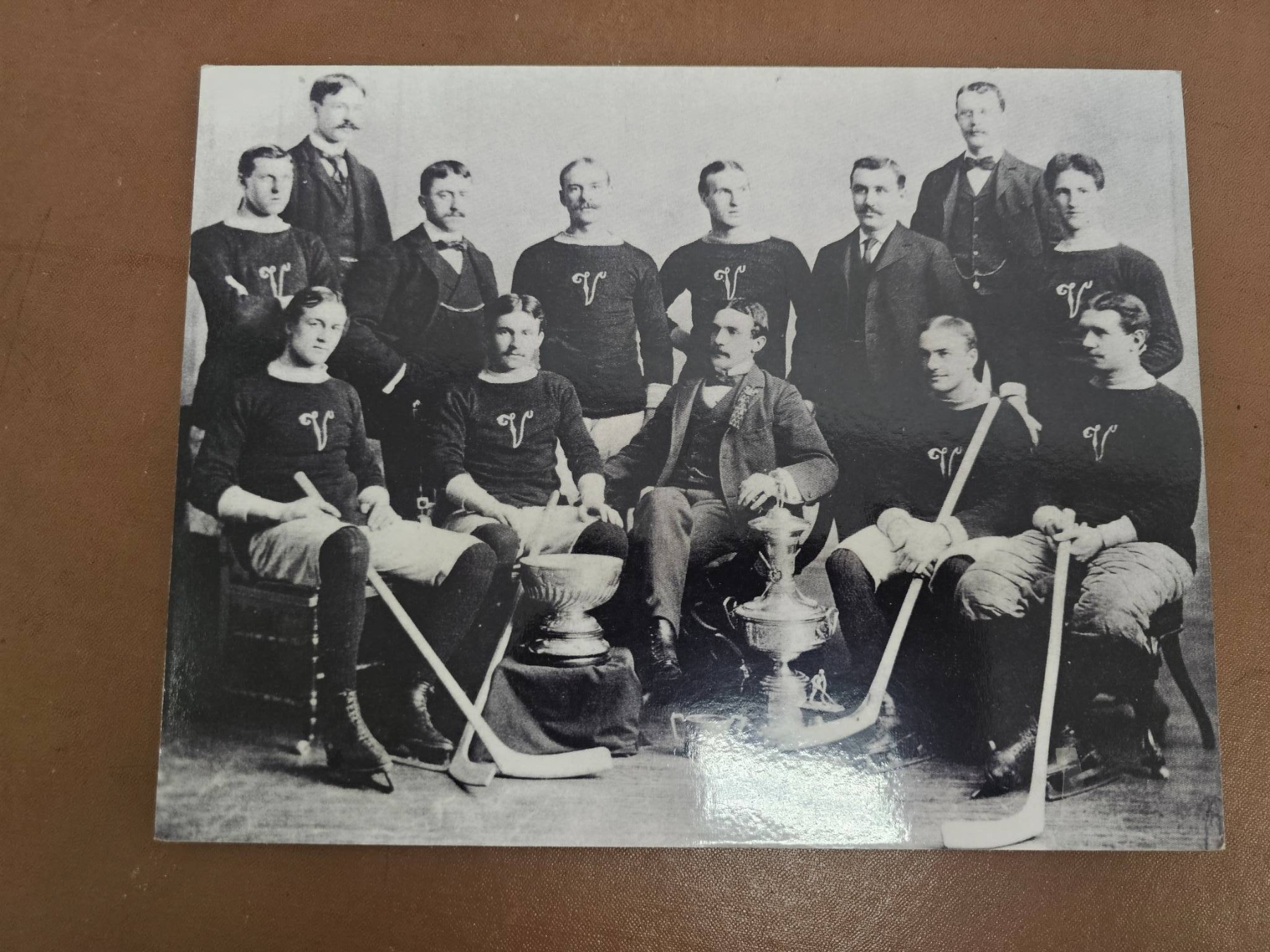 Six historical hockey team photographs capturing moments from early hockey history, including MLA AA 1st Cup Winners, 1893, and other notable teams. Some photographs feature detailed captions and handwritten notes on the back, providing historical context. These matte-finished images highlight players, trophies, and team setups, offering a glimpse into hockey's rich past.