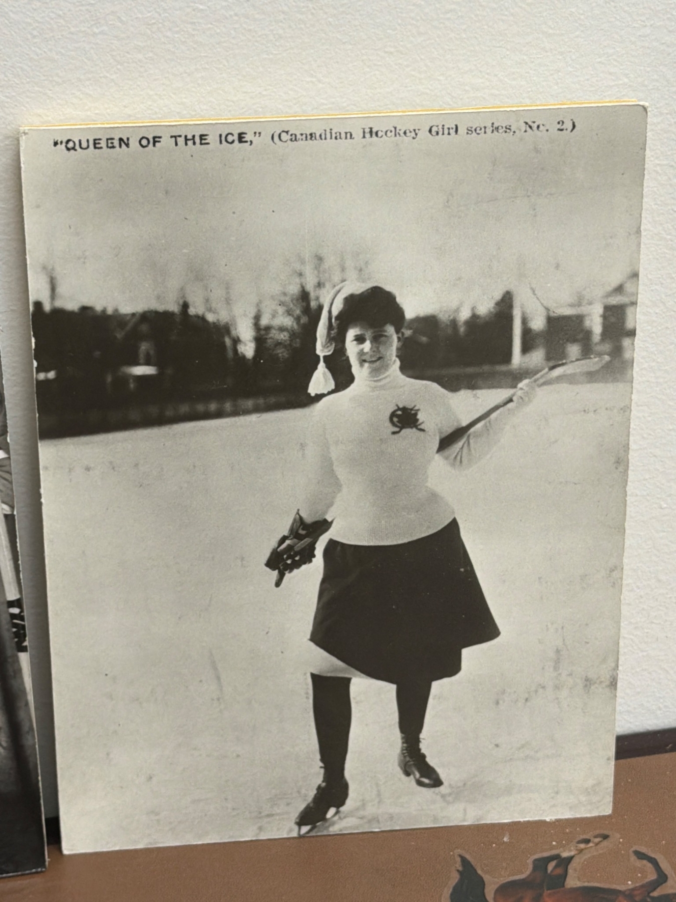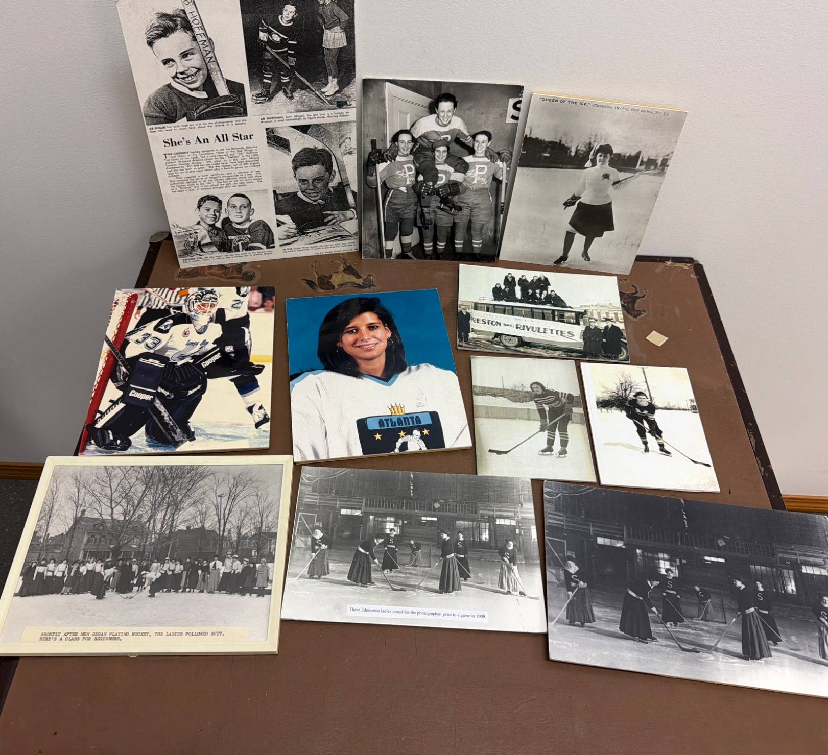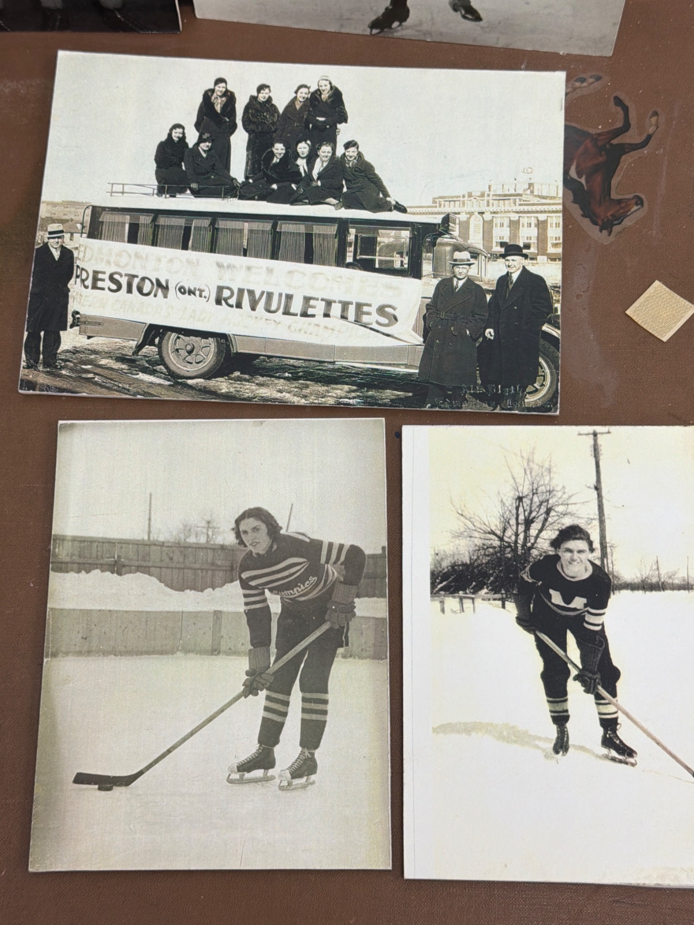 A unique assortment of ice hockey-related photographs and memorabilia, featuring historic images of women's hockey teams and players, including action shots, team portraits, and candid moments. Highlights include depictions of early 1900s women's hockey, classic skater uniforms, and a nod to the Preston Rivulettes. Ideal for sports history enthusiasts and collectors of vintage sports imagery.