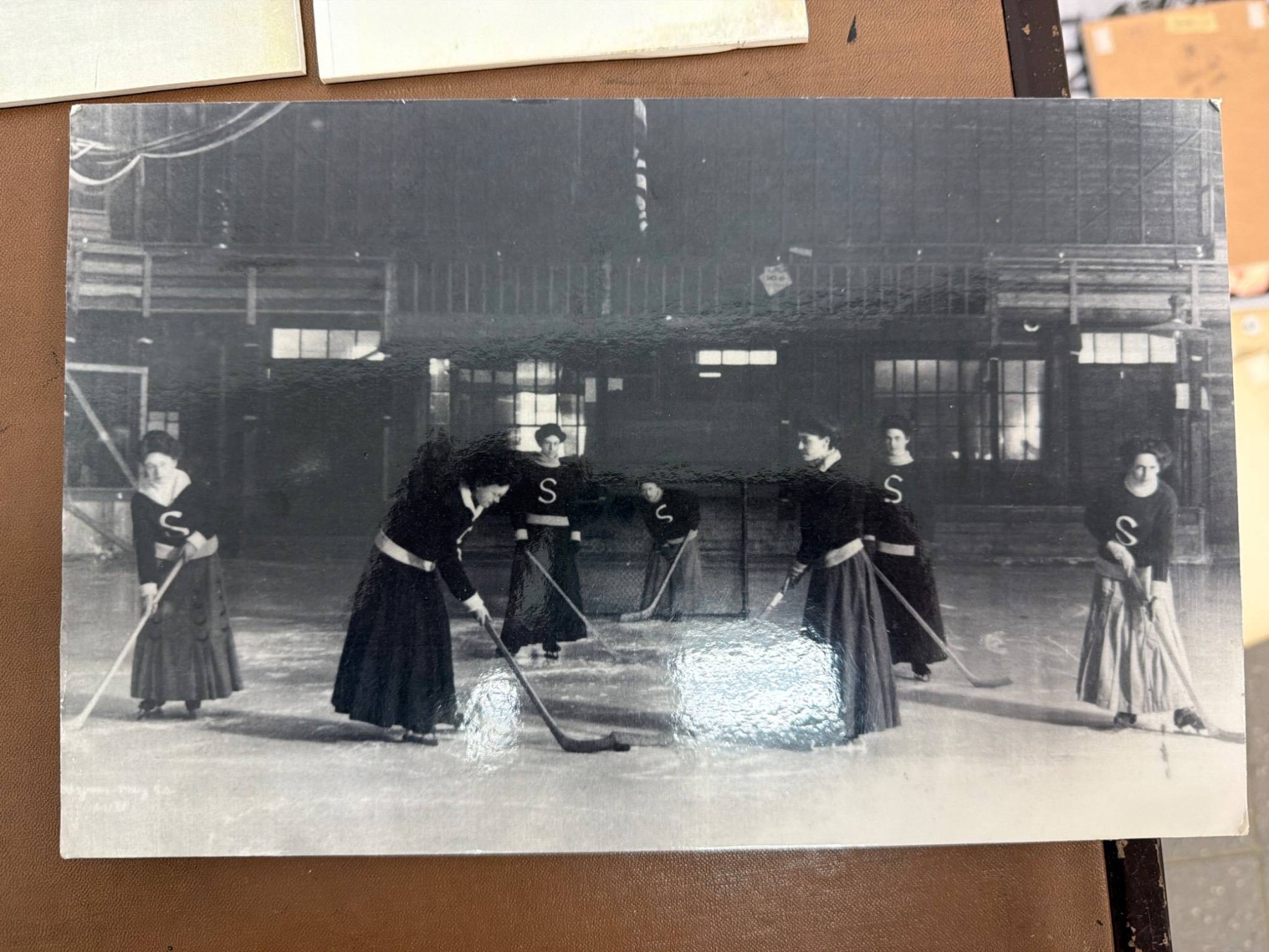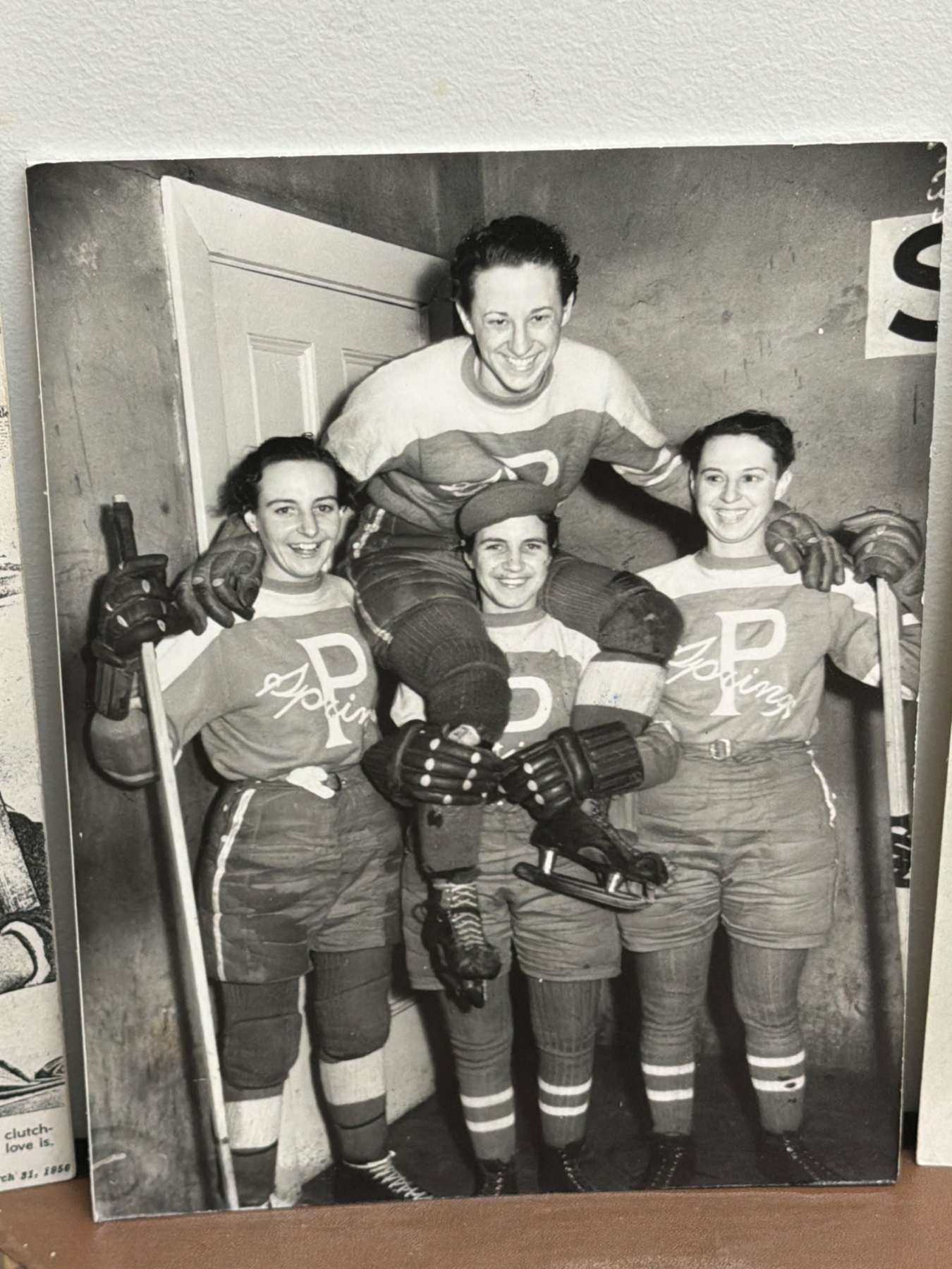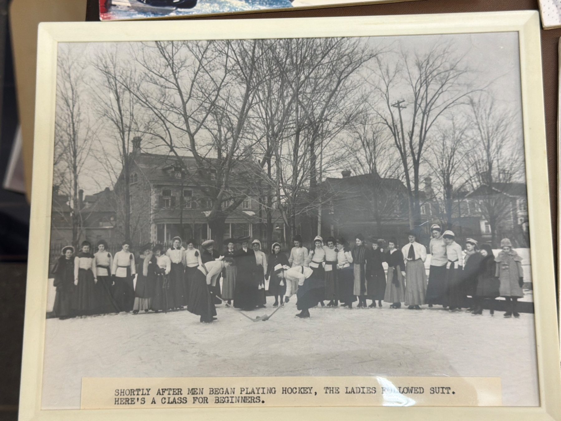 A unique assortment of ice hockey-related photographs and memorabilia, featuring historic images of women's hockey teams and players, including action shots, team portraits, and candid moments. Highlights include depictions of early 1900s women's hockey, classic skater uniforms, and a nod to the Preston Rivulettes. Ideal for sports history enthusiasts and collectors of vintage sports imagery.