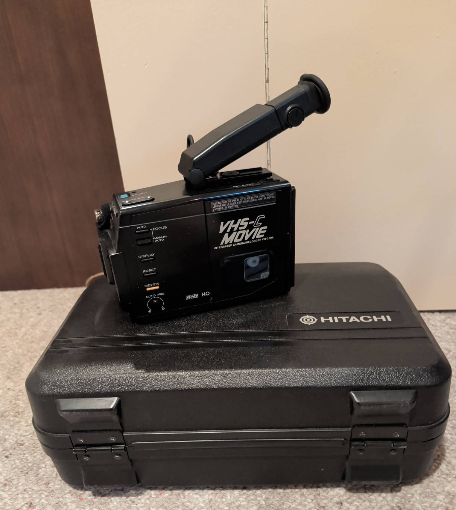 Hitachi VHS-C camcorder, model VHSC Movie, ideal for capturing analog video memories. Includes a sturdy Hitachi-branded hard carrying case for safe storage and portability. Features include a foldable viewfinder and compact design. Dimensions and detailed features are not specified, ensuring you receive the essentials for retro videography.