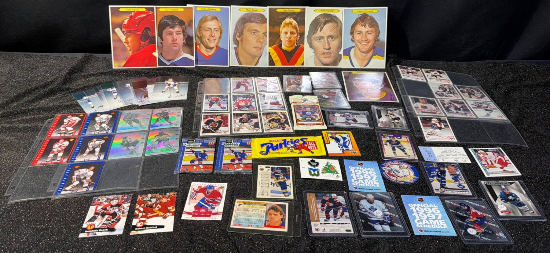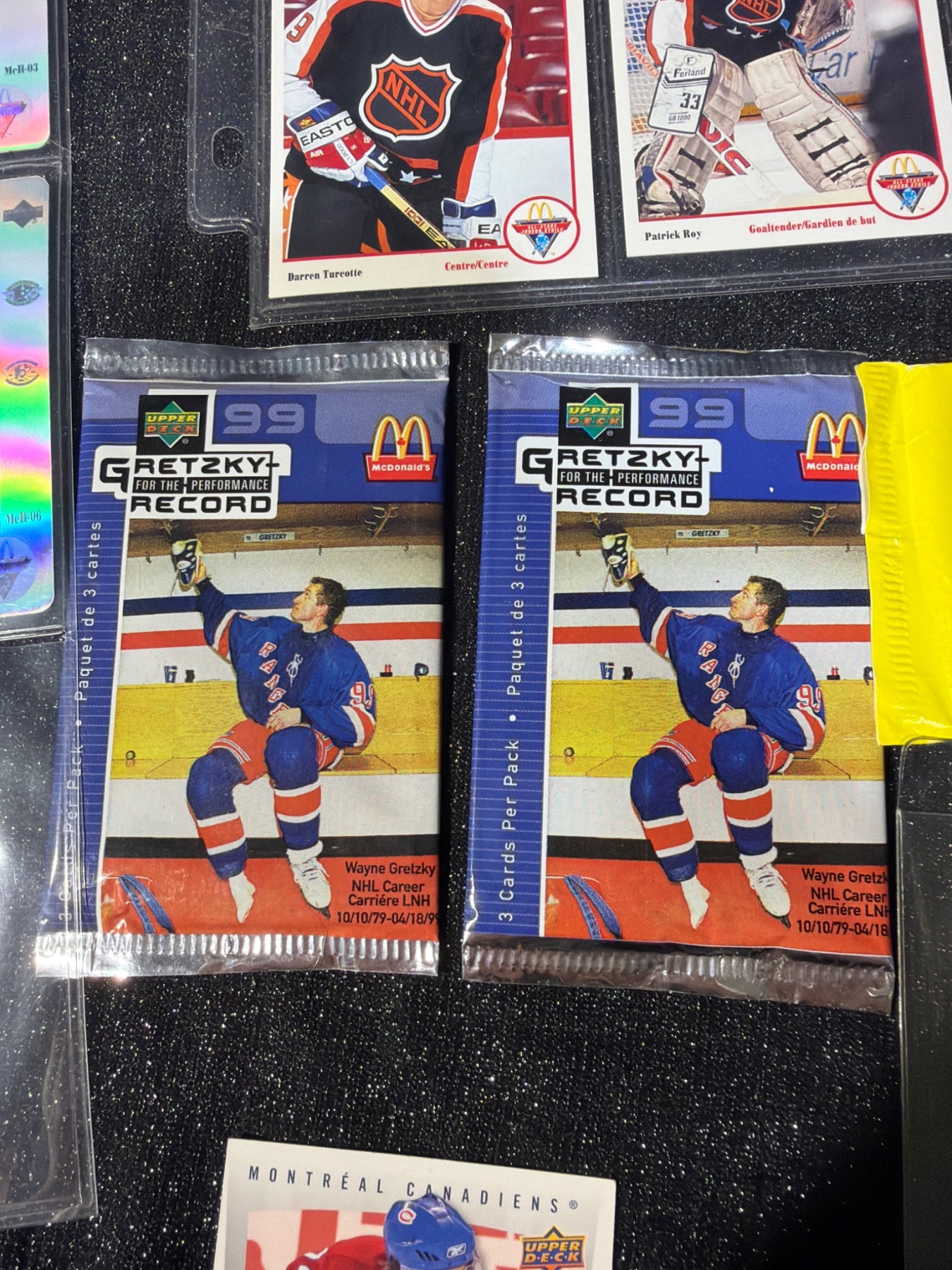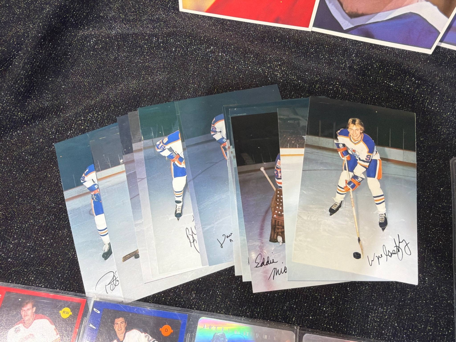 A diverse assortment of hockey memorabilia featuring collectible hockey cards and signed Edmonton Oilers postcards, including Wayne Gretzky. Includes unopened packs, protective sheets, and signed postcards showcasing action shots from Gretzky’s career. Some cards are preserved in sleeves for protection. The lot is ideal for collectors of hockey memorabilia or fans of Gretzky and the Oilers. Dimensions of individual cards/postcards are standard trading card size, approximately 2.5 x 3.5 inches.