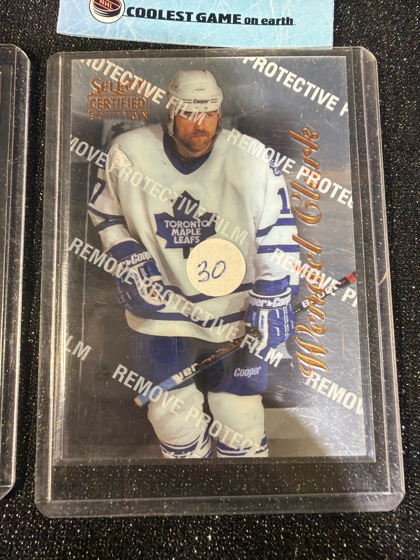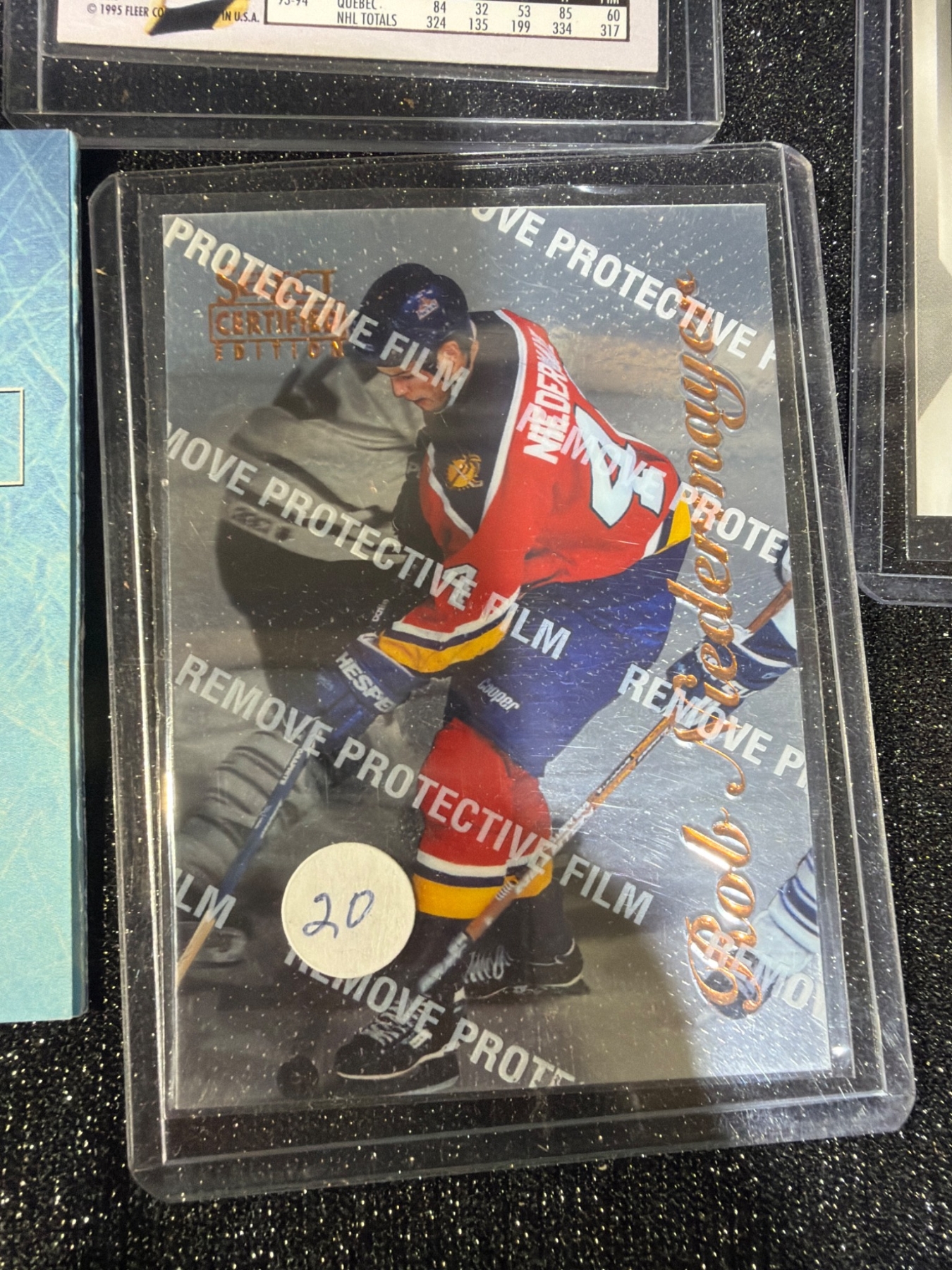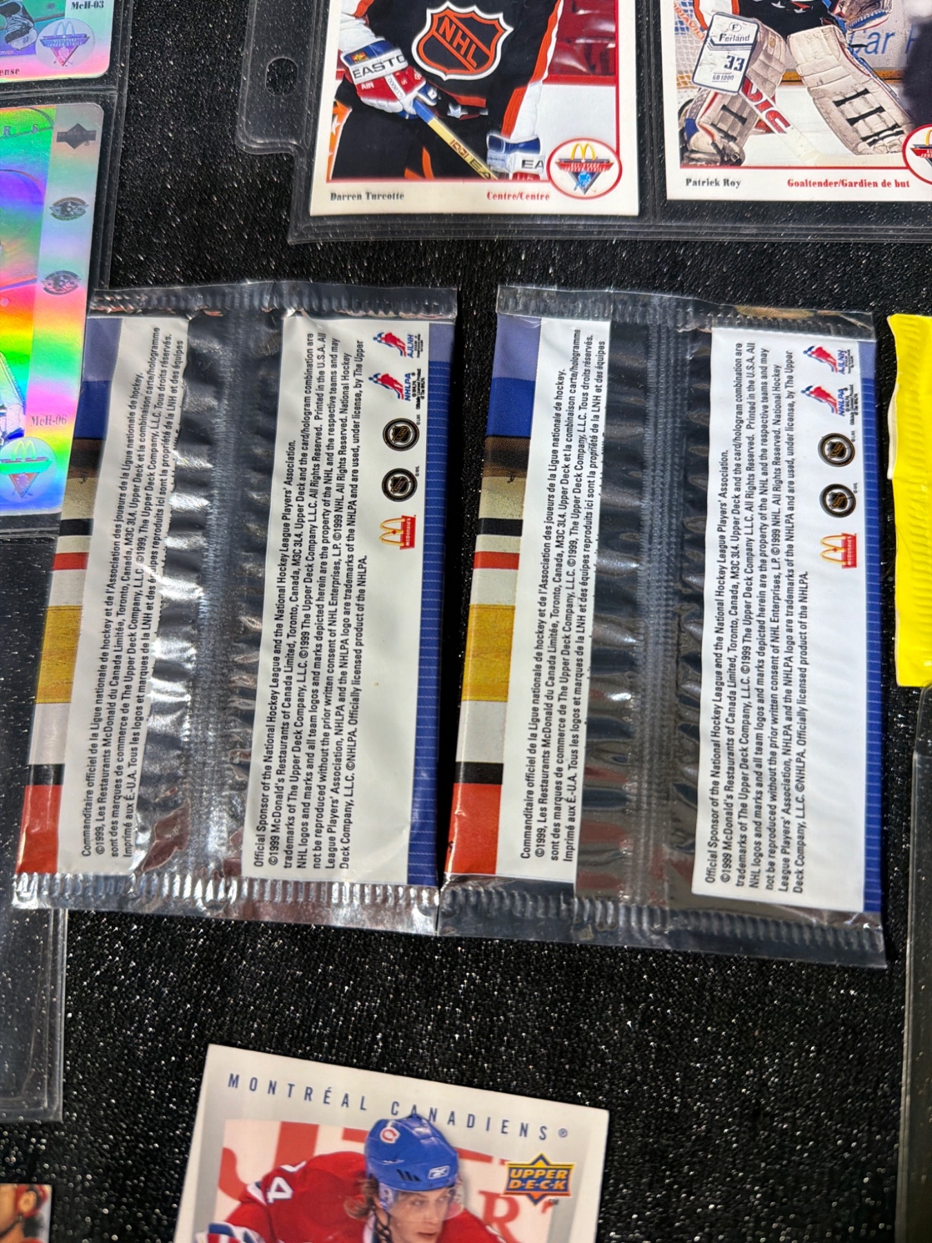 A diverse assortment of hockey memorabilia featuring collectible hockey cards and signed Edmonton Oilers postcards, including Wayne Gretzky. Includes unopened packs, protective sheets, and signed postcards showcasing action shots from Gretzky’s career. Some cards are preserved in sleeves for protection. The lot is ideal for collectors of hockey memorabilia or fans of Gretzky and the Oilers. Dimensions of individual cards/postcards are standard trading card size, approximately 2.5 x 3.5 inches.