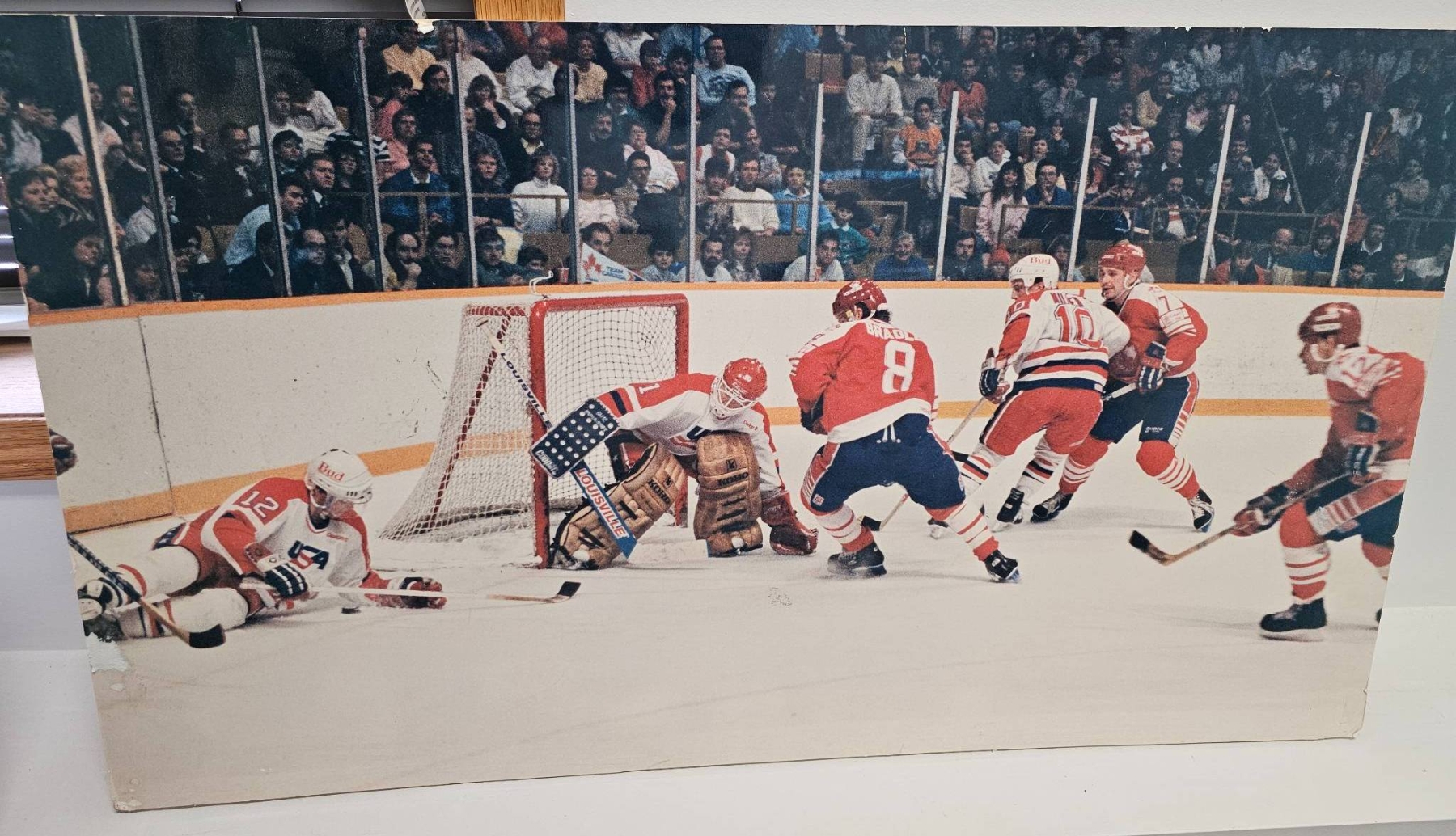 A canvas print measuring 36 inches in width and 21 inches in height showcasing an action-packed hockey game scene. This dynamic composition captures players mid-game, vividly portraying the intensity and energy of the moment. Perfect for hockey enthusiasts or sports decor collectors seeking a visually striking piece. Condition appears good with imagery remaining sharp and vibrant.