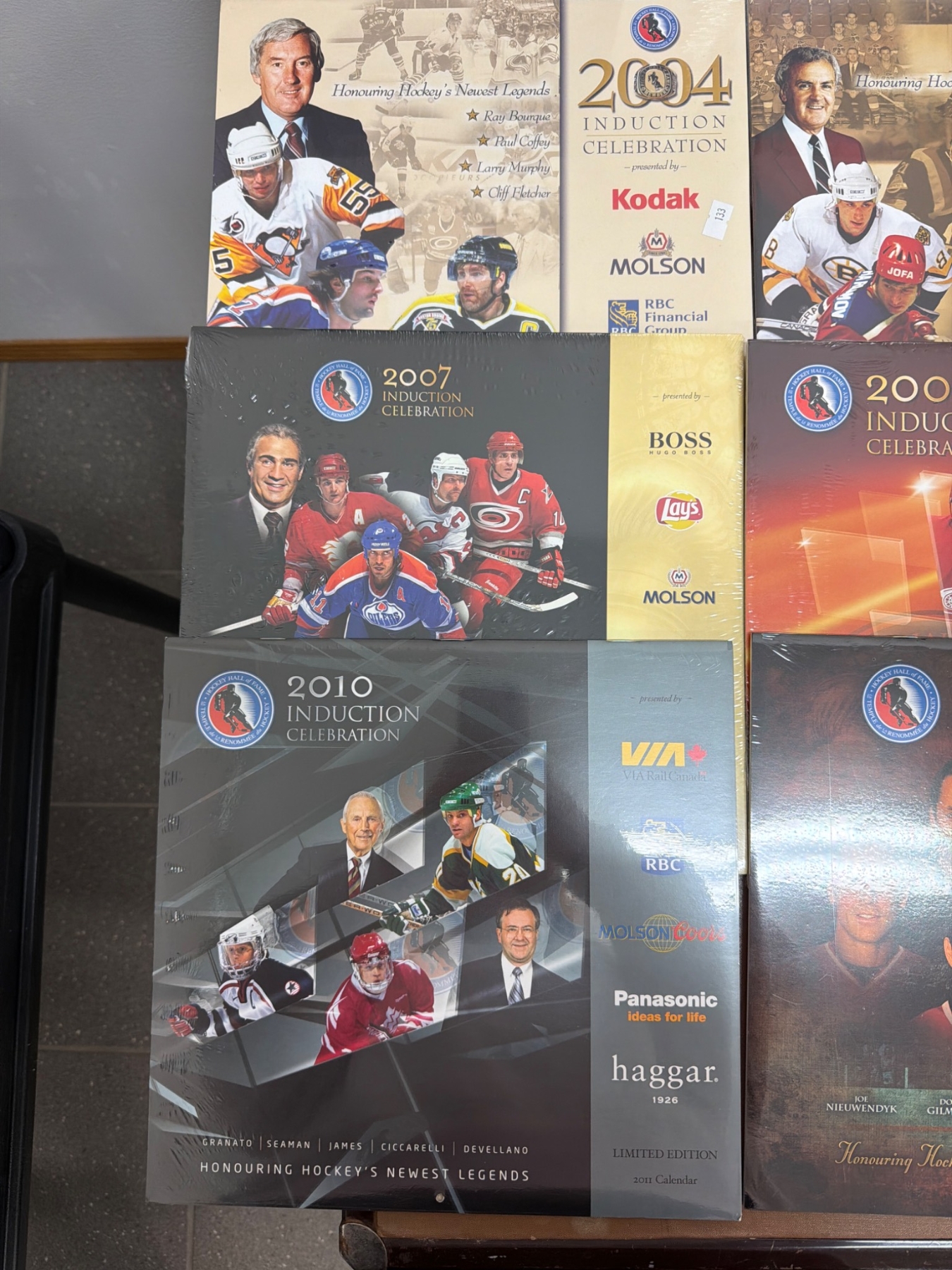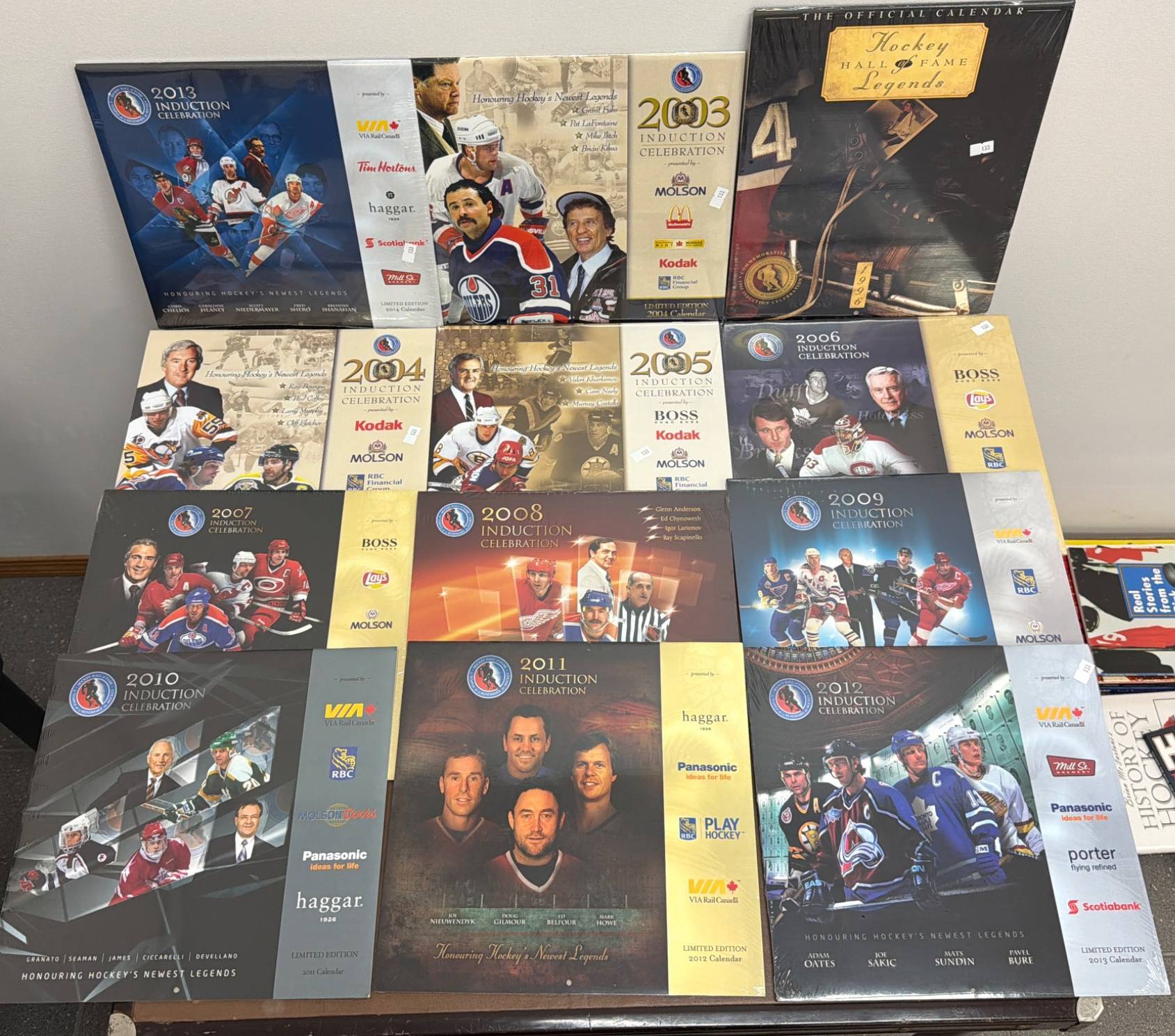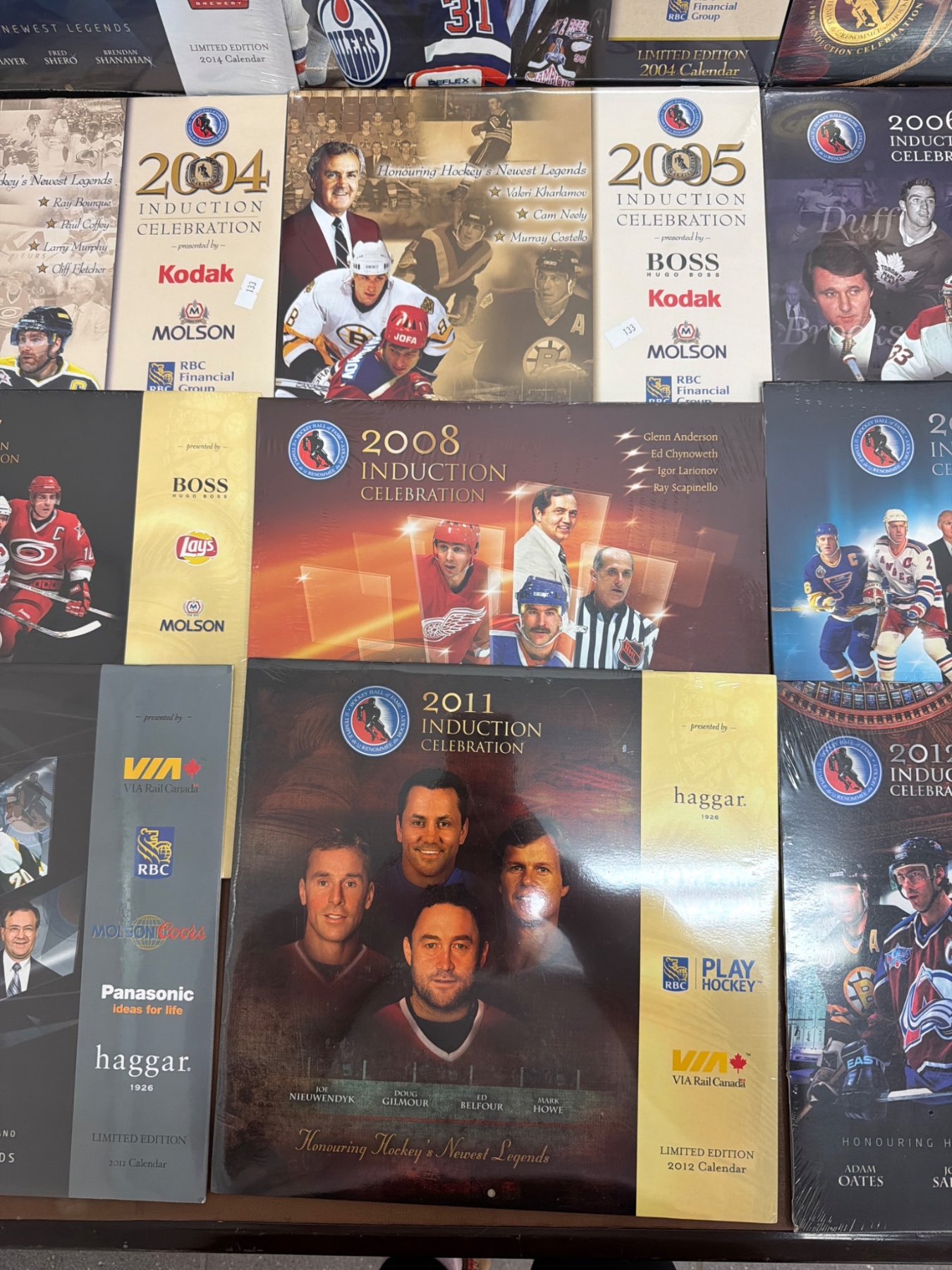 Hockey Hall of Fame Induction Celebration calendars spanning 2003 to 2013, featuring iconic hockey players, coaches, and contributors. Each calendar is branded with sponsors like Molson, Kodak, VIA Rail, and Scotiabank. Items appear to feature original wrap and imagery showcasing honorees. Includes notable titles such as 'Hockey Hall of Fame Legends'.