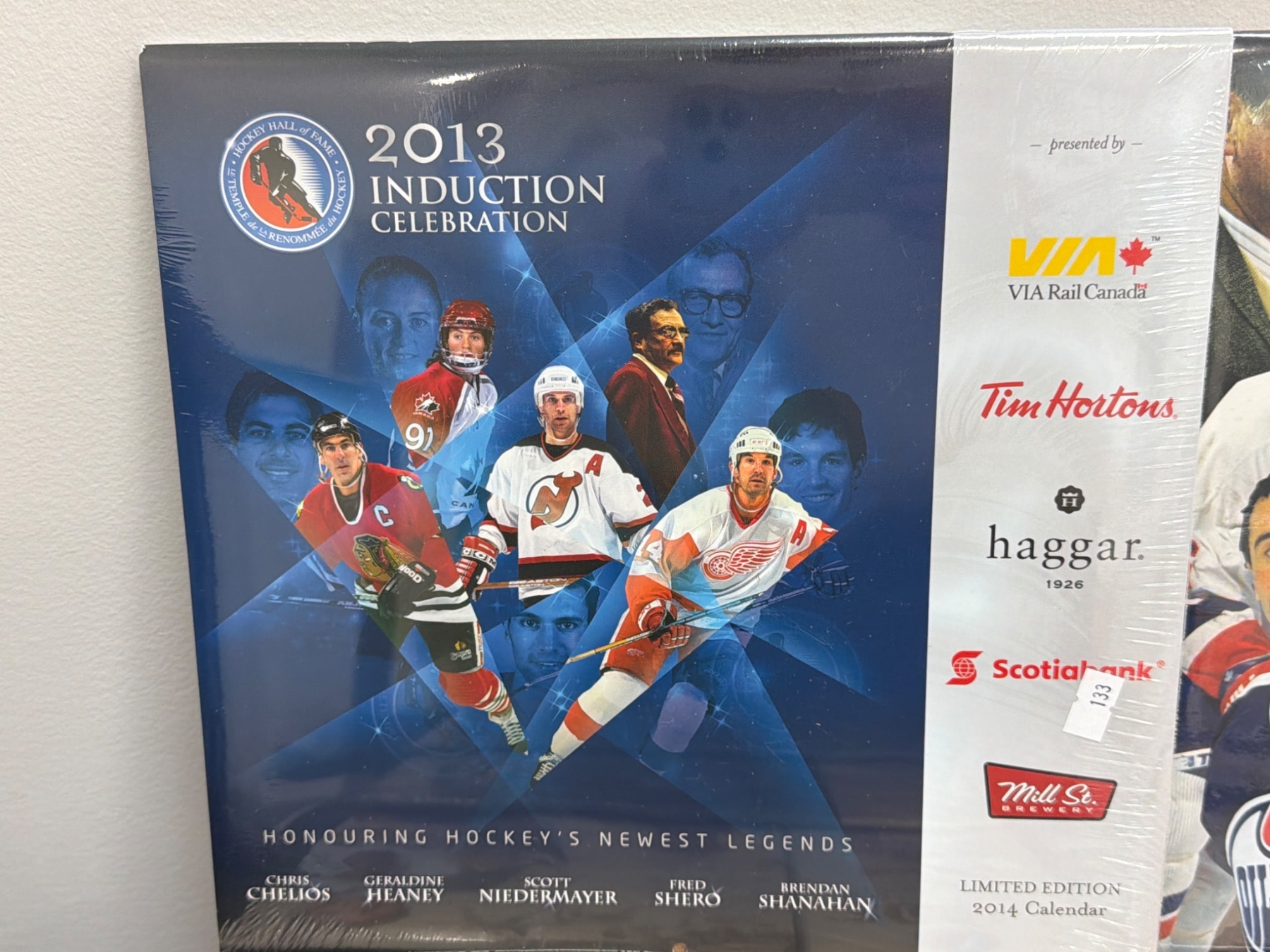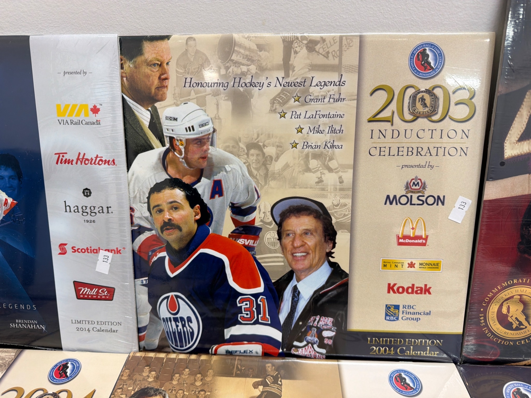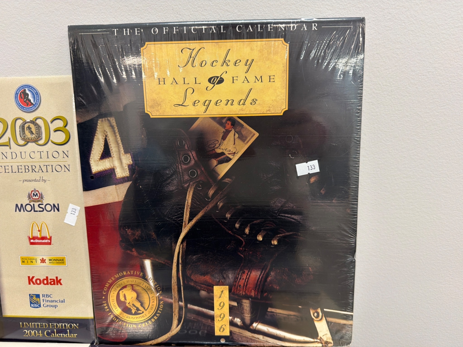 Hockey Hall of Fame Induction Celebration calendars spanning 2003 to 2013, featuring iconic hockey players, coaches, and contributors. Each calendar is branded with sponsors like Molson, Kodak, VIA Rail, and Scotiabank. Items appear to feature original wrap and imagery showcasing honorees. Includes notable titles such as 'Hockey Hall of Fame Legends'.