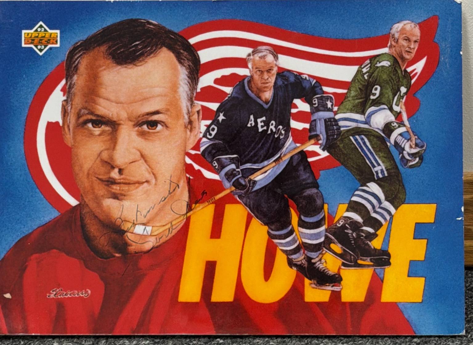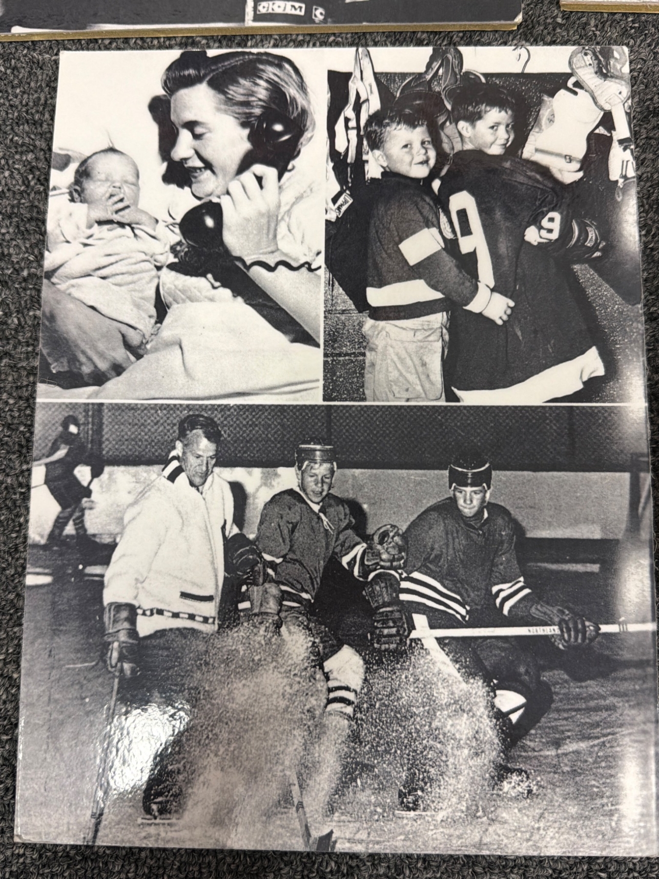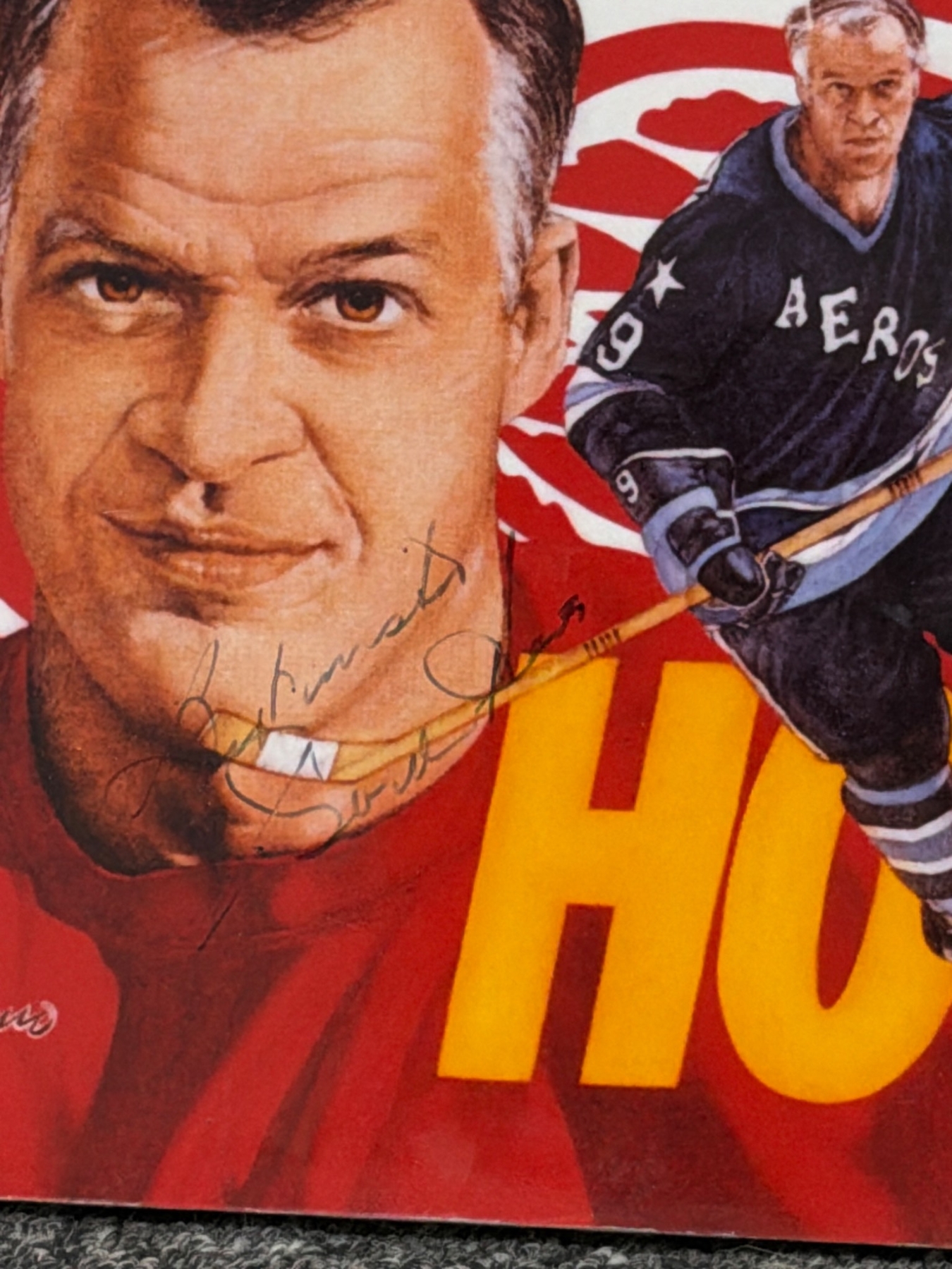 High-quality prints, including black-and-white and color photographs, highlighting iconic hockey moments and players. Lot features images of Gordie Howe in action, team photos, and scenes from classic games. One color print includes a prominent Gordie Howe autograph. Items are mounted on board and in overall good condition, ready to display.