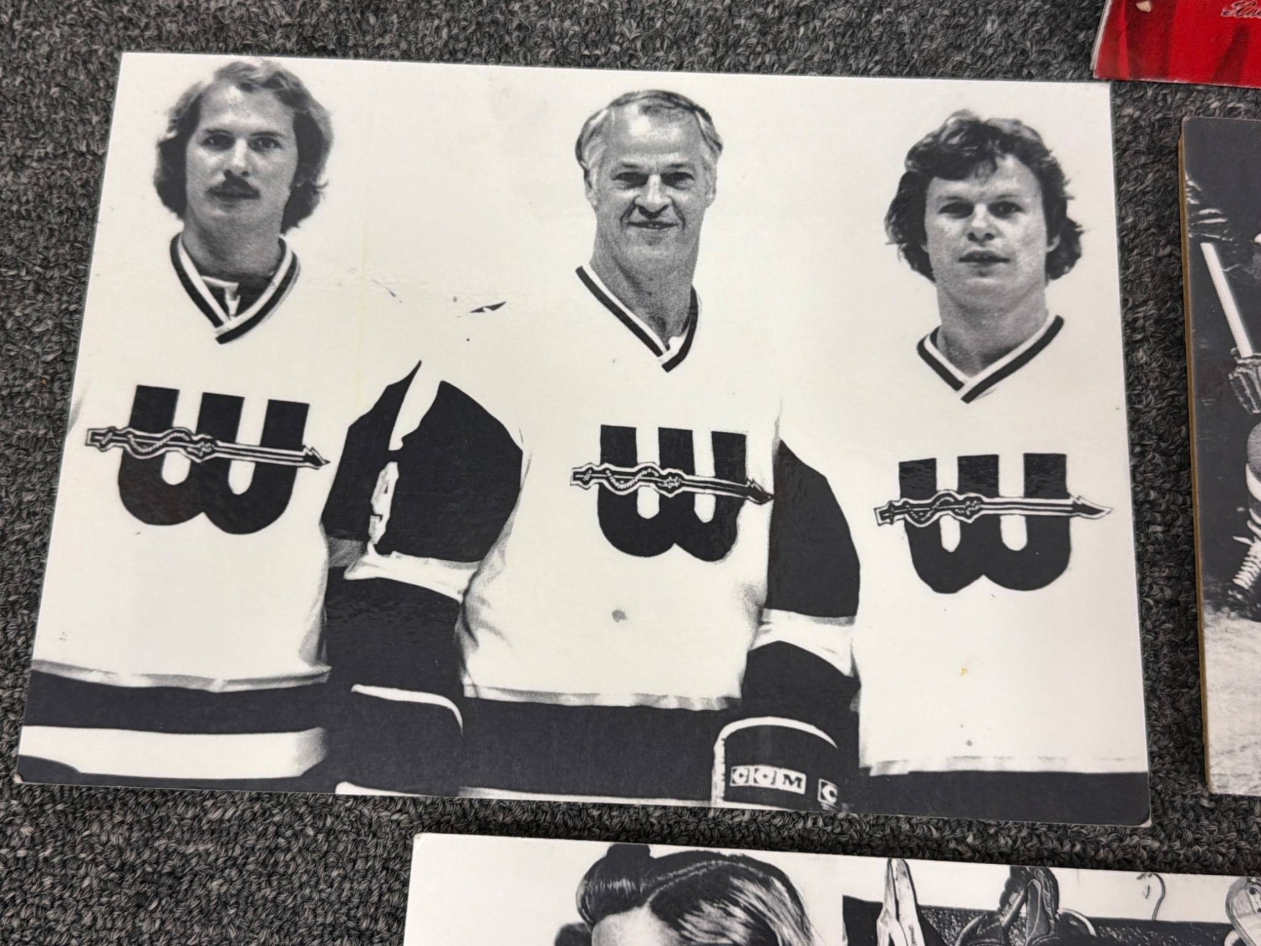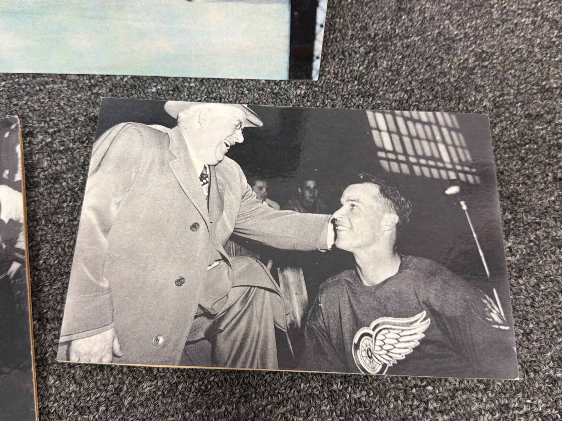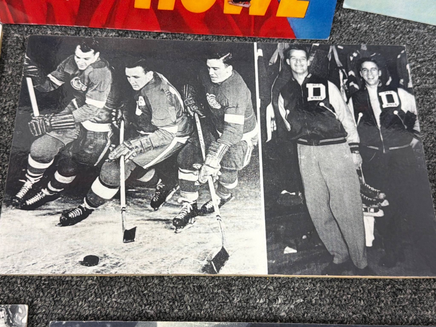 High-quality prints, including black-and-white and color photographs, highlighting iconic hockey moments and players. Lot features images of Gordie Howe in action, team photos, and scenes from classic games. One color print includes a prominent Gordie Howe autograph. Items are mounted on board and in overall good condition, ready to display.