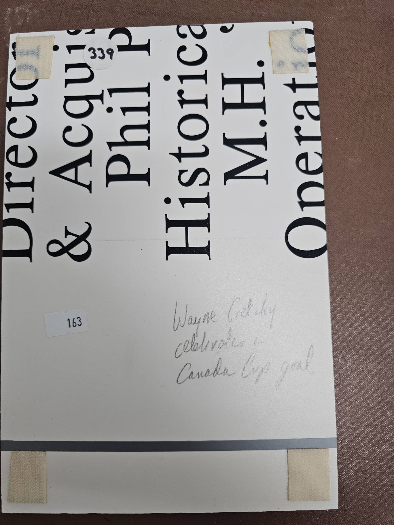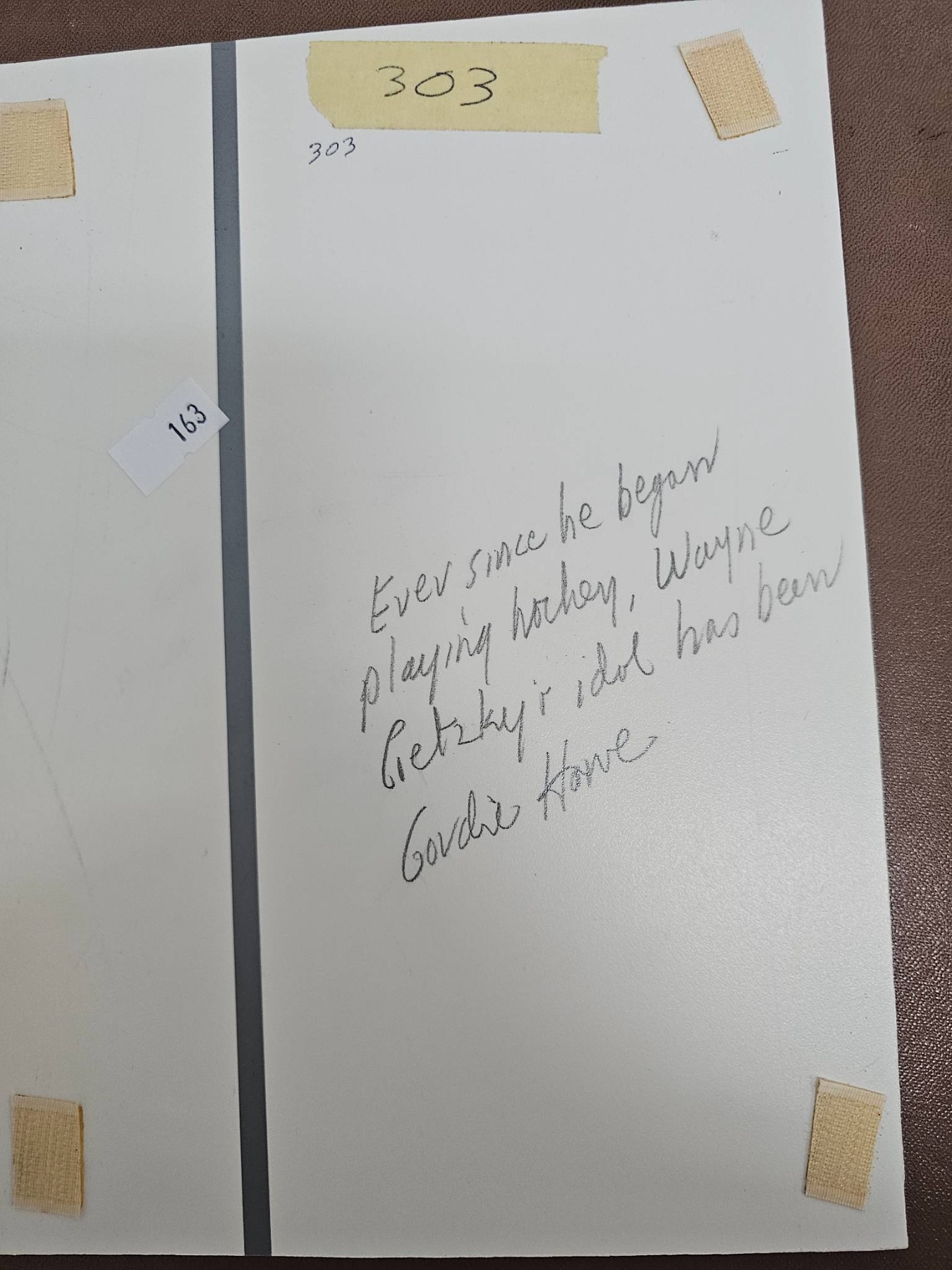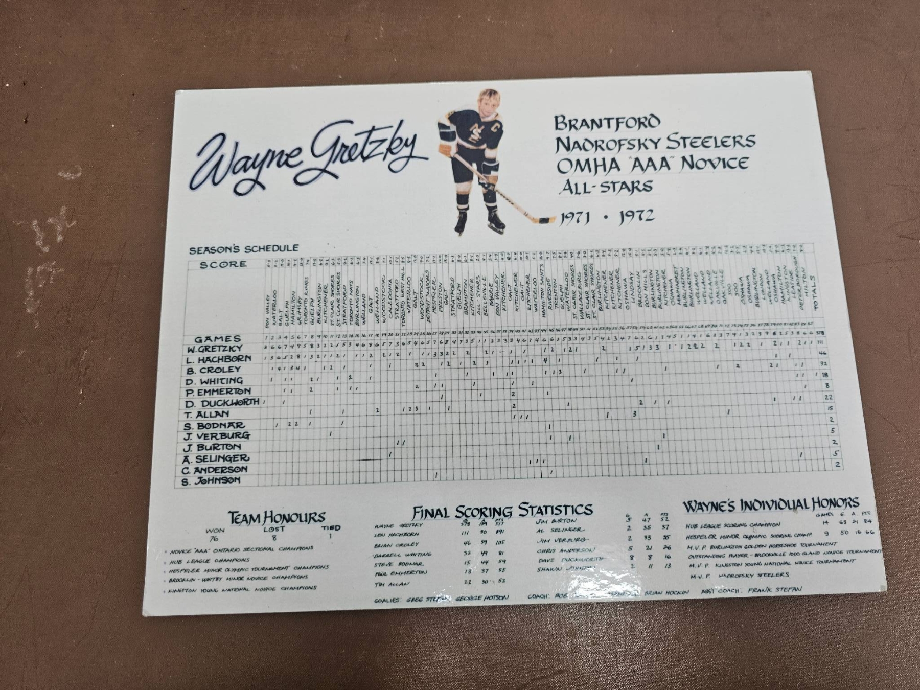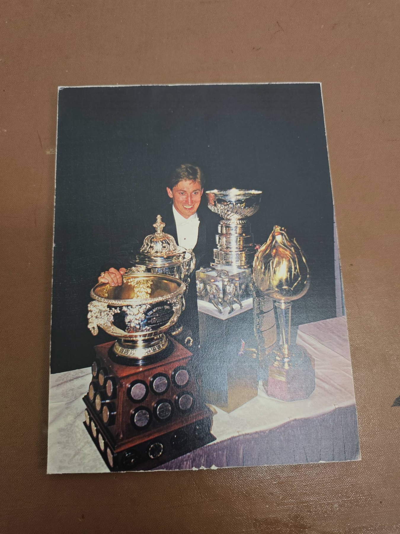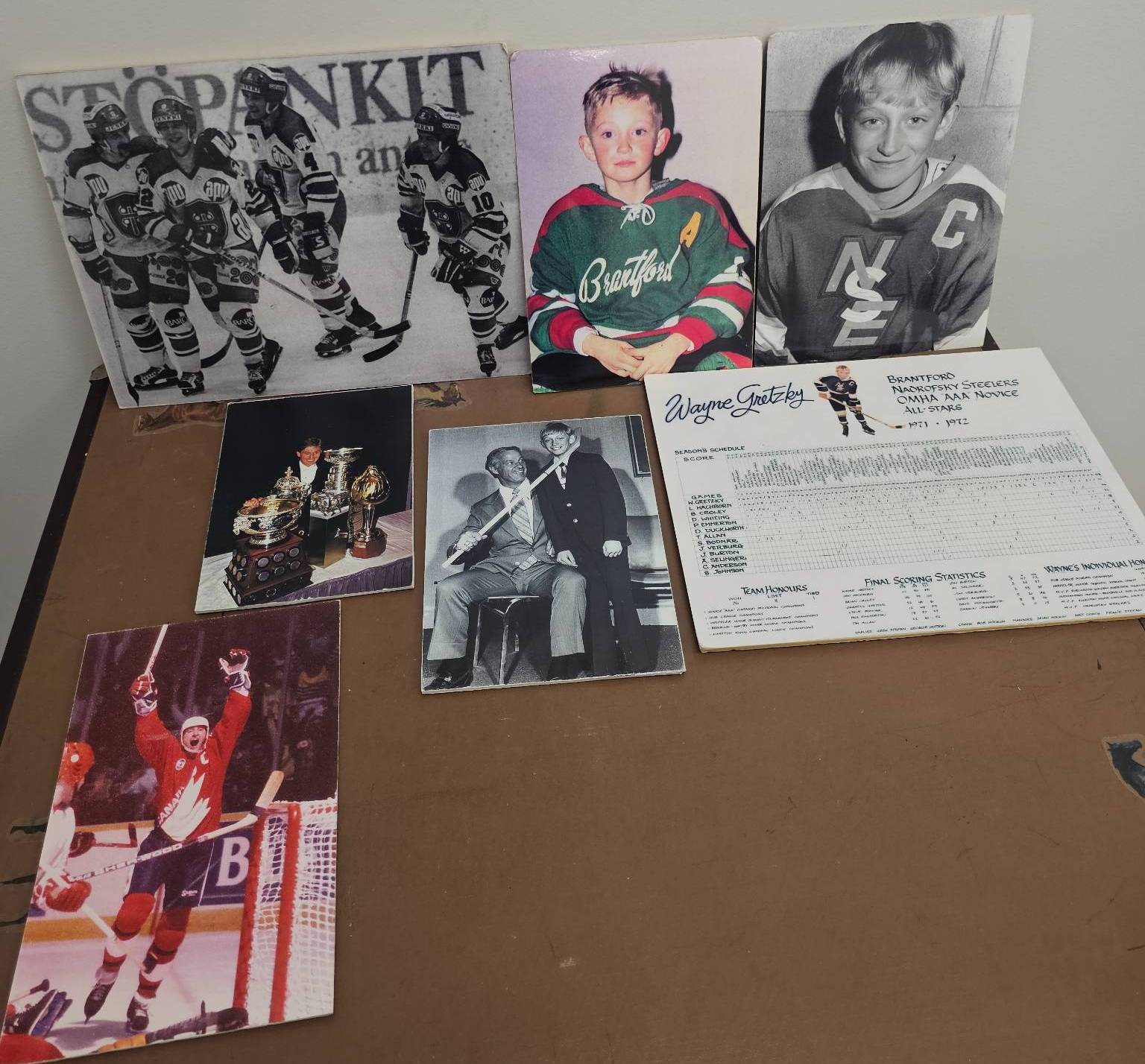 Hockey memorabilia featuring various photographs of Wayne Gretzky from his youth and early career. Includes images of his early days as a young player, team pictures, trophy achievements, and a career statistics card. Some annotations on the back of certain pieces detail milestones or notes about his career. A compelling set for any hockey enthusiast or Wayne Gretzky fan.