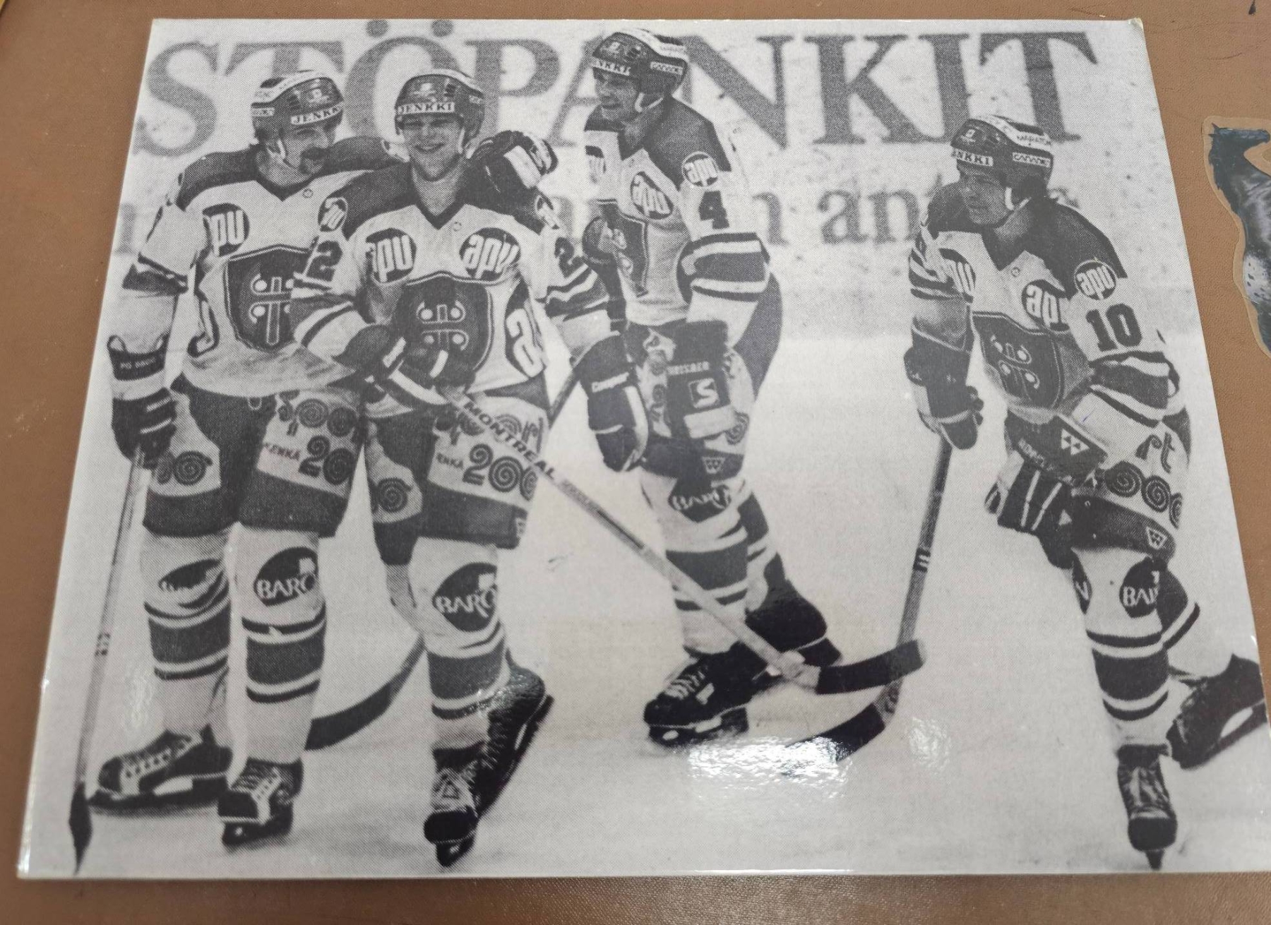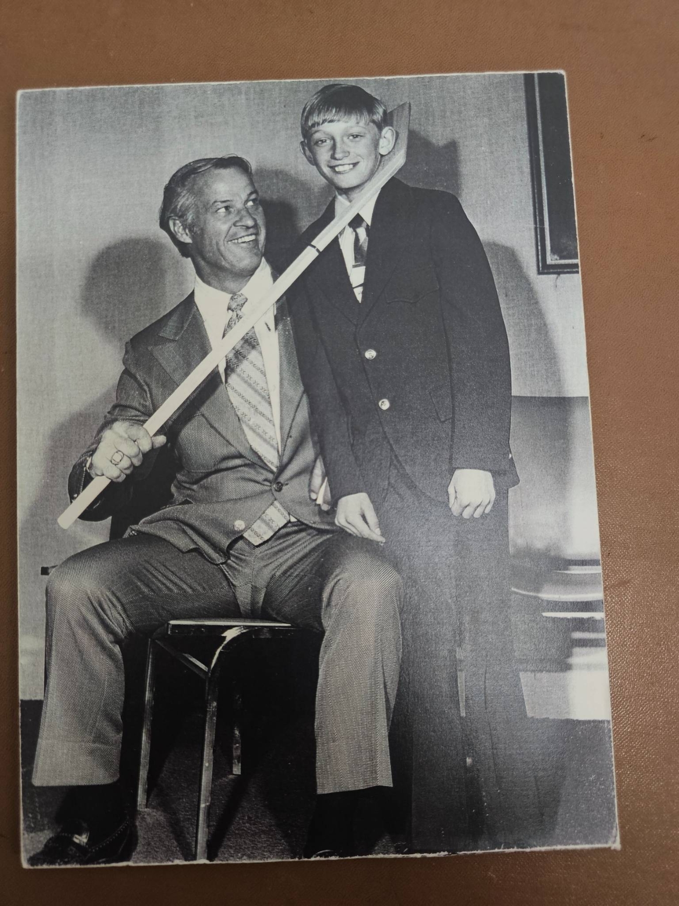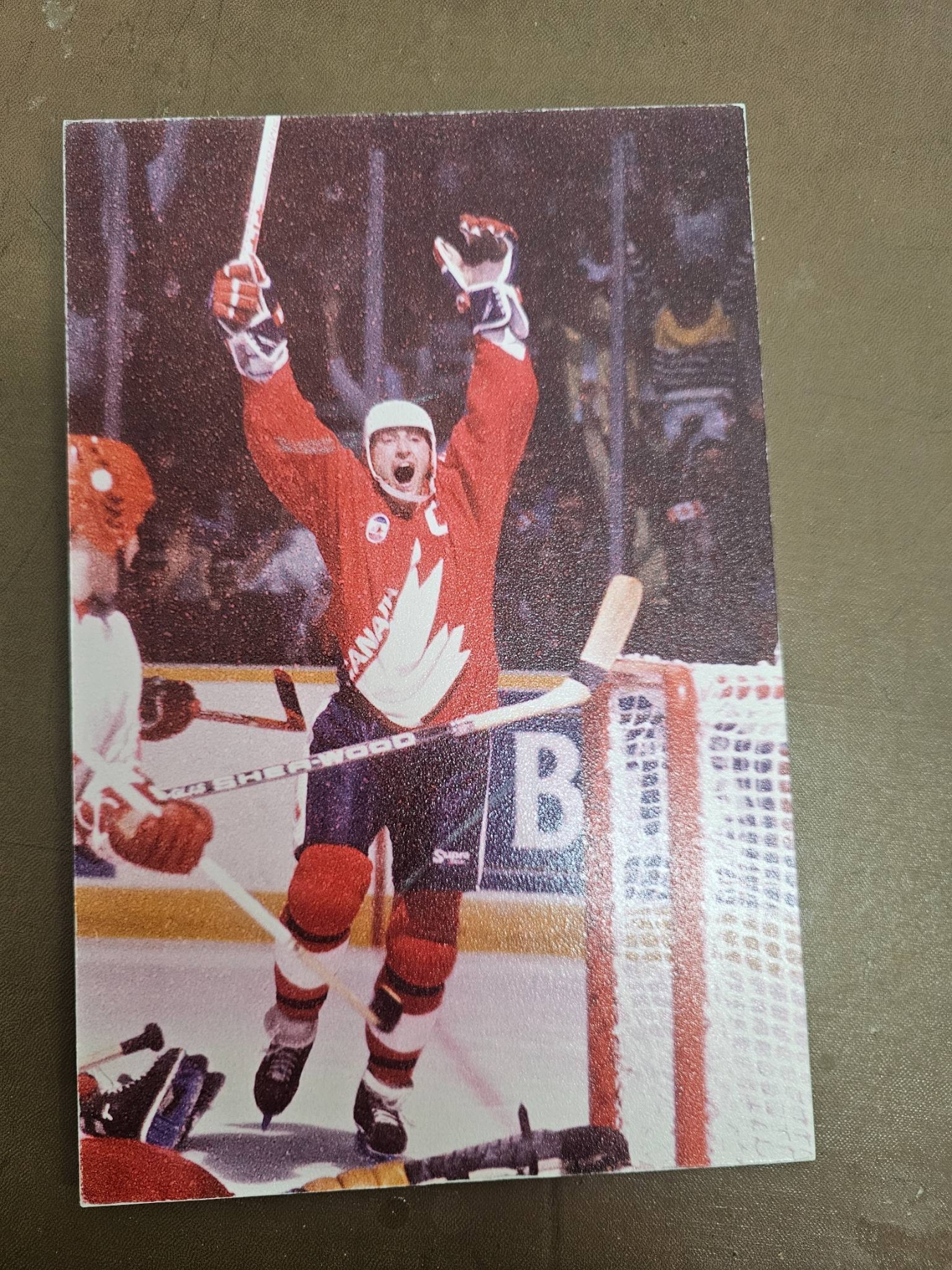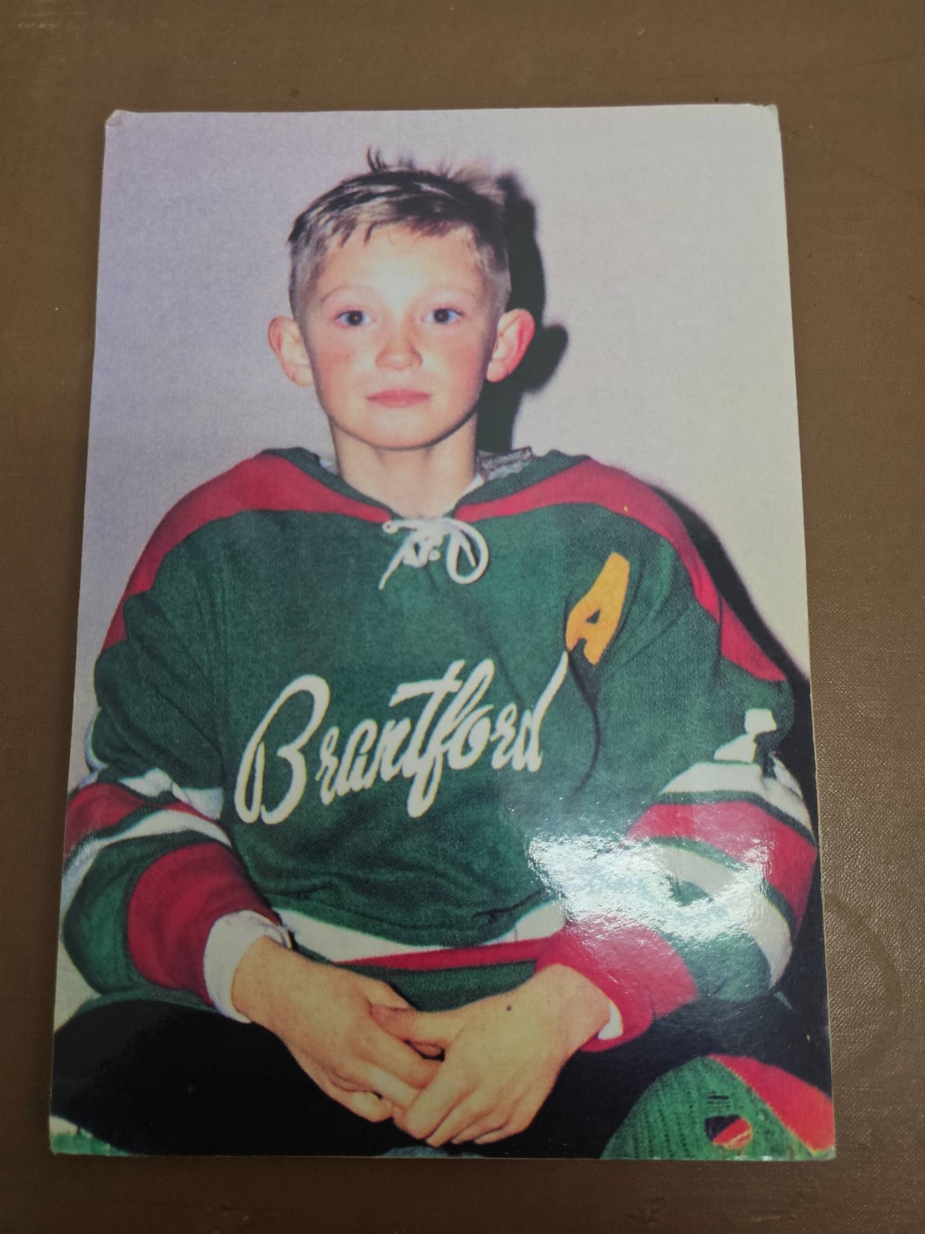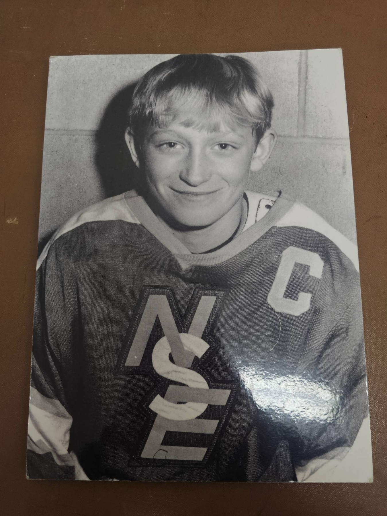 Hockey memorabilia featuring various photographs of Wayne Gretzky from his youth and early career. Includes images of his early days as a young player, team pictures, trophy achievements, and a career statistics card. Some annotations on the back of certain pieces detail milestones or notes about his career. A compelling set for any hockey enthusiast or Wayne Gretzky fan.