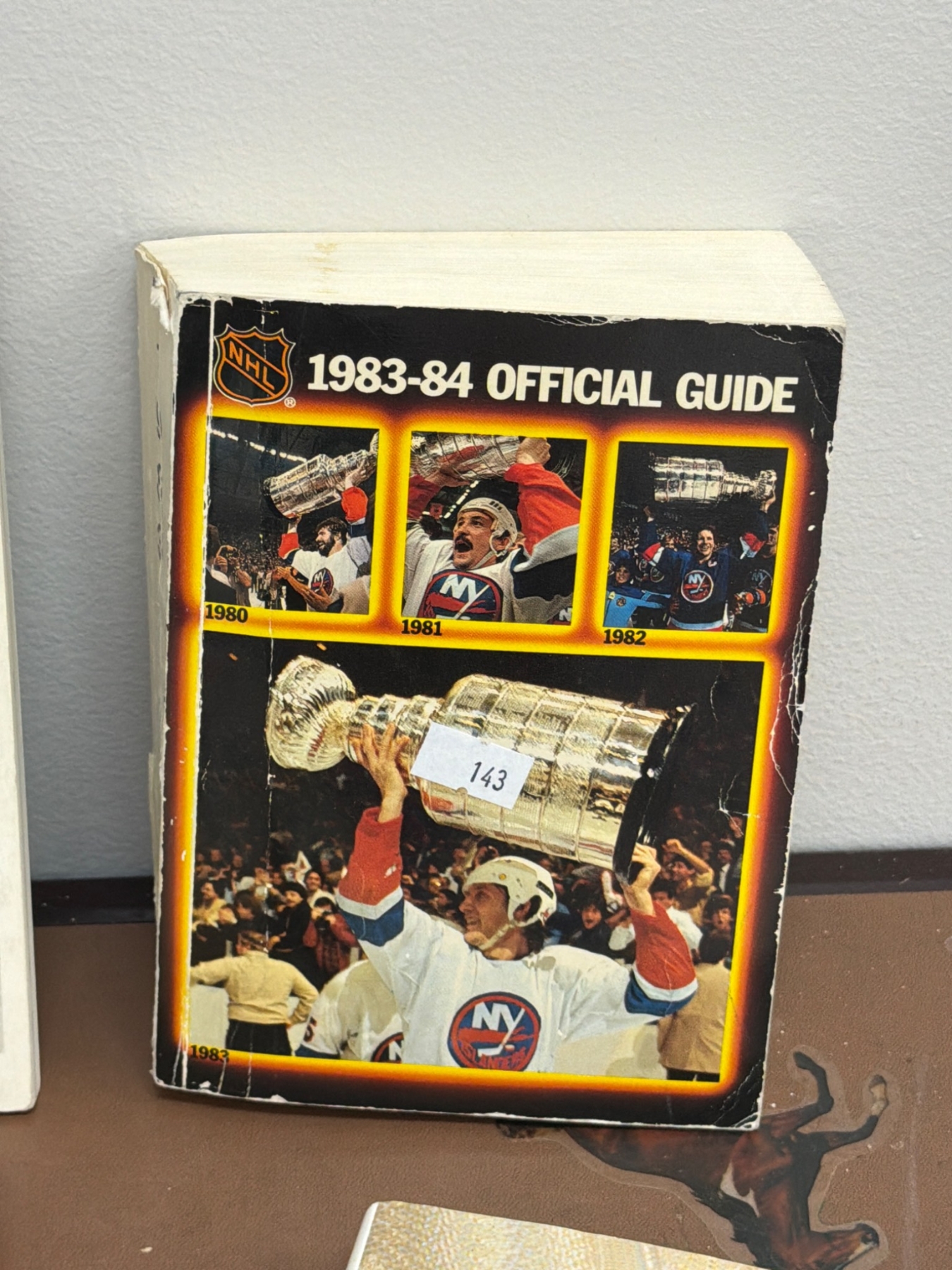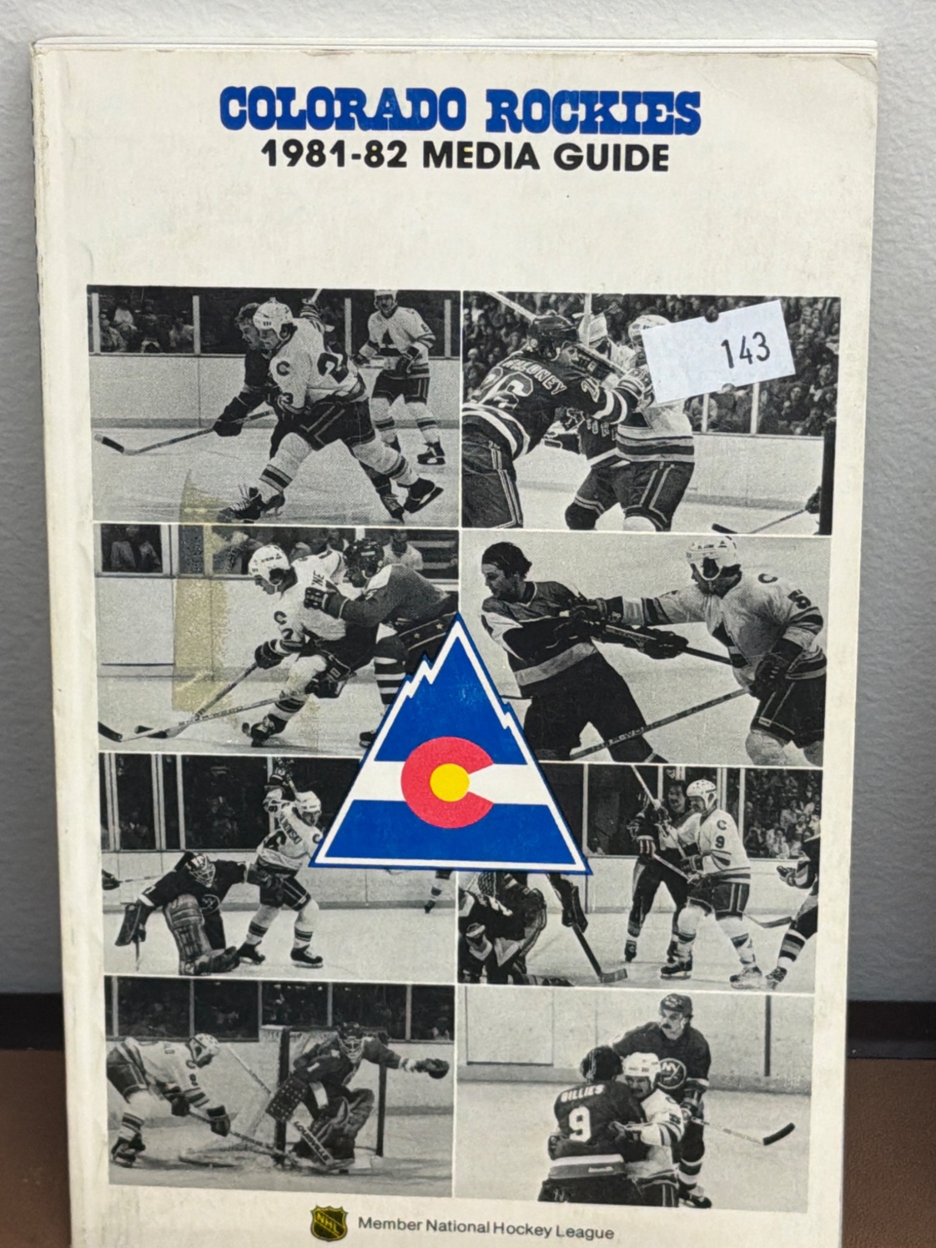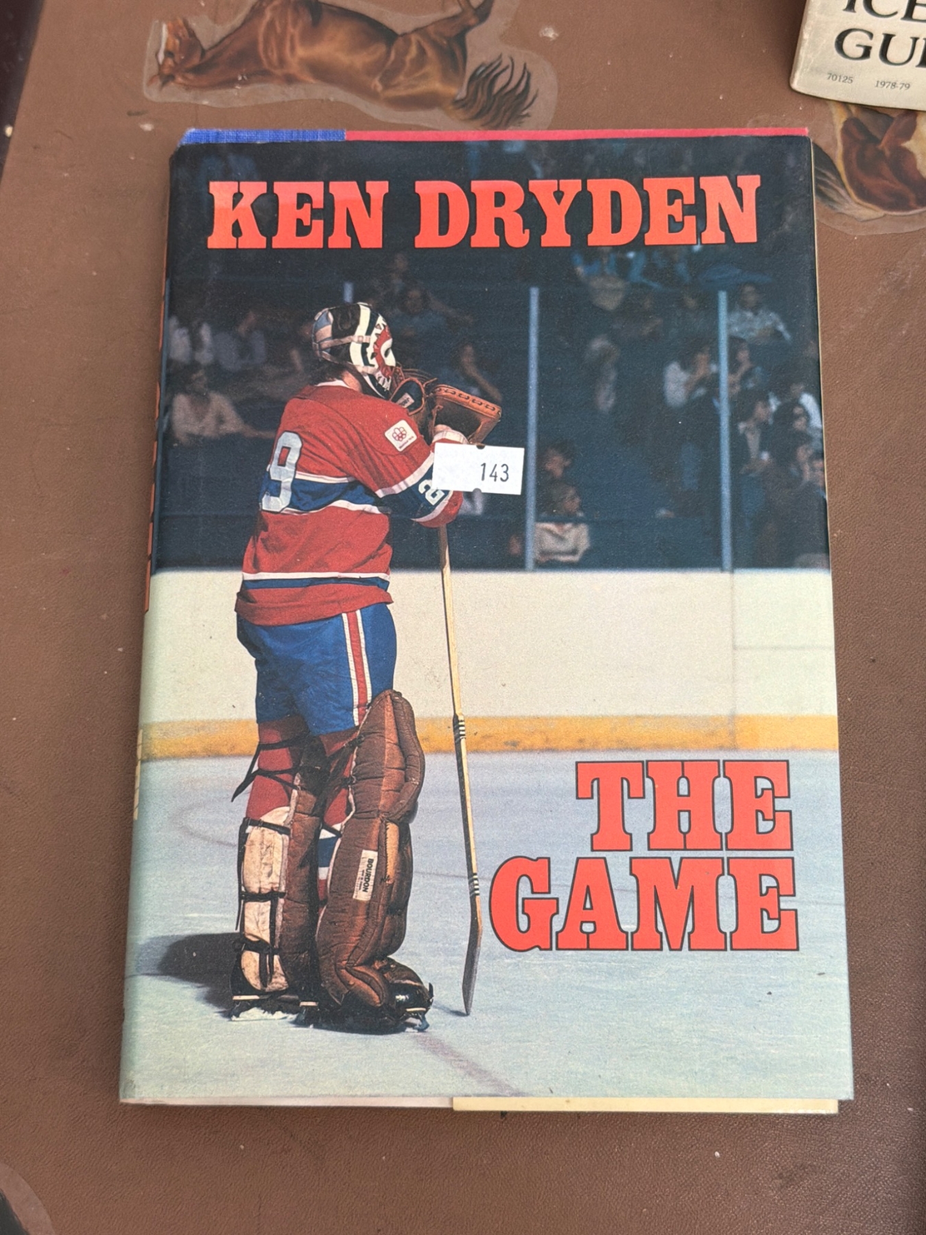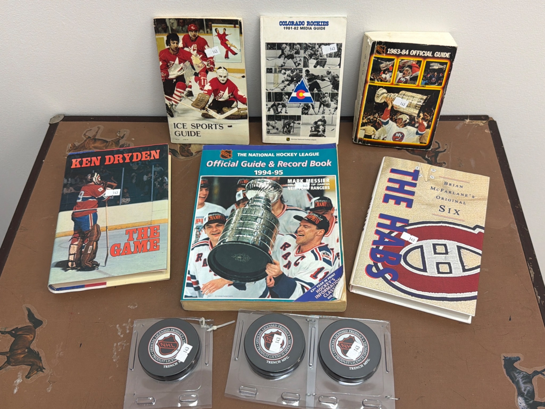 Various hockey memorabilia such as books and guides: Ken Dryden's 'The Game,' 'The Habs - Brian McFarlane's Original Six,' National Hockey League Official Guides (1983-84 and 1994-95), 'Colorado Rockies 1981-82 Media Guide,' 'Ice Sports Guide 1978-79,' and three official NHL pucks featuring Arizona Coyotes branding. Items vary in condition with some wear present due to age.